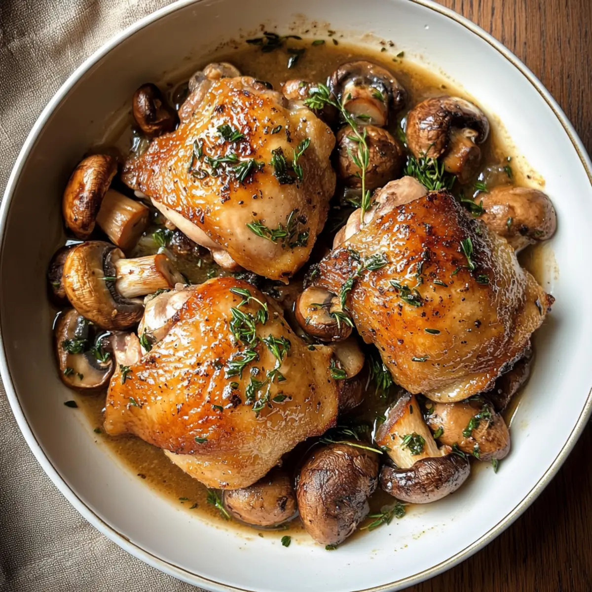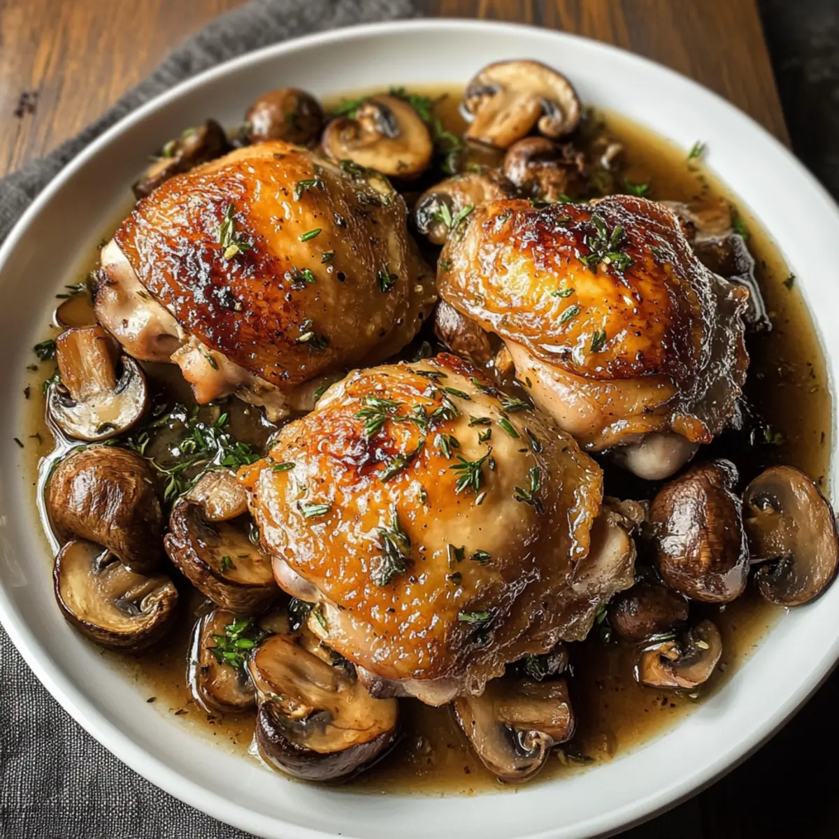 Die kühle Abendluft lädt geradezu dazu ein, etwas Warmes und Herzhaftes zu zaubern. Bei der Zubereitung meiner saftigen Hähnchenschenkel mit Pilzen füllt sich meine Küche mit einem verführerischen Aroma von frisch gebratenem Hähnchen und würzigen Champignons. Dieses Rezept ist nicht nur ein wahres Komfortessen, es vereint auch ein schnelles, unkompliziertes Kochvergnügen, ideal für hektische Wochentage oder gemütliche Wochenenddinner. Die knusprige Haut der Hähnchenschenkel kontrastiert perfekt mit den sämigen Pilzen in einer reichen, garlicky Sauce. Das Beste daran? Es lässt sich ganz nach Deinem Geschmack anpassen! Hast Du schon Lust auf einen ersten Biss? Warum wirst du dieses Rezept lieben? Köstlicher Geschmack: Die Kombination aus saftigen Hähnchenschenkeln und erdigen Pilzen schafft ein vollmundiges Geschmackserlebnis, das jeden Gaumen erfreut. Einfache Zubereitung: Mit minimalem Aufwand zauberst du ein Gericht, das in einer einzigen Pfanne zubereitet wird – perfekt für stressige Abende! Vielfältige Optionen: Du kannst die Hähnchenschenkel ganz nach deinem Geschmack variieren, sei es mit anderen Pilzsorten oder verschiedenen Beilagen wie cremigem Kartoffelpüree. Wohlfühlfaktor: Der köstliche Duft, der beim Kochen durch deine Küche zieht, sorgt garantiert für Gemütlichkeit und lädt Familie und Freunde zum gemeinsamen Essen ein. Budgetfreundlich: Diese Zutaten sind leicht erhältlich und schonen deinen Geldbeutel, ohne dabei Kompromisse bei Geschmack und Qualität einzugehen. Saftige Hähnchenschenkel mit Pilzen Zutaten Für die Hähnchenkeulen Hähnchenschenkel – Sie bilden die Hauptproteinquelle und sorgen für saftigen Genuss; du kannst sie auch durch Drumsticks ersetzen. Butter – Macht die Sauce reichhaltig; du kannst auch pflanzliche Butter für eine vegane Variante verwenden. Für die Sauce Zwiebel – Verleiht Süße und Komplexität; für einen milderen Geschmack kannst du auch Schalotten verwenden. Knoblauch – Wichtig für den Geschmack; je nach Vorliebe kannst du die Menge variieren. Hühnerbrühe – Ist die Basis der Sauce; für eine leichtere Option eignet sich Gemüsebrühe. Sojasauce – Fügt umami Tiefe hinzu; ersetzbar durch Worcestershiresauce oder Kokosaminos. Für die Pilze Champignons – Fügen erdige Noten hinzu und nehmen die köstliche Sauce auf; Shiitake oder Portobello sind ebenfalls gute Alternativen. Optionale Zutaten Frische Kräuter – Petersilie, Thymian oder Rosmarin bringen zusätzliche Frische; sie können zum Garnieren verwendet werden. Mit diesen Zutaten zauberst du deine saftigen Hähnchenschenkel mit Pilzen, ein Gericht, das nicht nur köstlich, sondern auch sehr anpassungsfähig ist! Schritt-für-Schritt-Anleitung für Saftige Hähnchenschenkel mit Pilzen Step 1: Hähnchenschenkel anbraten Erhitze eine große gusseiserne Pfanne bei mittlerer bis hoher Hitze und füge die Butter hinzu. Sear die Hähnchenschenkel für etwa 6-7 Minuten auf jeder Seite, bis sie goldbraun und knusprig sind. Die Haut sollte schön kross sein. Nimm die Hähnchenschenkel aus der Pfanne und lege sie auf einen Teller. Step 2: Aromaten anbraten Gib die Zwiebel und den Knoblauch in die gleiche Pfanne und brate sie für etwa 3-4 Minuten, bis die Zwiebel weich und glasig ist. Achte darauf, dass der Knoblauch nicht verbrennt, da er sonst bitter wird. Damit entsteht eine leckere Basis für die sämige Sauce. Step 3: Pilze sautieren Füge die Champignons zu den anbraten Zwiebeln und dem Knoblauch hinzu und koche sie für etwa 5-6 Minuten, bis sie goldbraun und leicht karamellisiert sind. Rühr die Pilze gelegentlich um, damit sie gleichmäßig bräunen und den Geschmack der anderen Zutaten aufnehmen. Step 4: Brühe und Sauce hinzufügen Gieße die Hühnerbrühe und die Sojasauce in die Pfanne und rühre alles gut um, um die Aromen zu verbinden. Die Flüssigkeit wird die Basis deiner reichhaltigen Sauce bilden und die Knusprigkeit der Hähnchenschenkel wunderbar ergänzen. Step 5: Hähnchenschenkel schmoren Lege die angebratenen Hähnchenschenkel zurück in die Pfanne und decke sie mit einem Deckel ab. Lass sie für 10-12 Minuten köcheln, bis die Kerntemperatur mindestens 75 °C erreicht und das Fleisch zart ist. Die Hähnchenschenkel sollten nun saftig und geschmackvoll sein. Step 6: Servieren Nimm die Pfanne vom Herd und richte die Hähnchenschenkel zusammen mit der köstlichen Sauce auf einem Tellern an. Du kannst das Gericht optional mit frischen Kräutern wie Petersilie garnieren. Genieße deine saftigen Hähnchenschenkel mit Pilzen mit einem Beilagen wie cremigem Kartoffelpüree oder frischem Brot. Lagerungstipps für Saftige Hähnchenschenkel mit Pilzen Zimmertemperatur:: Dieses Gericht sollte nicht länger als 2 Stunden bei Zimmertemperatur gelagert werden, um die Lebensmittelsicherheit zu gewährleisten. Kühlschrank:: Bewahre die Hähnchenschenkel in einem luftdichten Behälter für bis zu 3 Tage im Kühlschrank auf. So bleibt die Frische erhalten, und du kannst die Aromen genießen. Gefrierfach:: Du kannst die saftigen Hähnchenschenkel mit Pilzen bis zu 2 Monate einfrieren. Stelle sicher, dass sie gut in Gefrierbeuteln verpackt sind, um Gefrierbrand zu vermeiden. Aufwärmen:: Erhitze die Reste sanft in der Mikrowelle oder auf dem Herd, bis die Innentemperatur mindestens 75 °C erreicht. So bleibt das Hühnchen saftig und zart. Tipps zur Vorbereitung der Saftigen Hähnchenschenkel mit Pilzen für stressfreie Abende Die saftigen Hähnchenschenkel mit Pilzen sind perfekt für die Wochenvorbereitung, da du die Hähnchenschenkel bis zu 24 Stunden im Voraus marinieren kannst, um den Geschmack zu intensivieren. Einfach die Hähnchenschenkel mit einer Mischung aus Sojasauce, Knoblauch und Gewürzen in einem luftdichten Behälter aufbewahren. Die Pilze und Zwiebeln kannst du ebenfalls bis zu 3 Tage im Voraus schneiden und in einem separaten Behälter im Kühlschrank aufbewahren, um ihre Frische zu erhalten. Wenn es Zeit zum Kochen ist, ein