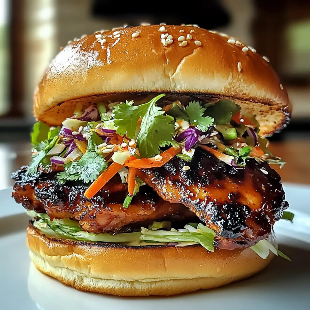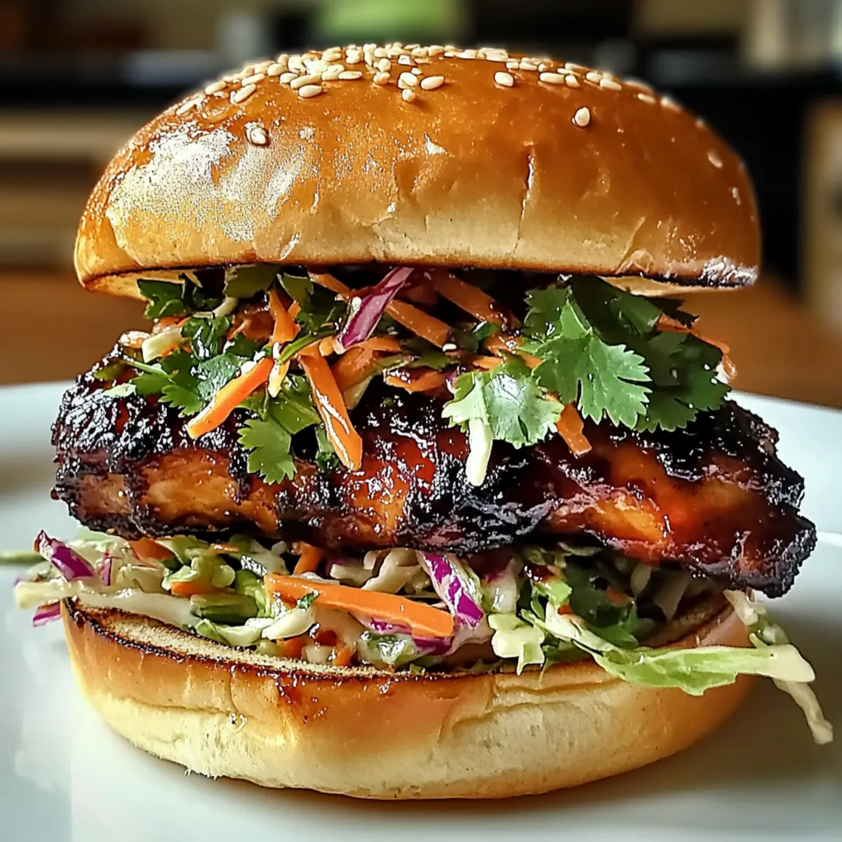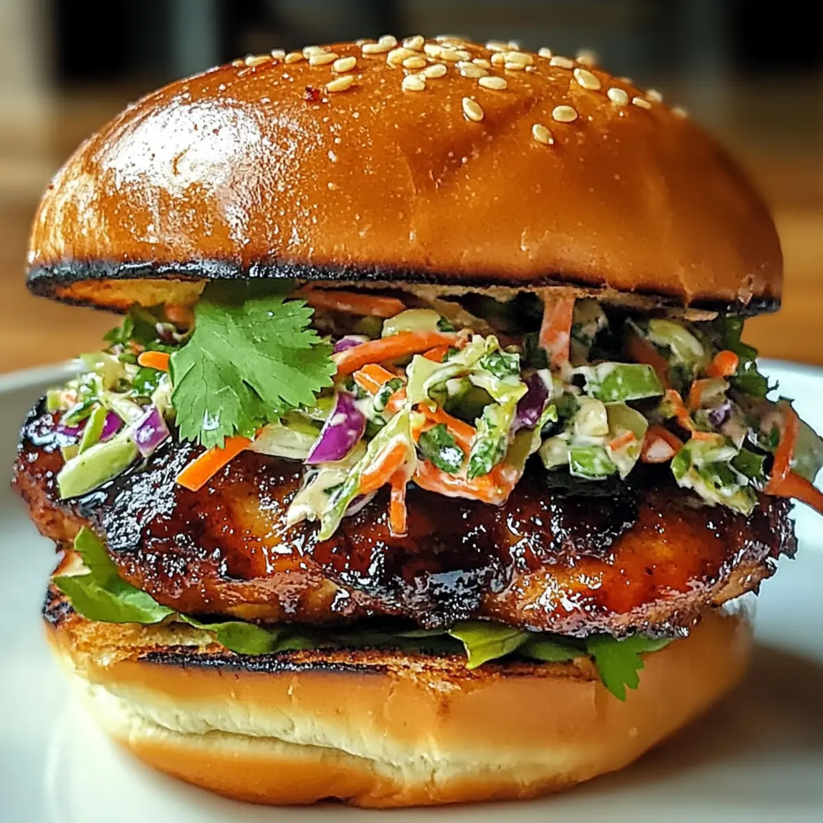 „Hast du schon jemals von den unwiderstehlichen Aromen Koreas gehört?“ Diese Frage hat mich direkt in die Küche gezogen, wo ich das scharfe koreanische BBQ-Hühnchen-Sandwich mit knusprigem Kraut zubereitet habe. Mit marinierten Hähnchenschenkeln, die auf den Punkt gegrillt sind, und einer knackigen Slaw, die jede Biss zu einem Fest der Texturen macht, wird dieses Rezept ganz schnell zu deinem neuen Favoriten. Die Zubereitung ist im Handumdrehen erledigt und perfekt für geschäftige Wochentage oder wenn Freunde zu Besuch sind – ein grandioser Moment für Genuss und Geselligkeit! Bereit, deinem Sandwich-Spiel einen aufregenden Twist zu verleihen? Lass uns gemeinsam die aufregende Welt der koreanischen Küche entdecken! Warum ist dieses Sandwich ein Muss? Geschmacksexplosion: Jedes Biss begeistert mit einer perfekten Kombination aus scharfer, marinierter Hähnchenbrust und knackigem, frischem Kraut. Schnell und unkompliziert: In nur wenigen Schritten zauberst du ein Gericht, das auch an hektischen Tagen nicht zu kurz kommt. Vielseitig anpassbar: Ob mit zusätzlichem Kimchi oder veganen Portobello-Pilzen – befreie deine Kreativität für ganz persönliche Variationen! Perfekt für Geselligkeit: Wow deine Gäste mit diesem Sandwich-Hit, das sich ideal für Partys und Zusammenkünfte eignet! Gesunde Alternativen: Nutze griechischen Joghurt statt Mayo für eine leichtere Version. Wenn du auf Gluten achtest, kannst du die Sojasauce einfach ersetzen. Bereit für einen Geschmackstrip? Schau dir auch mein anderes Rezept für leckeres asiatisches Hähnchen an! Scharfes koreanisches BBQ-Hühnchen-Sandwich mit Kraut: Zutaten • Der folgende Abschnitt gibt dir einen Überblick über die Zutaten, die du für dieses köstliche Sandwich benötigst. Für die Marinade Gochujang – bringt eine feurige Schärfe und Tiefe ins Gericht; alternativ kannst du Sriracha verwenden, wenn du es milder magst. Sojasauce – sorgt für einen umami-reichen Geschmack; nutze Kokosaminos als glutenfreie Alternative. Honig – bringt eine süße Note, die die Schärfe ausgleicht; du kannst auch Ahornsirup oder Agavendicksaft anstelle von Honig verwenden. Sesamöl – verstärkt das nussige Aroma; Olivenöl kann dafür als Ersatz dienen. Knoblauch (gehackt) – sorgt für ein aromatisches Geschmackserlebnis; frischer oder auch Pulverknochen sind ebenfalls geeignet. Ingwer (gerieben) – verleiht dem Gericht eine wärmende Note; gemahlener Ingwer ist eine passende Alternative. Reisessig – sorgt für die nötige Säure und Frische; du kannst auch Apfelessig verwenden, wenn benötigt. Schwarzer Pfeffer – hebt das Aroma insgesamt; keine direkten Ersatzoptionen notwendig. Für die Slaw Grüne Kohl – sorgt für den crunchy Biss im Kraut; rote Kohl kann für mehr Farbe oder Geschmack verwendet werden, falls gewünscht. Karotten (in Julienne geschnitten) – sorgen für Süße und eine lebendige Farbe im Slaw. Mayonnaise – verbindet das Kraut und gibt Cremigkeit; griechischer Joghurt ist eine gesündere Variante. Limettensaft – bringt Frische in die Slaw; Zitronensaft kann auch anstelle von Limettensaft verwendet werden. Zusätzliche Zutaten Sriracha (optional) – für zusätzlichen Schärfe in der Slaw-Dressing. Frischer Koriander – frisch und aromatisch als Garnitur. Sesamkörner – fügen Textur und nussigen Geschmack zum Sandwich hinzu. Brioche Burger Brötchen – die weiche Grundlage des Sandwiches; andere hochwertige Brötchen können ebenfalls verwendet werden. Schritt-für-Schritt-Anleitung für Scharfes koreanisches BBQ-Hühnchen-Sandwich mit knusprigem Kraut-Glück Step 1: Marinade vorbereiten Beginne damit, in einer großen Schüssel Gochujang, Sojasauce, Honig, Sesamöl, Knoblauch, Ingwer, Reisessig und schwarzen Pfeffer zusammen zu vermischen. Rühre alles gründlich mit einem Schneebesen um, bis die Marinade homogen und glatt ist. Dieser aromatische Mix verleiht deinem scharfen koreanischen BBQ-Hühnchen-Sandwich mit knusprigem Kraut-Glück den ultimativen Geschmack. Step 2: Hühnchen marinieren Lege die Hähnchenschenkel in die Schüssel mit der Marinade und sorge dafür, dass sie gleichmäßig bedeckt sind. Decke die Schüssel ab und stelle sie für mindestens 1 Stunde oder idealerweise über Nacht in den Kühlschrank. Das Marinieren intensiviert die Aromen und sorgt dafür, dass das Hühnchen beim Grillen zart und saftig bleibt. Step 3: Slaw zubereiten Während das Hühnchen mariniert, bereite die Slaw vor. In einer großen Schüssel kombinierst du den gewürfelten grünen Kohl und die julienned Karotten. In einer separaten kleinen Schüssel vermischst du Mayonnaise, Limettensaft und optional Sriracha. Mische die beiden Mischungen gut und gib die Dressing-Mischung über das Gemüse, bis alles gleichmäßig bedeckt ist. Step 4: Hühnchen grillen Heize einen Grillpfanne bei mittlerer Hitze vor. Lege die marinierten Hähnchenschenkel in die Pfanne und grille sie für etwa 6-7 Minuten auf jeder Seite, bis sie eine schöne, goldene Grillmarkierung haben und eine Kerntemperatur von 75°C (165°F) erreicht ist. Achte darauf, dass das Hühnchen gut durchgegart ist, damit es saftig bleibt. Step 5: Hühnchen ruhen lassen Nehme das grillierte Hühnchen aus der Pfanne und lasse es für etwa 5 Minuten ruhen. Dies hilft, die Säfte zu bewahren, sodass das Hühnchen beim Aufschneiden schön saftig bleibt. In der Zwischenzeit kannst du bereits die Brötchen vorbereiten für dein scharfes koreanisches BBQ-Hühnchen-Sandwich. Step 6: Brötchen toasten Nehme die Brioche-Brötchen und lege sie mit der Schnittfläche nach unten in die heiße Grillpfanne. Röste sie leicht an, bis sie goldbraun und leicht knusprig sind. Dies sorgt dafür, dass das Brot stabil bleibt und nicht durch die feuchten Zutaten matschig wird; perfekt für dein Sandwich! Step 7: Sandwich zusammenstellen Auf dem unteren Teil jedes Brötchens platzierst du großzügig ein Stück des gegrillten Hühnchens. Darauf kommt eine ordentliche Port