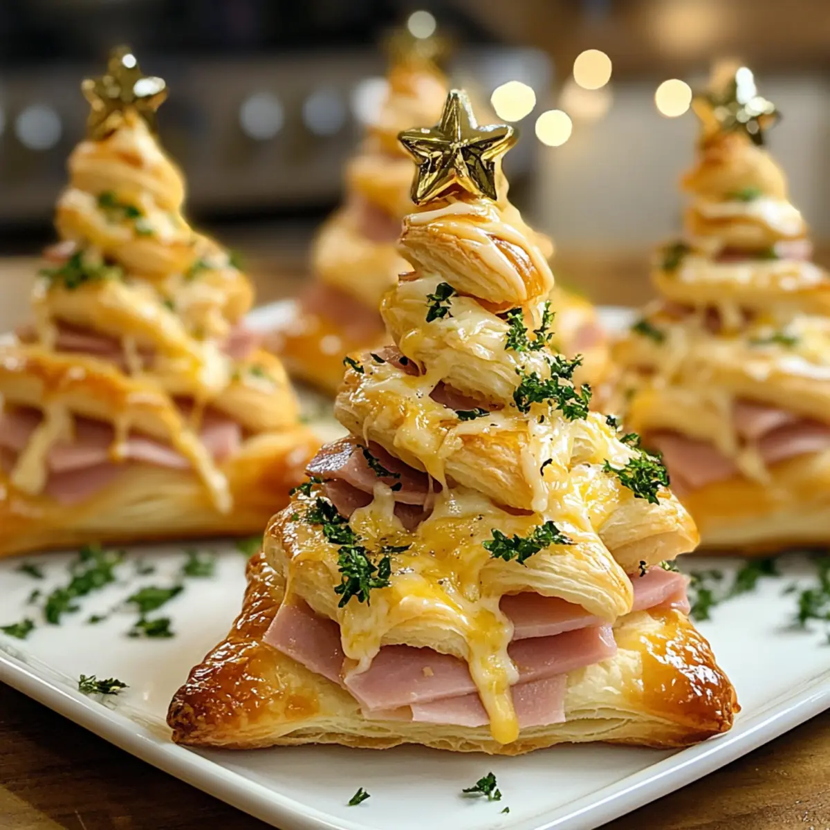 Die Vorfreude auf die festlichen Feiern liegt in der Luft und ich kann kaum an mich halten! Wenn ich an eine gesellige Zusammenkunft denke, kommen mir sofort die bezaubernden Schinken-und-Käse-Teigweihnachtsbäume in den Sinn. Diese hübschen Leckerbissen aus zartem Blätterteig, gefüllt mit schmelzendem Käse und herzhaftem Schinken, sind nicht nur unglaublich einfach zuzubereiten, sondern auch der absolute Hingucker auf jedem Buffet. In nur wenigen Minuten verwandeln sie sich in eine köstliche Party-Sensation, die Ihre Gäste begeistern wird. Und wenn Sie eine vegetarische Variante ausprobieren möchten, ist es ganz leicht, den Schinken durch Putenbrust oder ein würziges Mus zu ersetzen. Neugierig, wie diese tollen Weihnachtsbäume zubereitet werden? Dann lassen Sie uns gemeinsam in die Welt der festlichen Küche eintauchen! Warum lieben Sie diese Rezeptidee? Einfachheit: Die Zubereitung der Schinken-und-Käse-Teigweihnachtsbäume ist schnell und unkompliziert, sodass auch Kochanfänger ohne Probleme glänzen können. Vielfältige Variationen: Ob mit Putenbrust oder einer vegetarischen Füllung – diese Leckerbissen bieten Ihnen zahlreiche Möglichkeiten, um sie nach Ihrem Geschmack zu gestalten. Präsentation: Diese formschönen Weihnachtsbäume sind ein echter Blickfang auf jedem Tisch und werden garantiert die Gesprächsthemen bei Ihrer nächsten Feier sein. Köstlicher Geschmack: Die Kombination aus warmem Käse und herzhaftem Schinken macht jede Einzelne zu einem wahnsinnig leckeren Snack. Vielseitig einsetzbar: Perfekt für Partys, Brunch oder gemütliche Abende – sie passen zu jeder Gelegenheit! Zeitersparnis: Schnelle Zubereitung und unkomplizierte Zutaten sorgen dafür, dass Sie mehr Zeit mit Ihren Gästen verbringen können. Genießen Sie dazu vielleicht ein Festliches Dip Rezept, um Ihre Weihnachtsbäume zu verfeinern! Schinken-und-Käse-Teigweihnachtsbäume Zutaten • Für Ihr festliches Kochen! Für den Teig Blätterteig – Verwendung von aufgetautem Blätterteig sorgt für die luftigen und knusprigen Schichten. Für die Füllung Schinken (12 Scheiben) – Fügt einen herzhaften Geschmack hinzu; alternativ können Sie Putenbrust oder ein vegetarisches Mus verwenden. Käse (12 Scheiben) – Für eine cremige, schmelzende Textur eignen sich Cheddar, Gouda, Schweizer Käse oder Mozzarella hervorragend. Für die Dekoration Holzspieße (24) – Bieten strukturelle Unterstützung für die Baumform; Zahnstocher sind ebenfalls eine gute Option. Margarine (4 EL) – Sorgt für eine schöne Bräunung und reichhaltigen Geschmack. Gehackter Knoblauch (2 TL) – Verbessert das Geschmacksprofil; frischer Knoblauch wird bevorzugt, kann aber auch aus dem Glas verwendet werden. Frische Petersilie (2 EL) – Dient als Garnitur und sorgt für frische Kräuternoten; getrocknete Petersilie kann verwendet werden, jedoch in geringerem Maße. Sesam- oder Mohnsamen – Optionale Garnitur für optische Attraktivität und einen zusätzlichen Crunch. Honigsenf oder Feigenmarmelade (optional) – Fügt einen süßen Kontrast unter dem Käse hinzu für ein geschmackliches Highlight. Sternförmige Käse-Ausstecher – Dekorative Option für den “Baumspitzen”. Diese Schinken-und-Käse-Teigweihnachtsbäume sind nicht nur einfach zuzubereiten, sondern auch ein wahrer Genuss für Augen und Gaumen. Viel Spaß beim Kochen! Schritt-für-Schritt-Anleitungen für Schinken-und-Käse-Teigweihnachtsbäume Schritt 1: Ofen vorheizen Heizen Sie den Ofen auf 190°C (375°F) vor und legen Sie ein Backblech mit Backpapier aus. Dies sorgt dafür, dass Ihre Schinken-und-Käse-Teigweihnachtsbäume gleichmäßig gebacken werden und nicht festkleben, während sie ihre köstliche, goldene Farbe bekommen. Schritt 2: Zutaten schichten Legen Sie ein Blatt Blätterteig auf die Arbeitsfläche. Decken Sie es gleichmäßig mit Scheiben Käse ab, gefolgt von den Scheiben Schinken. Legen Sie dann ein zweites Blätterteigblatt darauf und drücken Sie es leicht an, damit die Füllung beim Schneiden nicht herausquillt. Schritt 3: Streifen schneiden Schneiden Sie die geschichteten Blätterteigplatten in etwa 2,5 cm breite Streifen. Diese Streifen bilden die Basis für Ihre Weihnachtsbäume und sollten gleichmäßig geschnitten werden, um ein ansprechendes Aussehen zu gewährleisten. Schritt 4: Bäume formen Nehmen Sie die Streifen und falten Sie sie abwechselnd an einem Holzspieß oder Zahnstocher, um die Form eines Weihnachtsbaums zu kreieren. Beginnen Sie unten und arbeiten Sie sich nach oben, damit Ihre Schinken-und-Käse-Teigweihnachtsbäume stabil stehen und hübsch aussehen. Schritt 5: Glasur auftragen Mischen Sie die geschmolzene Margarine mit dem gehackten Knoblauch und der Petersilie. Bürsten Sie diese Mischung großzügig über die geformten Weihnachtsbäume, um ihnen eine köstliche, goldene Farbe und zusätzlichen Geschmack zu verleihen. Schritt 6: Backen Backen Sie die Weihnachtsbäume im vorgeheizten Ofen für etwa 20 bis 25 Minuten, bis sie schön aufgegangen und goldbraun sind. Behalten Sie sie im Auge, um sicherzustellen, dass sie nicht zu dunkel werden, und der Duft wird Ihre Küche erfüllen. Schritt 7: Warm servieren Lassen Sie die Schinken-und-Käse-Teigweihnachtsbäume kurz abkühlen, bevor Sie sie servieren. Am besten schmecken sie frisch aus dem Ofen, können aber auch bei Zimmertemperatur genossen werden. Stellen Sie sicher, dass sie auf einem festlichen Tablett präsentiert werden! Vorbereiten der Schinken-und-Käse-Teigweihnachtsbäume für stressfreies Kochen Die Schinken-und-Käse-Teigweihnachtsbäume sind perfekt für die Vorbereitung im Voraus, um Ihnen wertvolle Zeit an festlichen Tagen zu sparen. Sie können die Bäume bis zu 24 Stunden vor dem Backen vollständig zusammenstellen und ungebacken im Kühlschrank aufbewahren. Dabei ist es wichtig, darauf zu achten, dass der Blätterteig kalt bleibt, um die perfekte Blätterung zu gewährleisten. Bürsten Sie die Glanzglasur erst kurz vor dem Back