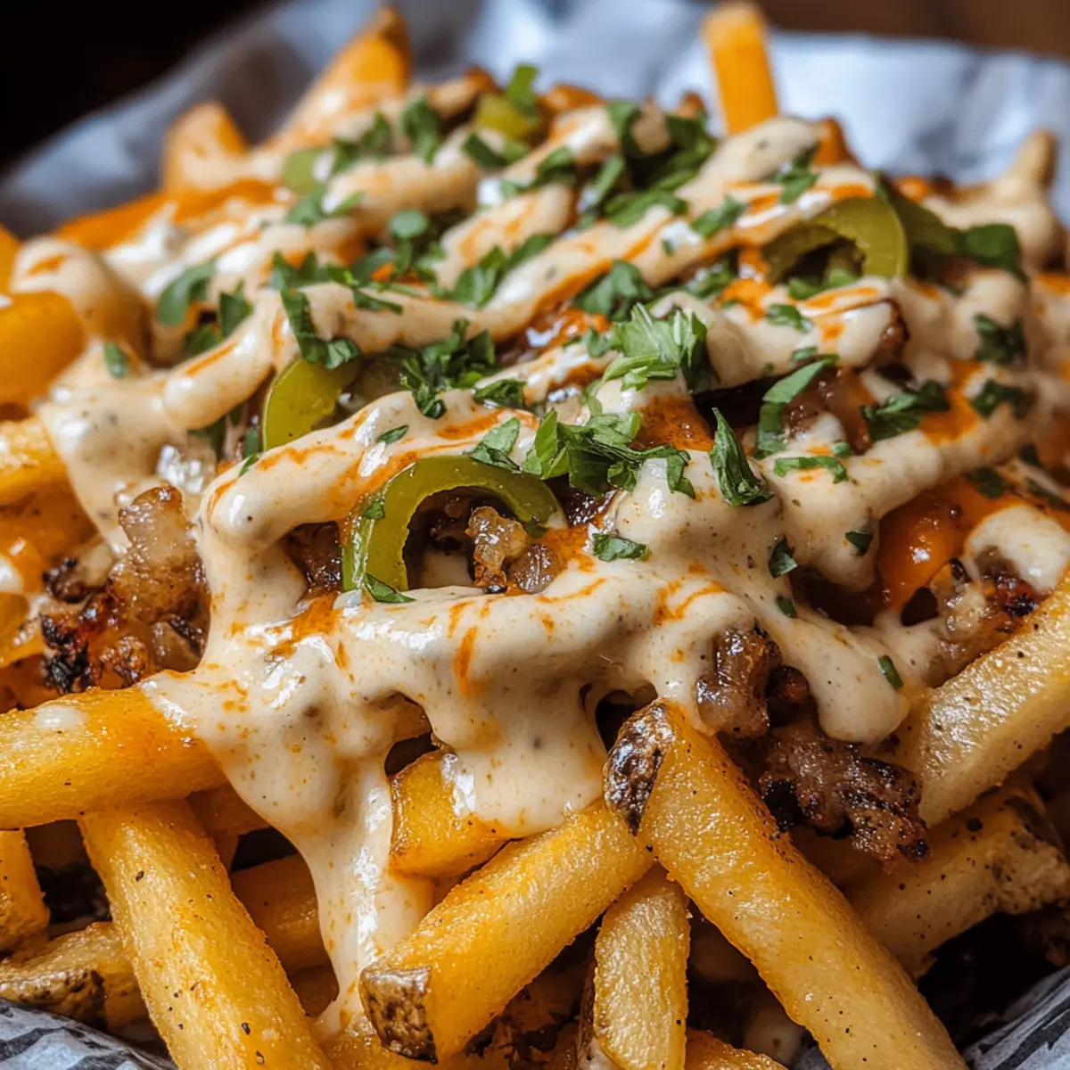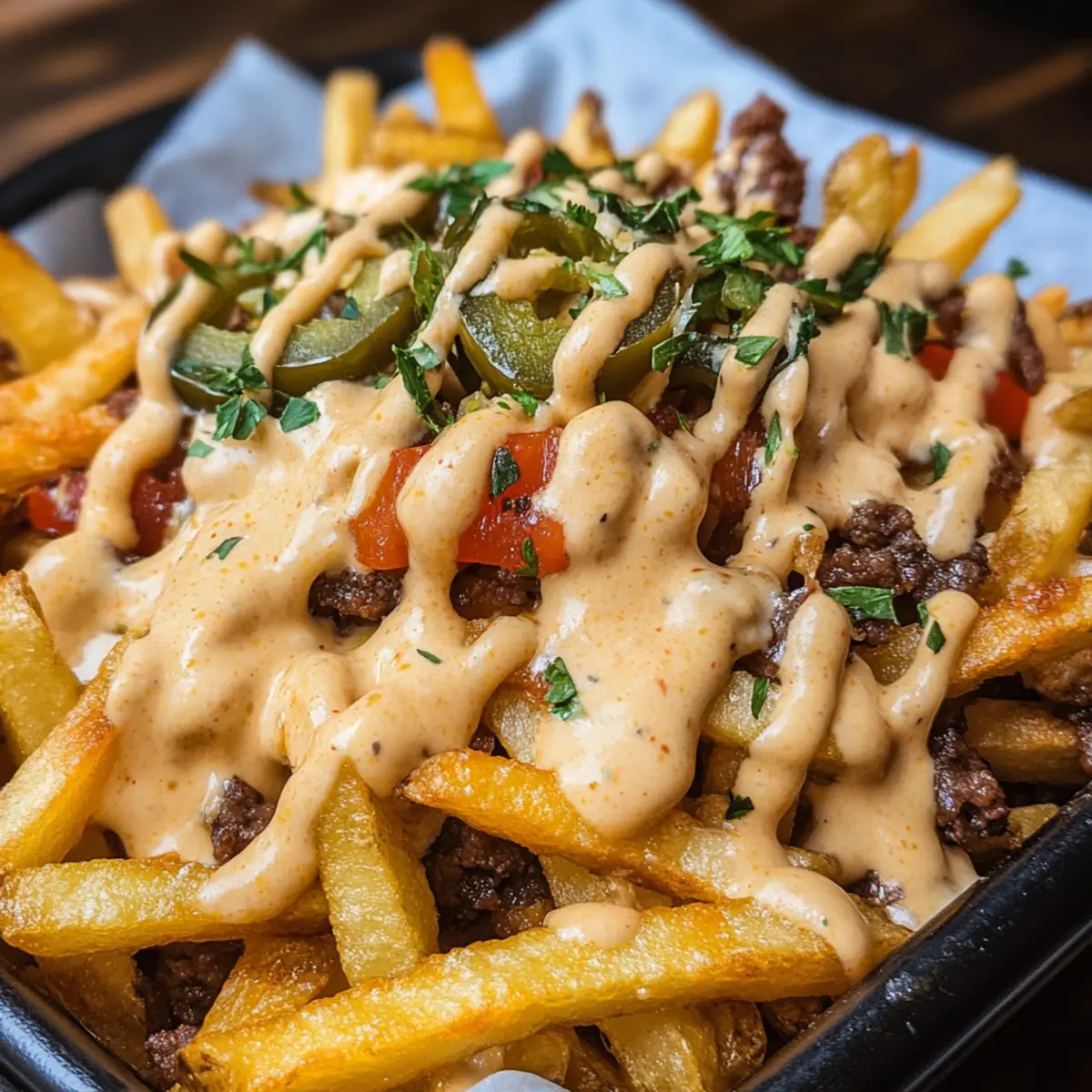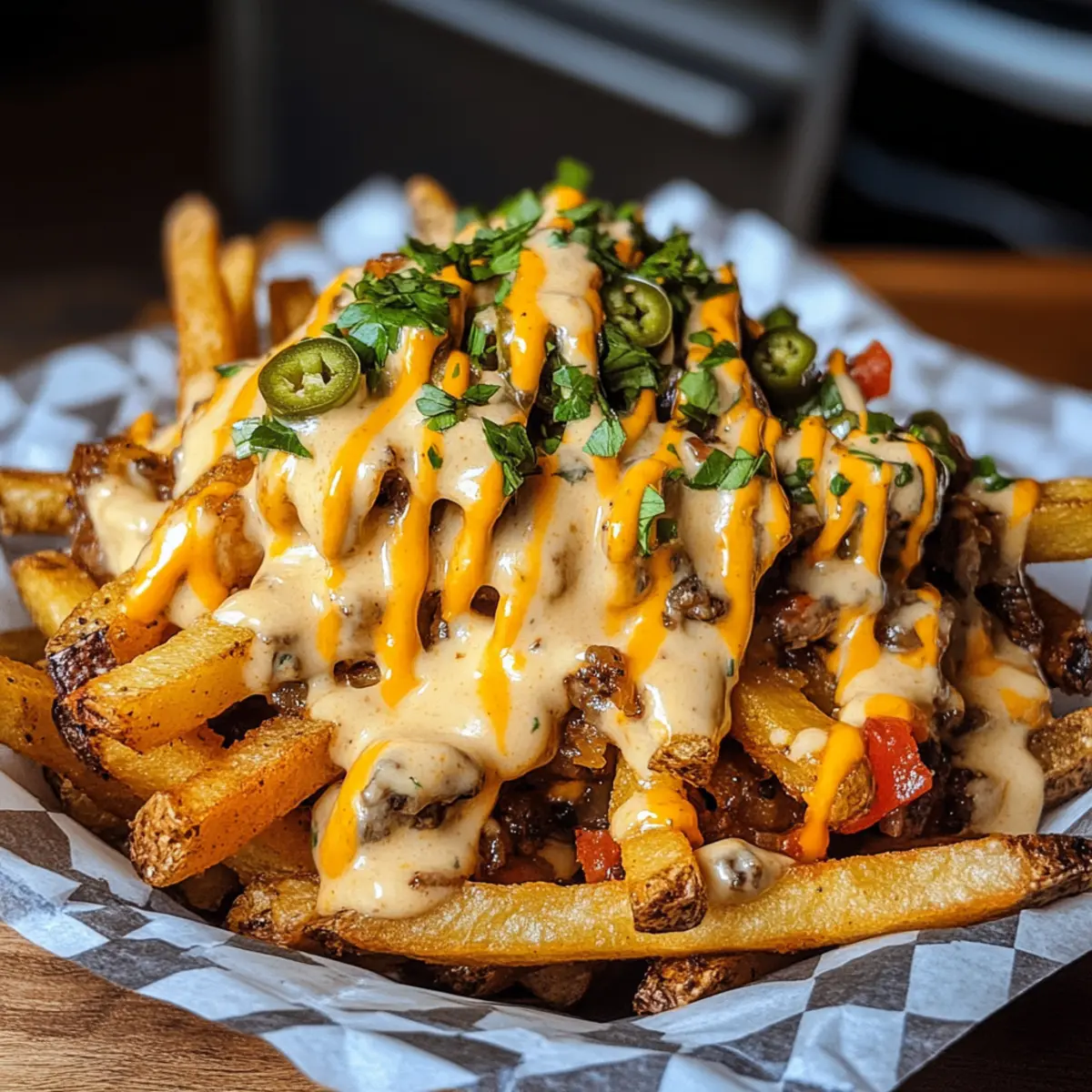 „Konnte ich wirklich dieser Versuchung widerstehen?“ fragte ich mich, als der köstliche Duft von frisch gebratenen Pommes in die Küche strömte. Heute dreht sich alles um Schmutzige Pommes, das perfekte Gericht für gemütliche Abende mit Freunden oder aufregende Spielesonntage. Diese knusprigen, goldenen Pommes sind nicht nur die idealen Träger für geschmolzenen Käse und saftige Toppings, sie sind auch vollkommen anpassbar. Ob du jetzt die Schärfe von Jalapeños oder die Herzhaftigkeit von Bacon bevorzugst, diese Pommes bieten dir die Freiheit, deinen Gaumen zu verwöhnen. Egal ob du sie als Snack oder Beilage servierst, ihre unwiderstehliche Kombination aus Crunch und cremiger Soße macht sie zum idealen Tröster für jede Gelegenheit. Bist du bereit, deine eigenen Schmutzigen Pommes zu kreieren? Lass uns gemeinsam in die Zubereitung eintauchen! Warum sind diese Schmutzigen Pommes unwiderstehlich? Unwiderstehlich lecker: Diese Schmutzigen Pommes vereinen knusprige Texturen mit geschmolzenem Käse und köstlichen Toppings, die jeden Snackabend aufpeppen. Vielseitig anpassbar: Egal, ob du es scharf oder herzhaft magst, die Toppings lassen sich ganz leicht nach deinem Geschmack variieren. Einfache Zubereitung: Die Zubereitung ist unkompliziert und benötigt keine speziellen Kochkünste – perfekte Gelegenheit, deine Liebsten zu beeindrucken. Beliebt bei Gästen: Egal ob bei einem Filmabend oder einem Spielabend, sie sind der Hit auf jeder Feier. Cremige Soße dazu: Die selbstgemachte Soße, die du ganz nach Belieben anpassen kannst, ergänzt das Geschmackserlebnis perfekt. Probiere auch unsere anderen Snack-Ideen! Schmutzige Pommes Zutaten • Für die Pommes: Russet-Kartoffeln – Diese Kartoffeln bieten die ideale stärkehaltige Basis zum Frittieren; eine praktische Alternative sind Tiefkühlpommes. Olivenöl – Verleiht den Pommes Knusprigkeit und Geschmack; neutrales Öl oder Avocadoöl sind gute Substitute. Knoblauchpulver – Fügt den Pommes eine würzige Tiefe hinzu; frischer Knoblauch kann ebenfalls verwendet werden. Zwiebelpulver – Verstärkt den Geschmack; ersetzt durch fein gehackte frische Zwiebeln, wenn gewünscht. Rauchige Paprika – Gibt Wärme und einen Hauch von Rauchigkeit; gewöhnliche Paprika kann ebenfalls eingesetzt werden. Salz – Unverzichtbar für den Geschmack; Meersalz oder koscheres Salz funktionieren ebenso gut. Schwarzer Pfeffer – Sorgt für etwas Schärfe; frisch gemahlener Pfeffer ist ideal, kann aber durch vorzerkleinerten ersetzt werden. • Für den Belag: Cheddar-Käse – Bringt einen kräftigen Geschmack; eine Käsemischung kann hier eine leckere Alternative sein. Mozzarella-Käse – Sorgt für Cremigkeit; Provolone oder ein anderer Schmelzkäse sind ebenfalls geeignete Optionen. Rote Zwiebel – Fügt beim Anbraten Süße hinzu; kann durch gelbe Zwiebeln ersetzt werden. Grüne & Rote Paprika – Sorgen für Farbe und Süße; jede Sorte von Paprika ist hier verwendbar. Jalapeño – Optional für zusätzliche Schärfe; kann weggelassen werden, um ein milderes Gericht zu erzielen. Chiliflocken & getrockneter Oregano – Optional für extra Würze; frische Kräuter sind ebenfalls ein Ersatz. Frische Petersilie/Koriander – Dient als Garnitur; jede frische Kräuterart kann für zusätzliche Frische verwendet werden. • Für die Soße: Sauerrahm/Griechischer Joghurt – Bildet die cremige Basis der Soße; auch leichte Versionen können verwendet werden. Mayonnaise – Sorgt für Reichhaltigkeit in der Soße; kann durch eine vegane Alternative ersetzt werden. Zitronensaft – Fügt Säure hinzu; Essig kann für einen ähnlichen Geschmack ebenfalls genutzt werden. Genieße das Kochen und die Freude, deine eigenen Schmutzigen Pommes zu kreieren! Schritt-für-Schritt-Anleitung für Schmutzige Pommes Schritt 1: Pommes vorbereiten Schneide die Russet-Kartoffeln in gleichmäßige Stäbchen und lege sie für 30 Minuten in kaltes Wasser. Dies hilft, die Stärke zu entfernen und die Pommes knusprig zu machen. Nach dem Einweichen abtropfen lassen und gründlich mit einem Küchentuch trocknen. Mische die Kartoffeln dann mit Olivenöl, Knoblauchpulver, Zwiebelpulver, rauchiger Paprika, Salz und schwarzem Pfeffer, bis sie gleichmäßig überzogen sind. Schritt 2: Backen oder Frittieren Heize den Ofen auf 220°C (425°F) vor. Breite die vorbereiteten Pommes gleichmäßig auf einem Backblech aus und backe sie für 25-30 Minuten. Wende die Pommes nach der Hälfte der Zeit für eine gleichmäßige Bräunung. Alternativ kannst du die Pommes in einer Heißluftfritteuse bei 190°C (375°F) für 15-18 Minuten frittieren, dabei regelmäßig schütteln, um eine gleichmäßige Garung zu gewährleisten. Schritt 3: Belag anbraten Erhitze einen Esslöffel Olivenöl in einer Pfanne bei mittlerer Hitze. Füge die gewürfelten roten Zwiebeln und Paprika hinzu und brate sie an, bis sie weich und leicht karamellisiert sind, etwa 5-7 Minuten. Dieser Schritt verleiht deinen Schmutzigen Pommes eine wunderbare Geschmacksfülle. Wenn du Jalapeños hinzuzufügen möchtest, kannst du sie in den letzten Minuten des Anbratens hinzufügen. Schritt 4: Pommes zusammensetzen Nehme die knusprigen Pommes aus dem Ofen und lege sie in eine ofenfeste Form. Bestreue sie großzügig mit Cheddar- und Mozzarella-Käse. Stelle die Form für etwa 5 Minuten zurück in den Ofen, bis der Käse schön geschmolzen und blubbernd ist. Achte darauf, dass der Käse nicht zu lange gebacken wird, damit er nicht austrocknet. Schritt 5: Toppings hinzufügen Nimm die Pommes aus dem Ofen und verteile die karamellisierten Zwiebeln, Paprika, Jalapeños sowie Chiliflocken und Oregano gleichmäßig darüber. Die Toppings verleihen den Schmutzigen Pommes zusätzlichen Geschmack und Textur. Du kannst die Pommes nach Belieben anpassen, um deinen persönlichen Vorlieben gerecht zu werden. Schritt 6: Soße zubereiten In einer Schüssel vermische Sauerrahm, Mayonnaise und Zitronensaft, bis die Soße schön cremig 