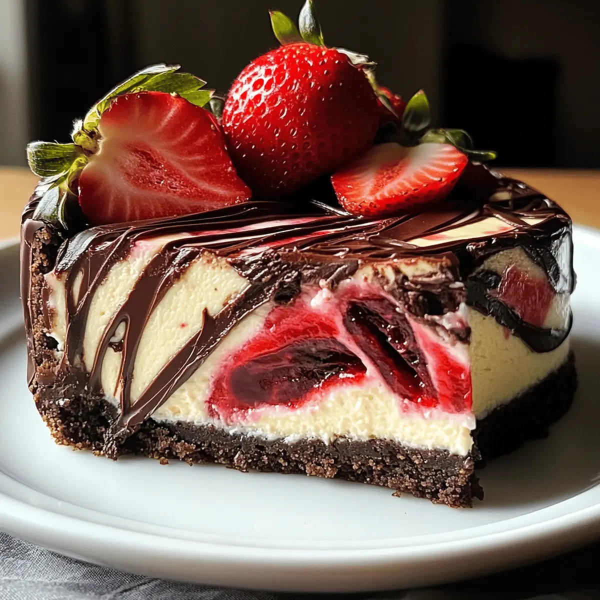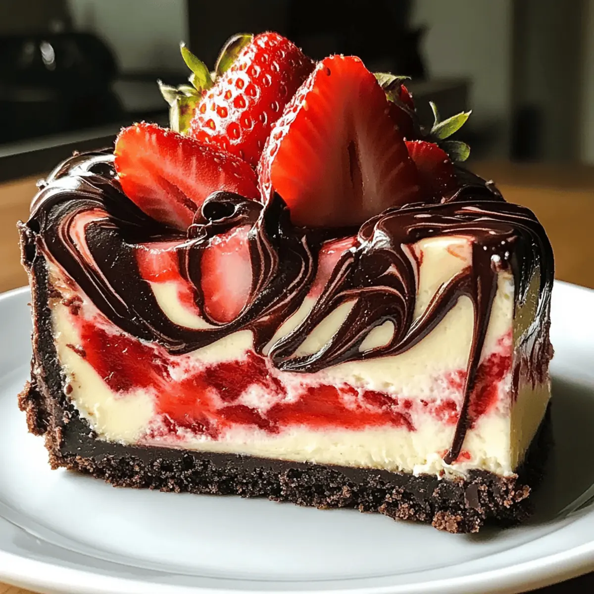 Während ich in meiner Küche stehe und die zarten Erdbeeren mit feinstem Schokoladenmousse vereine, entfaltet sich ein Erlebnis, das über bloße Dessertzubereitung hinausgeht. Der Schokoladen-Erdbeer-Schokoladenkuchen ist nicht nur ein Augenschmaus, sondern auch eine Symphonie aus köstlichen Aromen, die sowohl Schokoladenliebhaber als auch Fruchtfans begeistert. Die Kombination aus sämigem Käsekuchen und fruchtigkeit der Erdbeeren sorgt für ein wahres Geschmackserlebnis, das perfekt für jede Feier ist. Ob bei einem festlichen Anlass oder einfach nur als belohnendes Dessert nach einem langen Tag, dieses Rezept bietet nicht nur eine schnelle Zubereitung, sondern auch die Freiheit, Variationen für spezifische Diätbedürfnisse auszuprobieren. Seid ihr bereit, eure Liebsten mit einer unwiderstehlichen Geschmackskombination zu überraschen? Warum wird dieser Kuchen Ihr neuer Favorit? Einzigartige Geschmackskombination: Der Schokoladen-Erdbeer-Schokoladenkuchen bringt Schokolade und Erdbeeren in perfekter Harmonie zusammen – ein Genuss für alle Sinne. Einfache Zubereitung: Schnell und unkompliziert! Dieses Rezept erfordert keine aufwendigen Techniken und eignet sich für Küchenanfänger sowie Profis. Vielseitig anpassbar: Perfekt für alle diätetischen Bedürfnisse – ob vegan, glutenfrei oder keto-freundlich, hier ist für jeden etwas dabei. Beeindruckende Optik: Die Marmoreffekte machen diesen Kuchen zu einem echten Blickfang, der Gäste jeden Alters verzaubert. Längere Lagerfähigkeit: Praktisch: Er bleibt frisch im Kühlschrank und stellt sicher, dass man auch nach einigen Tagen noch genießen kann. Entdecken Sie auch unsere Tipps für kreative Variationen und machen Sie diesen köstlichen Kuchen zu Ihrem persönlichen Meisterwerk! Schokoladen-Erdbeer-Schokoladenkuchen Zutaten Für den Boden • Schokoladenkekse – Sie sorgen für eine knusprige Kruste. Verwenden Sie glutenfreie Schokoladenkekse für eine glutenfreie Variante. • Butter – Bindet den Boden zusammen. Für eine milchfreie Option kann Kokosöl verwendet werden. • Zucker – Süßt sowohl Boden als auch Füllung. Alternativen sind Kokoszucker für einen niedrigeren glykämischen Index. Für die Füllung • Frischkäse – Bildet die cremige Basis des Käsekuchens. Verwenden Sie pflanzlichen Frischkäse für eine milchfreie oder vegane Version. • Eier – Sorgen für Struktur und Reichhaltigkeit. Ersetzen Sie sie in veganen Varianten durch Leinsamenmehl (1 EL Leinsamen mit 2,5 EL Wasser pro Ei). • Vanilleextrakt – Verleiht zusätzlichen Geschmack. Kann durch Mandelextrakt für eine andere Geschmacksnote ersetzt werden. • Saure Sahne – Fügt Cremigkeit hinzu. Griechischer Joghurt kann eine leichtere Option darstellen. • Abgekühlte, geschmolzene Schokolade – Sorgt für reichhaltigen Schokoladengeschmack in der Füllung. Hochwertige Zartbitter-Schokolade wird empfohlen. • Frisch pürierte Erdbeeren – Trägt zur Fruchtigkeit bei. Kann durch andere Beerensäfte (Himbeeren, Heidelbeeren) für Variationen ersetzt werden. • Zitronensaft – Balanciert die Süße und verstärkt den Erdbeergeschmack. Für den Marmoreffekt (optional) • Zusätzliche Erdbeerpüree – Gibt dem Kuchen einen unvergesslichen fruchtigen Twist und ist ideal für die Dekoration. Dieses Rezept für Schokoladen-Erdbeer-Schokoladenkuchen bietet nicht nur den perfekten Geschmack, sondern auch die Möglichkeit, an Ihre diätetischen Bedürfnisse anzupassen und Ihre Gäste zu beeindrucken. Lassen Sie uns diesen himmlischen Kuchen gemeinsam zubereiten! Schritt-für-Schritt-Anleitung für Schokoladen-Erdbeer-Schokoladenkuchen Step 1: Boden vorbereiten Heizen Sie den Ofen auf 175 °C vor. Mischen Sie die Schokoladenkekse, geschmolzene Butter und Zucker in einer Schüssel, bis eine homogene Masse entsteht. Drücken Sie die Mischung gleichmäßig in eine 23 cm große Springform und backen Sie sie 10 Minuten lang. Lassen Sie den Boden danach vollständig abkühlen, bevor Sie mit der Füllung fortfahren. Step 2: Käsekuchenfüllung zubereiten Schlagen Sie den Raumtemperatur-Frischkäse in einer großen Schüssel mit einem elektrischen Mixer auf mittlerer Stufe cremig. Fügen Sie nach und nach den Zucker hinzu und mixen Sie weiter. Geben Sie die Eier einzeln dazu und rühren Sie bis zur vollständigen Mischung. Integrieren Sie Vanilleextrakt, saure Sahne und die abgekühlte, geschmolzene Schokolade gut, bis eine glatte Käsekuchenfüllung entsteht. Step 3: Erdbeerschicht vorbereiten Pürieren Sie frische Erdbeeren, Zucker und Zitronensaft in einer separaten Schüssel mit einem Standmixer oder Pürierstab, bis eine samtige Konsistenz erreicht ist. Diese fruchtige Erdbeerschicht wird gleich verwendet, um dem Schokoladen-Erdbeer-Schokoladenkuchen eine erfrischende Note zu verleihen. Stellen Sie sicher, dass das Püree genügend Süße hat, um mit der Schokolade zu harmonieren. Step 4: Schichten kombinieren Gießen Sie die Schokoladenkäsekuchenfüllung gleichmäßig über den abgekühlten Kuchenboden in der Springform. Geben Sie vorsichtig Löffel voll des frischen Erdbeerpürees darauf und verwenden Sie ein Messer, um sanft durch die Füllung zu wirbeln. Dies schafft den attraktiven Marmoreffekt, der den Schokoladen-Erdbeer-Schokoladenkuchen so besonders macht. Step 5: Backen Backen Sie den Schokoladen-Erdbeer-Schokoladenkuchen im vorgeheizten Ofen für 50-60 Minuten. Achten Sie darauf, dass die Ränder fest sind und die Mitte leicht wackelt. Schalten Sie den Ofen aus und lassen Sie den Kuchen eine Stunde im Ofen abkühlen. Dies hilft, Risse zu vermeiden, während er auf Raumtemperatur abkühlt. Step 6: Servieren Entfernen Sie den Schokoladen-Erdbeer-Schokoladenkuchen vorsichtig aus der Springform und schneiden Sie ihn in Stücke. Garnieren Sie nach Belieben mit zusätzlichem Erdbeerpüree, geschmolzener Schokolade oder schokoladigen Raspeln. Servieren Sie den Kuchen gekühlt für ein wahrhaft indulgentes Dessert-Highlight. Expertentip