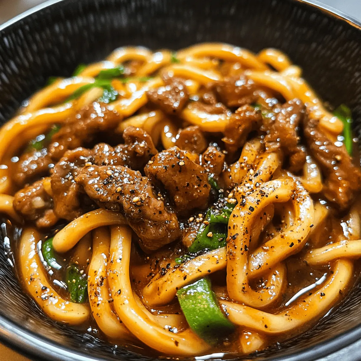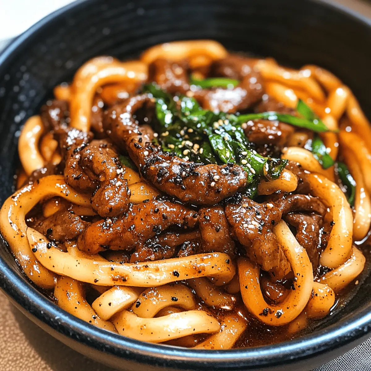Wenn ich an einen schnellen und köstlichen Abendessen denke, kommen mir sofort die Schwarzer Pfeffer Rindfleisch Udon Nudeln in den Sinn! In nur 15 Minuten zauberst du ein Gericht, das die feinen Aromen der asiatischen Küche mit dem herzhaften Geschmack von zartem Rindfleisch verbindet. Die frischen Udon-Nudeln umschmeicheln die würzige, glänzende Sauce und sorgen für ein angenehmes Mundgefühl, das jeden Bissen zu einem Genuss macht. Diese einfache, ein-Pfannen-Rezept ist perfekt für hektische Wochentage und das Beste: Du kannst es nach Herzenslust mit frischen Gemüsevariationen anpassen, um die gesunde Note zu verstärken. Wer hätte gedacht, dass so viel Freude und Zufriedenheit in einem schnellen Gericht stecken können? Lass uns gemeinsam in die Welt der Udon-Nudeln eintauchen! Warum wirst du dieses Rezept lieben? Einfachheit: Die Zubereitung ist kinderleicht, sodass du in nur 15 Minuten ein köstliches Gericht auf den Tisch zaubern kannst. Vielseitigkeit: Perfekt anpassbar mit deinem Lieblingsgemüse oder anderen Proteinen, wie Hähnchen oder Tofu. Herzhafter Geschmack: Die Kombination aus schwarzem Pfeffer, Rindfleisch und der glühenden Sauce sorgt für ein beeindruckendes Geschmackserlebnis. Gesundheit: Du kannst die Kohlenhydrate reduzieren, indem du mehr Gemüse hinzufügst, was es zu einer großartigen Option für ernährungsbewusste Genießer macht. Beliebtheit: Dieses Gericht ist ein Hit bei der ganzen Familie—alle werden um Nachschlag bitten! Zutaten für Schwarzer Pfeffer Rindfleisch Udon Nudeln • Diese köstlichen Schwarzer Pfeffer Rindfleisch Udon Nudeln brauchen eine sorgfältige Auswahl an Zutaten. Für die Nudeln Frische Udon-Nudeln – Sie bieten eine chewy Textur und nehmen die Sauce perfekt auf; frisch ist besser als trocken für höchste Qualität. Für das Rindfleisch Shabu Shabu Rindfleisch – Dünn geschnittenes Rindfleisch, das schnell kocht; keine Marinade erforderlich, ideal für die schnelle Zubereitung. Für das Gemüse Zwiebel – Fügt Süße und Tiefe hinzu; verwende gelbe oder weiße Zwiebeln. Knoblauch (gehackt) – Steigert das Aroma und die Geschmacksnuancen; unerlässlich für ein herzhaftes Profil. Ingwer (gehackt, optional) – Bringt Wärme und Würze; kann weggelassen werden, wenn du es bevorzugst. Chye Sim (oder Blattgemüse) – Steigert den Nährwert und bringt einen frischen Touch; jedes Blattgemüse kann verwendet werden. Für die Sauce Dunkle Sojasauce (oder Kicap Manis) – Sorgt für Tiefe, Farbe und ausgewogene Salzigkeit; kann für Süße angepasst werden. Austernsauce – Fügt Reichhaltigkeit und Umami hinzu; Hoisin kann für eine süßere Note verwendet werden. Tomatenmark – Bringt Feuchtigkeit und einen Hauch von Süße; optional, aber empfehlenswert. Schwarzer Pfeffer – Der Schlüsselbestandteil für den Geschmack; nach Geschmack anpassen für die gewünschte Schärfe. Wasser – Wird zur Herstellung der flüssigen Basis der Sauce verwendet. Maisstärke (Stärke + Wasser) – Verdickt die Sauce für einen glänzenden Abschluss. Genieße die Zubereitung und lass die Aromen der Schwarzer Pfeffer Rindfleisch Udon Nudeln deine Küche zum Leben erwecken! Schritt-für-Schritt-Anleitung für Schwarzer Pfeffer Rindfleisch Udon Nudeln Schritt 1: Udon-Nudeln zubereiten Bringe in einem großen Topf ausreichend Wasser zum Kochen. Füge die frischen Udon-Nudeln hinzu und lasse sie für etwa 2–3 Minuten köcheln, bis sie weich sind. Rühre gelegentlich um, damit die Nudeln nicht zusammenkleben. Sobald sie fertig sind, gieße sie ab und stelle sie beiseite, während du die Sauce zubereitest. Schritt 2: Gemüse und Gewürze anbraten Erhitze in einer großen Pfanne etwas Öl bei mittlerer Hitze. Füge die gehackte Zwiebel und den Knoblauch hinzu und brate sie etwa 2 Minuten lang an, bis sie duften und leicht goldbraun sind. Wenn du Ingwer verwendest, gib ihn jetzt ebenfalls dazu und brate ihn für eine zusätzliche Minute mit, um den Geschmack zu intensivieren. Schritt 3: Rindfleisch anbraten Gib die dünn geschnittenen Shabu Shabu Rindfleischstücke in die Pfanne und brate sie für 2–3 Minuten an, bis sie außen leicht gebräunt und gar sind. Achte darauf, die Stücke gleichmäßig zu braten, um ein optimales Aroma zu garantieren. Wenn das Rindfleisch schön bräunt, kannst du mit der Sauce fortfahren. Schritt 4: Sauce zubereiten Gib nun die dunkle Sojasauce, Austernsauce, Tomatenmark, Wasser und frisch gemahlenen schwarzen Pfeffer in die Pfanne. Rühre alles gut durch, sodass sich die Zutaten gleichmäßig vermischen. Lasse die Mischung bei mittlerer Hitze 2–3 Minuten köcheln, bis sie leicht eindickt und aromatisch duftet. Schritt 5: Udon-Nudeln hinzufügen Füge nun die zuvor zubereiteten Udon-Nudeln in die Pfanne hinzu und mische sie sorgfältig mit der Sauce, sodass sie gleichmäßig bedeckt sind. Lasse alles weitere 1–2 Minuten kochen, damit die Nudeln die köstlichen Aromen der Schwarzer Pfeffer Rindfleisch Udon Nudeln aufnehmen können. Schritt 6: Gemüse hinzufügen Falls du Chye Sim oder ein anderes Blattgemüse verwendest, füge es jetzt hinzu. Rühre alles gut um und lasse das Gemüse für etwa 1 Minute wiltigen. Es sollte leuchtend grün bleiben und seine Frische bewahren, um der gesamten Speise eine gesunde Note zu verleihen. Schritt 7: Sauce eindicken Bereite eine Maisstärke-Slurry vor, indem du 1 Esslöffel Stärke mit 2 Esslöffeln Wasser vermischst. Gieße die Mischung langsam in die Pfanne und rühre stetig um, bis die Sauce eine glossy Konsistenz erreicht. Lasse sie etwa 1 Minute köcheln, bis sich alles gut verbunden hat. Schritt 8: Servieren Sobald die Schwarzer Pfeffer Rindfleisch Udon Nudeln reichhaltig und glänzend sind, nimm die Pfanne vom Herd. Serviere das Gericht sofort und garniere es nach Wunsch mit frischen Frühlingszwiebeln oder Sesamsamen für einen zusätzlichen Crunch. Vorbereitungen für deine Schwarzer Pfeffer Rindfleisch Udon Nudeln Die Zubereitung deiner Schwarzer Pfeffer Rindfl