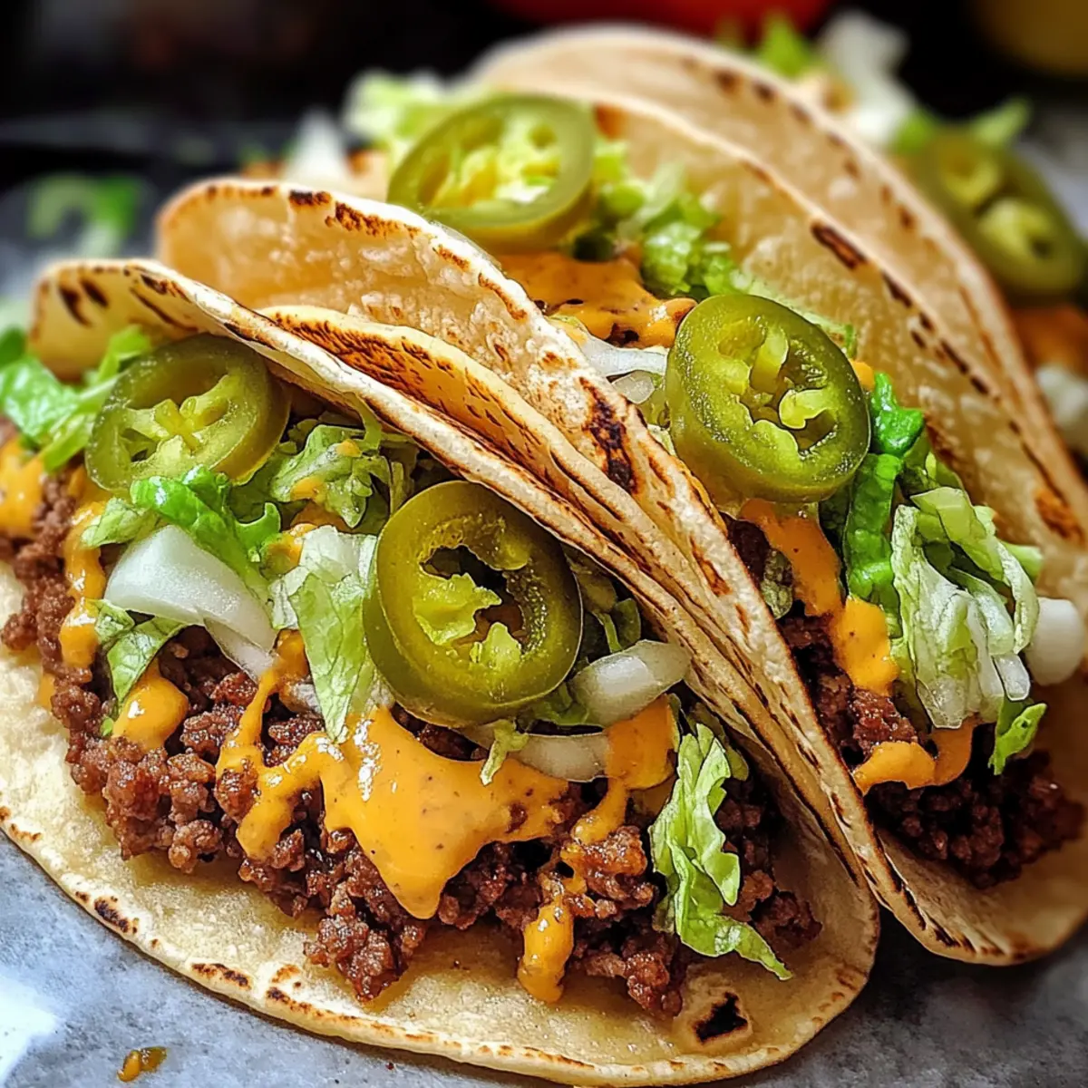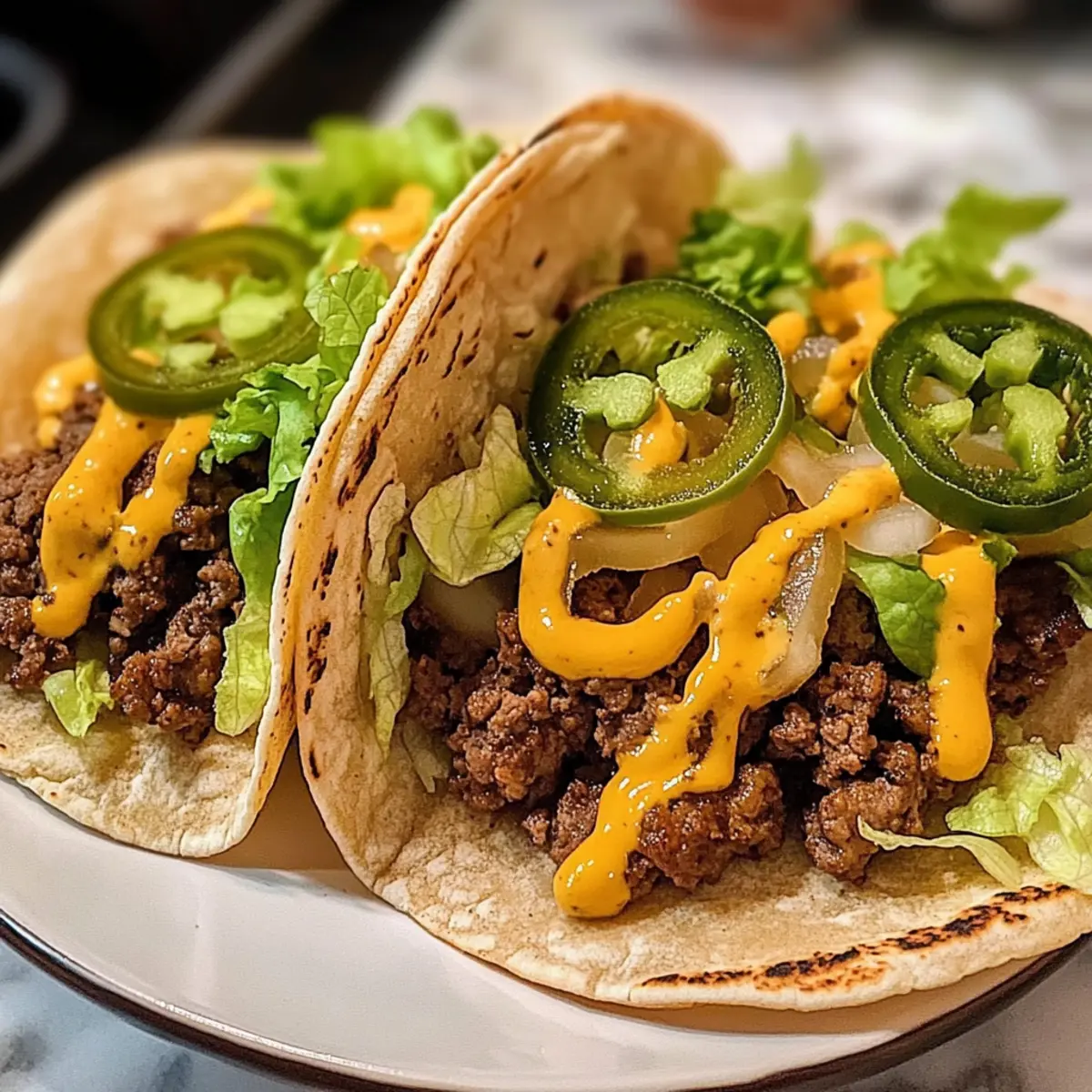 Sobald das Rinderhackfleisch fertig ist, verteile es gleichmäßig in der Mitte der warmen Tortillas. Füge großzügig geschmolzenen Käse (wie American oder Cheddar) hinzu und ergänze deine Lieblingszutaten wie frisch gehackte Avocado oder Jalapeños. Stelle sicher, dass die Tacos nicht überfüllt sind, um ein Reißen der Tortillas zu vermeiden.