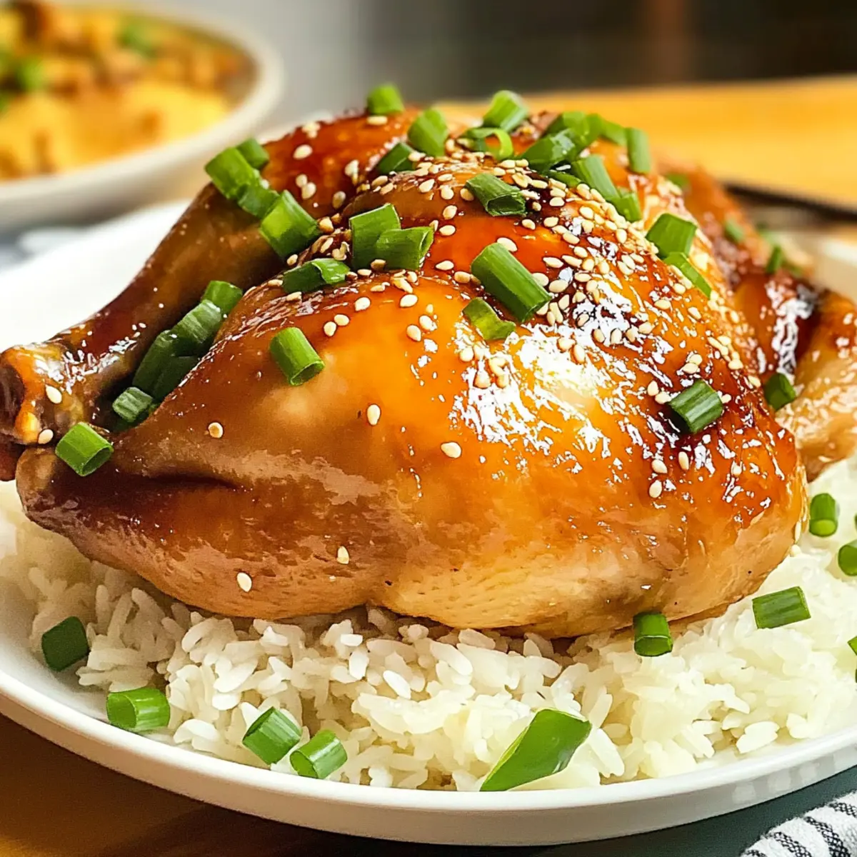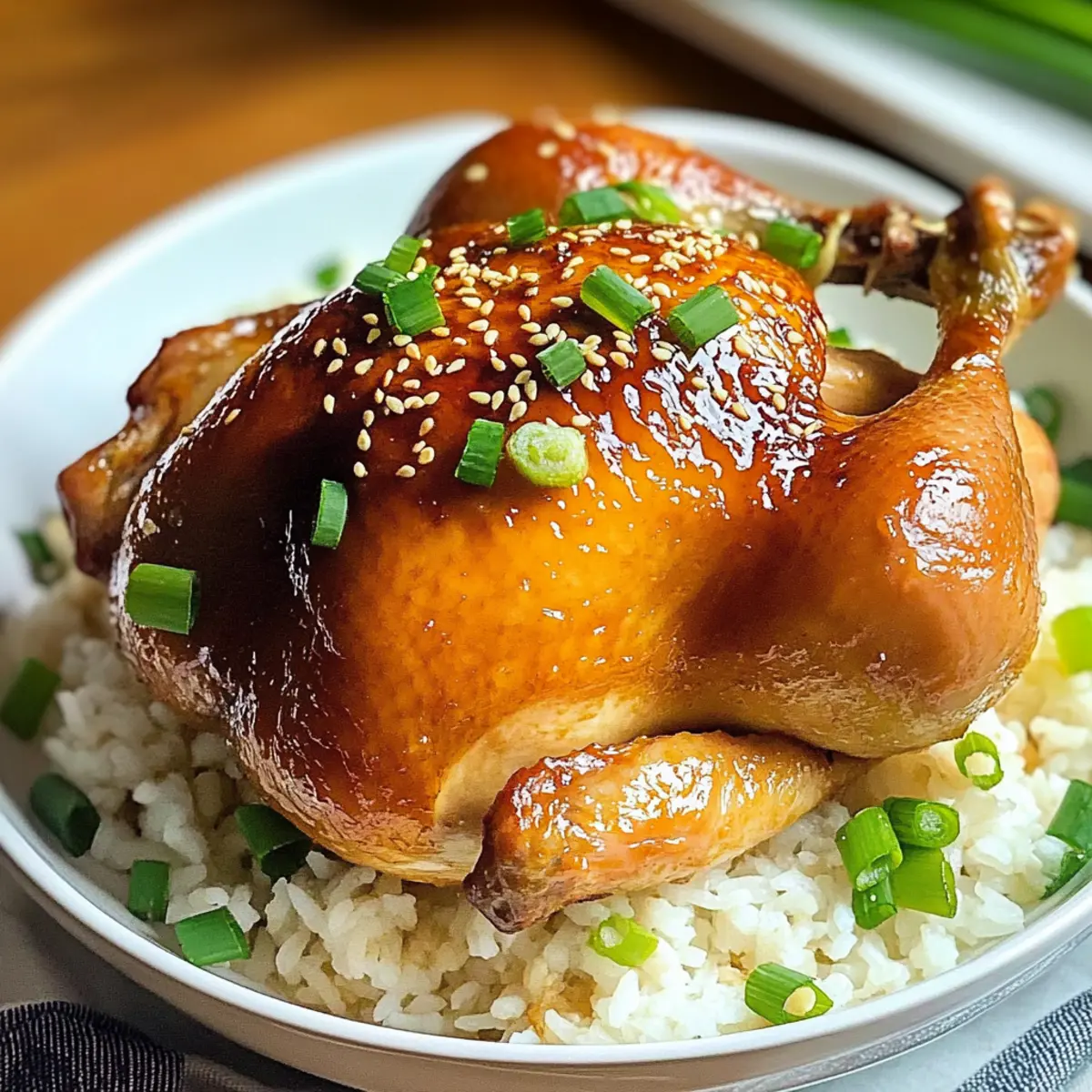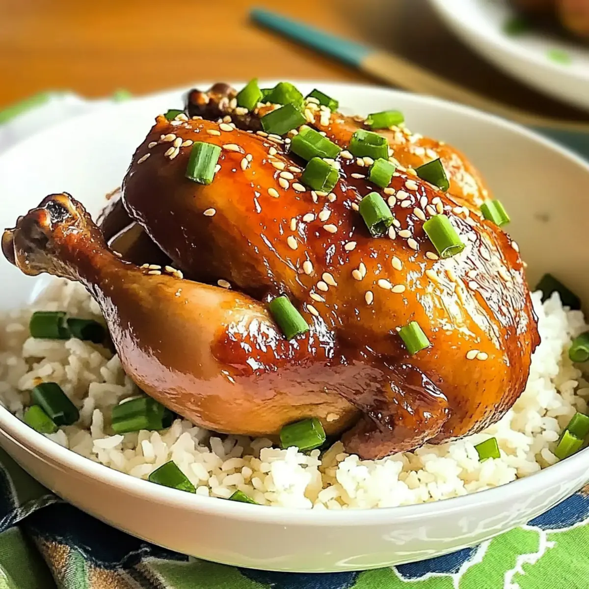 „Wussten Sie, dass der Reis Kochen kann, während das Hähnchen in der Sojasoße ein unvergleichliches Aroma entfaltet?“ Wenn ich diese Methode mit einem ganzen Hähnchen ausprobiere, kann ich mich immer wieder daran erfreuen, wie unkompliziert und köstlich das Ergebnis ist. Diese glutenfreie „Sojasoße Hähnchen mit Reis“-Rezept ist perfekt für hektische Wochentage oder besondere Anlässe, denn es überzeugt mit einer schnellen Zubereitung und einem beeindruckenden Geschmack. In nur etwa 1,5 Stunden zaubern Sie eine wahre Geschmacksexplosion, die Ihre Gäste umhauen wird. Egal, ob Sie ein gemütliches Familienessen oder ein festliches Buffet planen – der unwiderstehliche Duft wird jeden an den Tisch locken. Neugierig, wie einfach und schmackhaft Ihr nächstes Gericht sein kann? Lass uns direkt in die Zubereitung eintauchen! Warum ist dieses Rezept so besonders? Einfachheit: Die Zubereitung ist so unkompliziert, dass auch ungeübte Köche mühelos ein köstliches Gericht kreieren können. Vielseitigkeit: Ob ganzes Hähnchen, Hähnchenschenkel oder drumsticks – die Optionen sind vielfältig und anpassungsfähig an Ihre Vorlieben. Aromatischer Genuss: Die Kombination aus Sojasauce, Ingwer und Knoblauch sorgt für einen unwiderstehlichen, herzhaften Geschmack, der jeden begeistert. Glutenfreie Freude: Mit einer glutenfreien Sojasauce ist dieses Rezept auch perfekt für Gäste mit empfindlichen Ernährungsbedürfnissen. Zeitersparnis: In nur 1,5 Stunden können Sie ein wunderbares, festliches Mahl zaubern, ohne stundenlang in der Küche zu stehen. Probieren Sie unbedingt auch unsere Liner-Optionen aus, um den Geschmack noch weiter zu verfeinern! Sojasoße Hähnchen mit Reis Zutaten • Für das Hähnchen Ganzes Hähnchen (ca. 1,1 kg) – Hauptprotein, sorgt für ein herzhaftes Gericht; überprüfen Sie, ob es in den Reiskocher passt. Ingwer (1 Esslöffel, frisch) – Fügt Wärme und Tiefe hinzu; frisch ist vorzuziehen. Knoblauch (4 Zehen, frisch) – Steigert den Geschmack und das Aroma; frischer Knoblauch ist aromatischer als Pulver. Frühlingszwiebeln (3 Stängel, gehackt) – Aromatische Basis; können auch als Garnitur verwendet werden. • Für die Marinade Helle Sojasauce (1/2 Tasse) – Gibt Salzigkeit und Umami; eine natriumarme Variante kann verwendet werden. Dunkle Sojasauce (1/4 Tasse) – Verleiht Farbe und intensiveren Geschmack; sparsam verwenden. Austernsauce (2 Esslöffel) – Bringt Süße und zusätzlichen Umami-Geschmack; Hoisinsauce ist eine gute vegetarische Alternative. Shaoxing Wein (1/4 Tasse) – Fügt Tiefe hinzu; trockener Sherry ist eine geeignete Alternative. Honig (2 Esslöffel) – Süßt und harmonisiert die Aromen; brauner Zucker kann ersetzt werden. Weißer Pfeffer (1 Teelöffel) – Bringt eine subtile Schärfe; schwarzer Pfeffer kann auch verwendet werden. • Für das Garnieren (optional) Sesamkörner (1 Esslöffel) – Für die Garnitur; sie fügen Textur und Geschmack hinzu. Erleben Sie, wie einfach und schmackhaft das Sojasoße Hähnchen mit Reis sein kann! Schritt-für-Schritt-Anleitung für Sojasoße Hähnchen mit Reis Step 1: Hähnchen vorbereiten Spülen Sie das ganze Hähnchen unter kaltem Wasser ab und übergießen Sie es mit kochendem Wasser, um den Geschmack zu intensivieren. Tupfen Sie das Hähnchen dann mit einem Küchentuch trocken, um überschüssige Feuchtigkeit zu entfernen. Dieser Schritt sorgt dafür, dass die Marinade besser haften bleibt und das Hähnchen saftiger wird. Step 2: Marinade zubereiten Mischen Sie in einer mittleren Schüssel die helle und dunkle Sojasauce, die Austernsauce, den Shaoxing Wein, den Honig und den weißen Pfeffer gut durch. Rühren Sie alles gründlich, bis sich die Zutaten vollständig verbunden haben. Diese aromatische Marinade wird dem Sojasoße Hähnchen mit Reis einen reichen, herzhaften Geschmack verleihen. Step 3: Hähnchen marinieren Bestreichen Sie das vorbereitete Hähnchen großzügig mit der Marinade und stellen Sie sicher, dass es gleichmäßig bedeckt ist. Lassen Sie das Hähnchen für 20 bis 30 Minuten marinieren, damit die Aromen gut eindringen können. Dies ist ein wichtiger Schritt, um ein köstliches Ergebnis zu erzielen! Step 4: Aromatisches Bett vorbereiten Bereiten Sie den Reiskocher vor, indem Sie eine Schicht aus dünn geschnittenem Ingwer, zerdrücktem Knoblauch und gehackten Frühlingszwiebeln gleichmäßig am Boden verteilen. Diese aromatischen Zutaten geben dem Hähnchen und dem Reis während des Kochens zusätzlichen Geschmack. Step 5: Hähnchen platzieren Legen Sie das marinierte Hähnchen vorsichtig auf das aromatische Bett im Reiskocher. Gießen Sie jegliche verbleibende Marinade gleichmäßig über das Hähnchen, um sicherzustellen, dass es beim Kochen reichhaltig gewürzt wird. Dies wird helfen, die Saftigkeit und den umami Geschmack zu fördern. Step 6: Kochen im Reiskocher Setzen Sie den Reiskocher auf die Kochstufe und lassen Sie das Hähnchen 45 Minuten bis 1 Stunde garen. Wenden Sie das Hähnchen nach der Hälfte der Kochzeit, um eine gleichmäßige Garung zu gewährleisten. Das Hähnchen ist fertig, wenn die Haut schön gebräunt und knusprig ist. Step 7: Hähnchen ruhen lassen Lassen Sie das Hähnchen nach dem Kochen für einige Minuten ruhen, damit sich die Säfte setzen können. Nach der Ruhezeit ist das Hähnchen bereit zum Tranchieren. Servieren Sie es über Reis oder Nudeln, garniert mit weiteren Frühlingszwiebeln und optional Sesamkörnern für zusätzliche Textur und Geschmack. Lagerungstipps für Sojasoße Hähnchen Zimmertemperatur: Lassen Sie das Hähnchen nicht länger als 2 Stunden bei Zimmertemperatur stehen, um die Lebensmittelsicherheit zu gewährleisten. Kühlschrank: Bewahren Sie Reste in einem luftdichten Behälter im Kühlschrank auf, wo sie bis zu 4 Tage haltbar bleiben. So bleibt Ihr Sojasoße Hähnchen frisch und schmackhaft. Gefrierfach: Für längere Aufbewahrung können Sie das Hähnchen portioniert einfrieren. Es hält sich bis