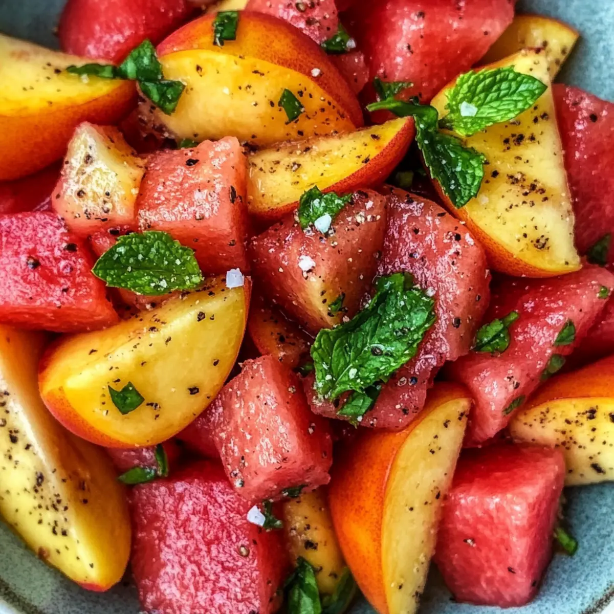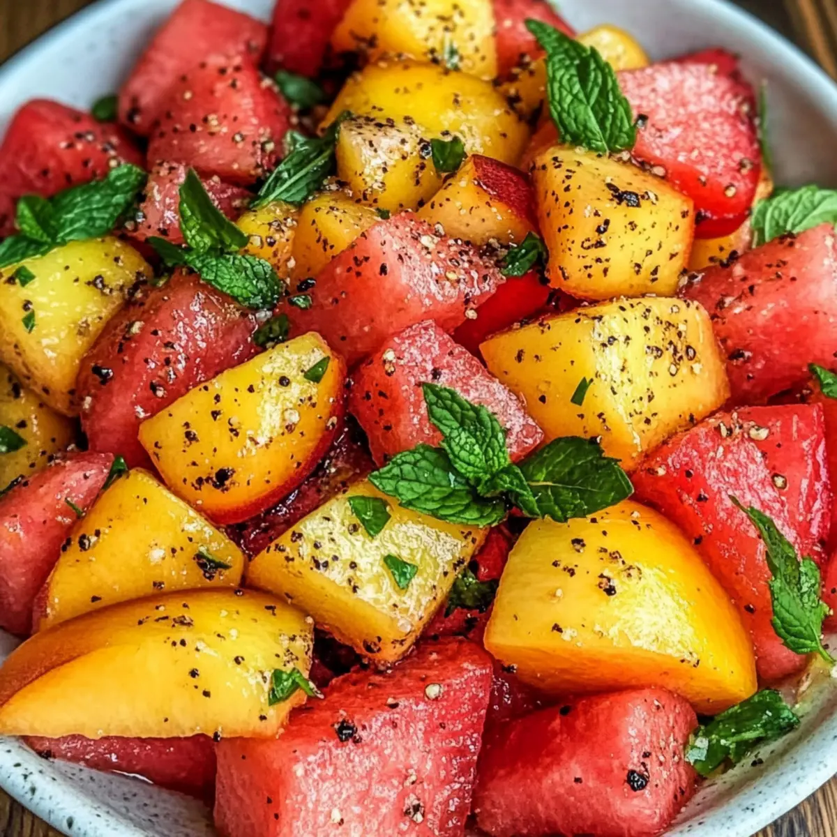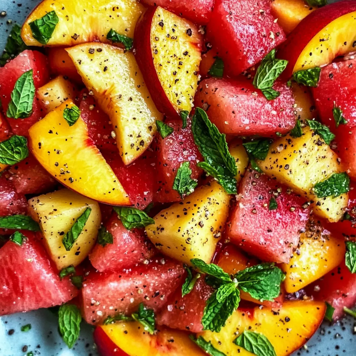 Die Sonne scheint, und es gibt nichts Besseres, als mit einem leichten, erfrischenden Sommergericht zu zaubern! Mein Rezept für einen Sommerpfirsich-Wassermelonen-Salat ist das perfekte Beispiel für solche genussvollen Kreationen. Mit der Kombination saftiger Pfirsiche und süßer Wassermelone, verfeinert mit einem Hauch frischer Minze und pimpt mit etwas schwarzem Pfeffer, wird dieser Salat schnell zu einem Highlight auf Ihrem Tisch. Sie werden den schnellen Zubereitungsprozess lieben – kein Kochen erforderlich – und die Art und Weise, wie er sich als erfrischende Beilage bei Grillabenden oder Picknicks eignet. Wer kann bei so viel Frische und Geschmack schon widerstehen? Neugierig auf die Zubereitung? Warum Sie diesen Salat lieben werden Frische, leichte Zutaten: Mit saftigen Pfirsichen und süßer Wassermelone entsteht eine harmonische Kombination, die an Sommertage erinnert. Kein Kochen erforderlich: In wenigen Minuten lässt sich dieser Salat zubereiten – ideal für heiße Tage und spontane Einladungen. Vielfalt der Aromen: Abgerundet mit frischer Minze und einem Spritzer Zitrussaft sorgt er für einen erfrischenden Genuss. Perfekte Beilage: Egal ob beim Grillen oder als gesunder Snack, dieser Salat passt zu jeder Gelegenheit. Gesunde Wahl: Er ist vegan, glutenfrei und nährstoffreich – perfekt für alle, die auf ihre Ernährung achten! Zutaten für den Sommerpfirsich-Wassermelonen-Salat • Ein einfacher, erfrischender Genuss für heiße Tage! Für den Salat Pfirsiche – sorgen für Süße und Saftigkeit; verwenden Sie reife gelbe Pfirsiche für den besten Geschmacksbalance. Wassermelone – liefert Hydration und Süße; wählen Sie kernlose Sorten für ein einfaches Genießen und suchen Sie nach einer schweren Melone mit einem cremigen, gelben Fleck. Frische Minze – fügt eine erfrischende, herbe Note hinzu; verwenden Sie Spearmint für einen sanften Geschmack. Zitronen- oder Limettensaft – hellt die Aromen auf; ein Spritzer verstärkt die Süße, ohne die Früchte zu überwältigen. Olivenöl (optional) – bringt Reichhaltigkeit und Tiefe ins Spiel; verwenden Sie es sparsam oder lassen Sie es für eine leichtere Variante weg. Meersalz & schwarzer Pfeffer – intensiviert den Geschmack; nach Belieben anpassen, aber darauf achten, dass genug Pfeffer für einen subtilen Kick vorhanden ist. Schritt-für-Schritt-Anleitung für den Sommerpfirsich-Wassermelonen-Salat Step 1: Pfirsiche schneiden Schneiden Sie die Pfirsiche in Spalten oder Stücke. Wenn die Haut dick ist, können Sie die Pfirsiche auch schälen. Achten Sie darauf, reife gelbe Pfirsiche zu verwenden, da sie die beste Balance zwischen Süße und Geschmack bieten. Legen Sie die geschnittenen Pfirsiche beiseite und genießen Sie den köstlichen Duft. Step 2: Wassermelone vorbereiten Schneiden Sie die Wassermelone in etwa 2,5 cm große Würfel und entfernen Sie gegebenenfalls die Kerne. Wählen Sie eine schwerere, kernlose Wassermelone mit einem cremigen gelben Fleck, um sicherzustellen, dass sie reif und süß ist. Die leuchtende Farbe der Wassermelone wird hervorragend mit den Pfirsichen harmonieren. Step 3: Minze schneiden Waschen Sie frische Minzeblätter und zupfen Sie sie von den Stielen. Die Blätter sollten grob zerrissen werden, um deren Aroma zu bewahren. Dies verleiht dem Sommerpfirsich-Wassermelonen-Salat eine frische, lebendige Note. Achten Sie darauf, die Minze erst kurz vor dem Servieren hinzuzufügen, um die Frische zu maximieren. Step 4: Zutaten kombinieren In einer großen Schüssel geben Sie die Wassermelonen- und Pfirsichstücke zusammen. Verwenden Sie eine große Schüssel, um genügend Platz zum Mischen zu haben und sicherzustellen, dass die Früchte nicht zerdrückt werden. Vorsichtig umrühren, damit die Früchte gleichmäßig verteilt sind und die Farben wunderbar zur Geltung kommen. Step 5: Gewürze hinzufügen Streuen Sie die zerrissenen Minzeblätter, Meersalz und frisch gemahlenen schwarzen Pfeffer über die Fruchtmischung. Diese Zutaten heben den Geschmack des Sommerpfirsich-Wassermelonen-Salats hervor und sorgen für ein harmonisches Zusammenspiel der Aromen. Mischen Sie alles sanft, um die Frische und Textur der Zutaten zu erhalten. Step 6: Zitronensaft genießen Träufeln Sie etwas Zitronen- oder Limettensaft (und optional Olivenöl) über den Salat. Dies bringt die Aromen zum Strahlen, ohne die Fruchtigkeit der Früchte zu überwältigen. Sanft umrühren, damit sich der Saft gut verteilt. Achten Sie darauf, dass der Salat leicht glänzt und alle Zutaten in einer köstlichen Marinade vereint werden. Step 7: Vor dem Servieren kühlen Decken Sie den Sommerpfirsich-Wassermelonen-Salat ab und stellen Sie ihn für 15-20 Minuten in den Kühlschrank. Dies hilft, die Aromen zu verbinden und sorgt für eine erfrischende Kühle, perfekt für heiße Tage. Genießen Sie den Duft, während Sie warten, und bereiten Sie sich auf einen köstlichen Genuss vor. Expert Tips für den Sommerpfirsich-Wassermelonen-Salat Frische Zutaten: Verwenden Sie reife, saisonale Früchte für den besten Geschmack. Testen Sie die Geschmäcker vor der Zubereitung des Salats, um die Süße zu garantieren. Optimale Kühlung: Lassen Sie den Salat vor dem Servieren im Kühlschrank ruhen. So verbinden sich die Aromen und der Salat bleibt frisch und kühl. Minze richtig hinzufügen: Fügen Sie frische Minzeblätter erst kurz vor dem Servieren hinzu, um den aromatischen Duft zu bewahren und die Frische zu maximieren. Kein Übermixen: Vermeiden Sie Übermixen, um die knusprige Textur der Wassermelone zu erhalten und die Stücke schön zu halten. Variationen berücksichtigen: Experimentieren Sie mit zusätzlichen Zutaten wie Feta oder Nüssen, um den Sommerpfirsich-Wassermelonen-Salat nach Ihrem Geschmack anzupassen. Variationen und Ersatzmöglichkeiten Lassen Sie Ihrer Kreativität freien Lauf und passen Sie dieses Rezept nach Ihrem Geschmack an! Getreide-Basis: Fügen Sie gekochte Quinoa oder Bulgur für eine sättigende