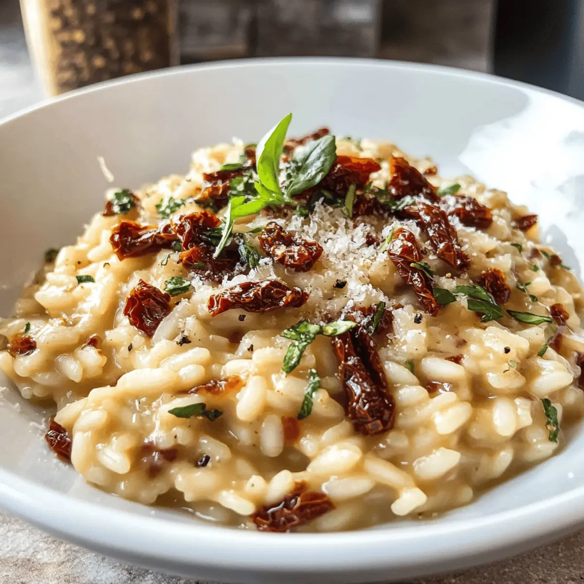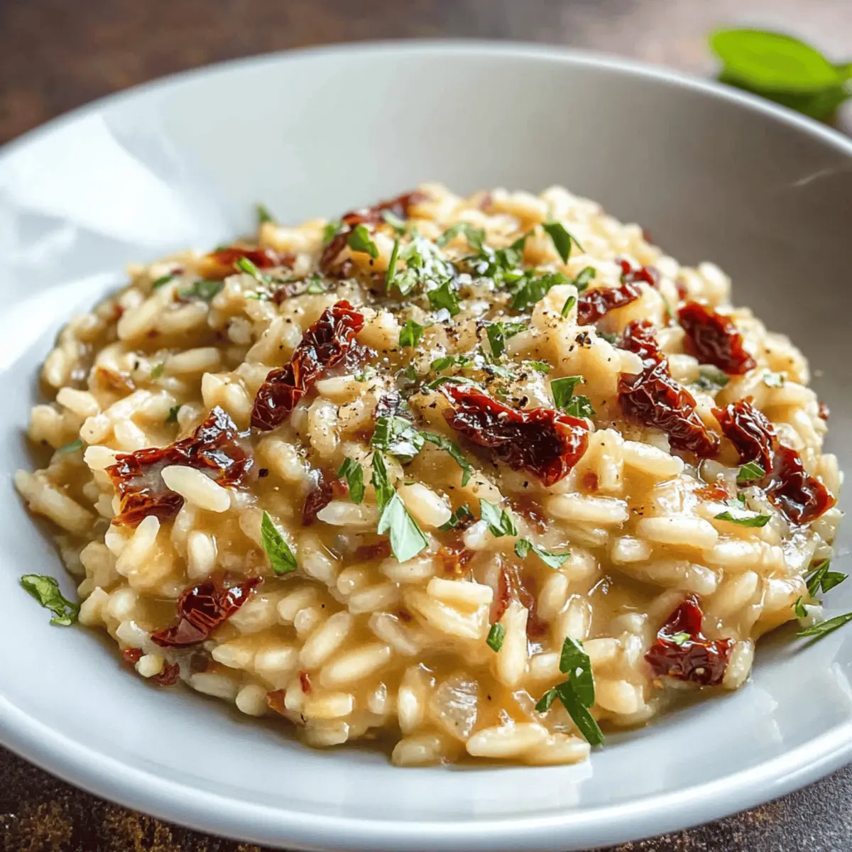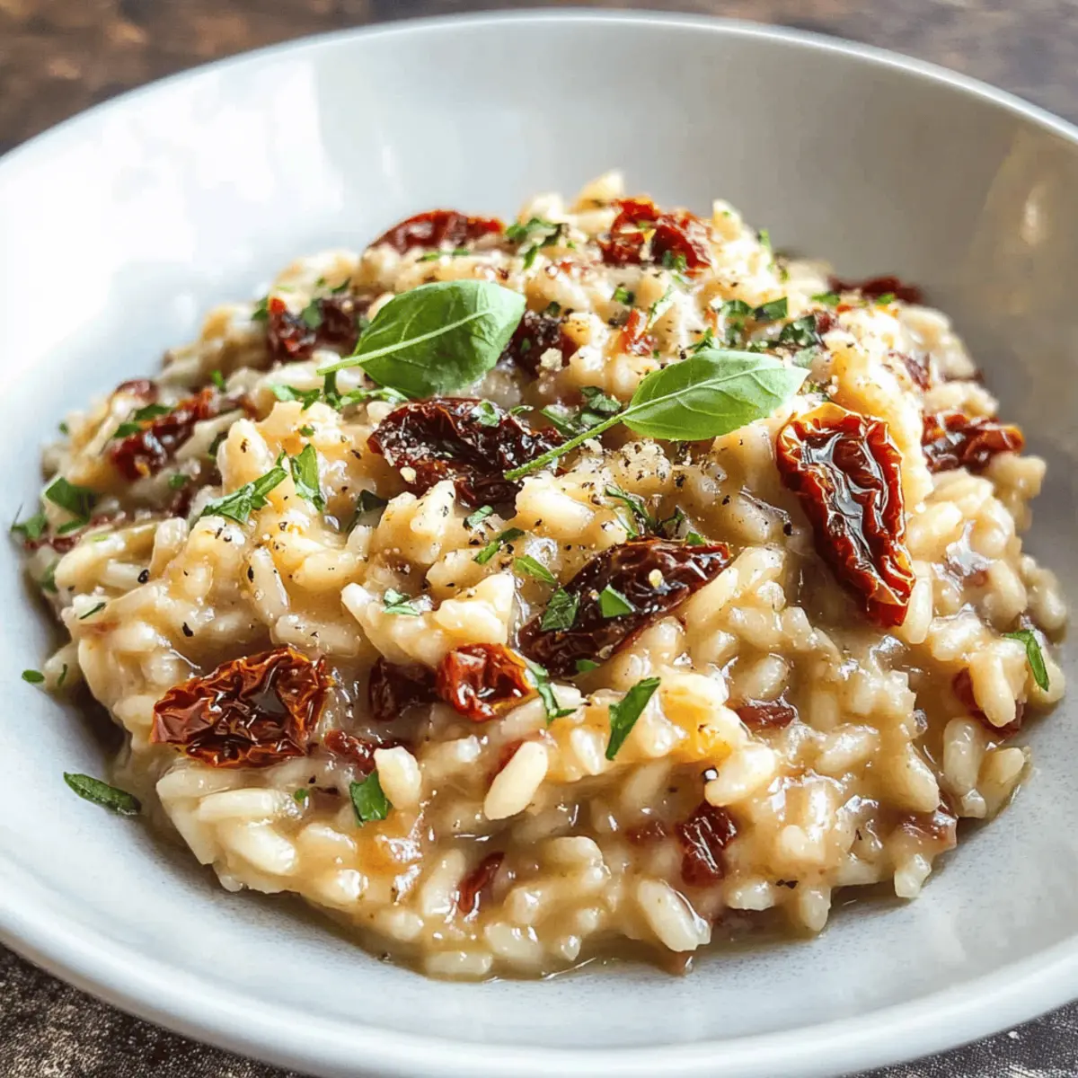 Es war ein kühler Abend, und der Duft von frisch gekochtem Risotto durchzog die Küche. Das ist der Moment, in dem ich regelmäßig eine neue, köstliche Kombination ausprobiere. Heute möchte ich euch mit meinem Rezept für Sonnengetrocknete Tomatenrisotto begeistern – ein Gericht, das nicht nur wunderbar cremig ist, sondern auch in nur 30 Minuten zubereitet werden kann. Perfekt für ein schnelles Abendessen unter der Woche, darf bei mir der köstliche Geschmack von süßen, sonnengetrockneten Tomaten und frischem Basilikum selbstverständlich nicht fehlen. Zudem ist dieses Risotto eine großartige Option für alle, die glutenfreie und vegetarische Gerichte schätzen. Neugierig geworden, wie einfach ihr dieses geschmackliche Erlebnis nach Hause bringen könnt? Warum wird dieses Risotto Ihr Favorit? Einfachheit in der Zubereitung: Ihr benötigt nur grundlegende Kochkenntnisse, um dieses Sonnengetrocknete Tomatenrisotto zuzubereiten. Cremige Textur: Die perfekte Kombination aus Arborio-Reis und frischem Parmesan sorgt für eine unwiderstehliche Cremigkeit. Vielseitigkeit: Ergänzt mit frischen Kräutern oder Gemüse, kann dieses Gericht spielend leicht variieren – von Spinat bis zu Pilzen, alles ist möglich! Schnell zubereitet: In nur 30 Minuten auf dem Tisch, ideal für hektische Abende. Gesund und nährend: Diese glutenfreie, vegetarische Mahlzeit bringt nicht nur Geschmack, sondern auch Nährstoffe in eure Ernährung. Hol dir weitere Inspiration für dein nächstes Gericht mit unseren köstlichen Variationen! Zutaten für Sonnengetrocknete Tomatenrisotto • Entdecke die perfekten Zutaten für ein unvergessliches Risotto-Erlebnis! Für die Basis: Olivenöl – sorgt für einen reichen Geschmack und hilft beim Sautieren der Gemüse. Zwiebel – bringt Süße und Tiefe ins Gericht; fein hacken für ein gleichmäßiges Garen. Gemüsebrühe – dient als Kochflüssigkeit und verleiht der Speise zusätzlichen Geschmack; für nicht-vegane Optionen kann Hühnerbrühe verwendet werden. Sonnengetrocknete Tomaten – sorgen für eine angenehme süß-saure Note; in der Brühe 1 Minute einweichen, wenn nicht bereits gehackt. Knoblauch – intensiviert den Geschmack; fein hacken, um das volle Aroma freizusetzen. Arborio-Reis – sorgt für die cremige, stärkehaltige Basis; unbedingt nicht durch Langkornreis ersetzen! Trockener Weißwein – verleiht dem Gericht eine angenehme Säure; alternativ zusätzliche Gemüsebrühe verwenden. Parmesan – bringt Umami und Cremigkeit; trott die Verwendung von Asiago für eine vegetarierfreundliche Option. Frische Kräuter (Petersilie/Basilikum) – sorgen für Garnitur und Frische; eine Mischung aus beidem verstärkt den Geschmack. Für die Garnitur: Frischer Basilikum – bringt ein weiteres Aromastück ins Gericht und erfrischt den Gaumen. Frische Petersilie – fügt einen herben Hauch hinzu und sorgt für lebendige Farbe. Dieses Sonnengetrocknete Tomatenrisotto wird Ihnen mit diesen köstlichen Zutaten und einem Genussmoment voller Geschmack sicher ans Herz wachsen! Schritt-für-Schritt-Anleitung für Sonnengetrocknete Tomatenrisotto Step 1: Zwiebeln anbraten In einem großen, hochrandigen Topf erhitzen Sie bei mittlerer bis niedriger Temperatur das Olivenöl. Fügen Sie die fein gehackte Zwiebel hinzu und lassen Sie sie unter ständigem Rühren etwa 6 Minuten lang weich werden, bis sie zart und transparent ist. Achten Sie darauf, dass sie nicht braun wird, damit das Risotto eine angenehme Süße erhält. Step 2: Brühe vorbereiten Während die Zwiebeln garen, bringen Sie in einem separaten Topf die Gemüsebrühe zum Köcheln. Geben Sie die sonnengetrockneten Tomaten in die Brühe und lassen Sie sie für 1 Minute ziehen, damit sie weich werden. Dieses Aroma wird die Basis Ihres Sonnengetrocknete Tomatenrisottos intensivieren und perfekt dazu passen. Step 3: Tomaten entfernen Entfernen Sie die sonnengetrockneten Tomaten mit einem Schöpflöffel aus der Brühe und lassen Sie sie beiseite. Halten Sie die Brühe warm, während Sie mit der Zubereitung des Risottos fortfahren. Dies sorgt dafür, dass die Temperatur konstant bleibt und das Risotto gleichmäßig kocht. Step 4: Knoblauch hinzufügen Fügen Sie nun den fein gehackten Knoblauch zu den weichen Zwiebeln hinzu und braten Sie ihn für etwa 1 Minute an. Rühren Sie alles kontinuierlich um, damit der Knoblauch sein volles Aroma entfalten kann, ohne zu verbrennen. Diese Kombination verleiht dem Sonnengetrocknete Tomatenrisotto eine köstliche Geschmacksbasis. Step 5: Arborio-Reis einrühren Streuen Sie den Arborio-Reis über die Zwiebel-Knoblauch-Mischung und rühren Sie kräftig um, damit jeder Reis-Korn mit Öl umhüllt ist. Geben Sie die zuvor beiseitegelegten sonnengetrockneten Tomaten zurück in den Topf. Löschen Sie die Mischung mit dem trockenen Weißwein ab und lassen Sie ihn unter Rühren kurz einkochen, bis er fast vollständig absorbiert ist. Step 6: Brühe nach und nach hinzufügen Fügen Sie die warme Brühe nach und nach hinzu, indem Sie jeweils ½ Tasse hinzufügen und durchgehend rühren, bis die Flüssigkeit absorbiert ist. Dies kann 15 bis 20 Minuten dauern. Achten Sie darauf, dass der Reis al dente bleibt, damit das Sonnengetrocknete Tomatenrisotto weich und cremig wird. Step 7: Parmesan einmischen Wenn der Reis die gewünschte Konsistenz erreicht hat, rühren Sie den geriebenen Parmesan unter und schmecken Sie das Risotto mit Salz und Pfeffer ab. Das Risotto sollte nun eine herrlich cremige Textur haben, und die Aromen der sonnengetrockneten Tomaten und des Käses sollten perfekt harmonieren. Step 8: Mit frischen Kräutern garnieren Servieren Sie das Sonnengetrocknete Tomatenrisotto warm und garnieren Sie es mit frischen Kräutern wie Basilikum und Petersilie. Dies bringt nicht nur Farbe, sondern auch einen zusätzlichen Frischekick, der dieses köstliche Gericht abrundet. Genießen Sie die Aromen und die cremige Textur! Tipps für das beste Sonnengetrocknete Tomatenrisotto Hochr