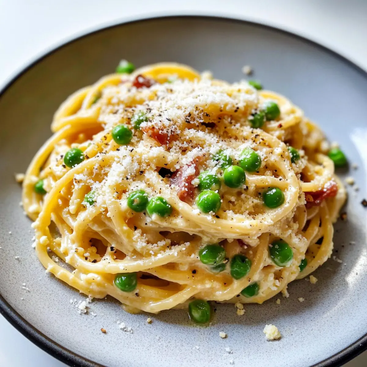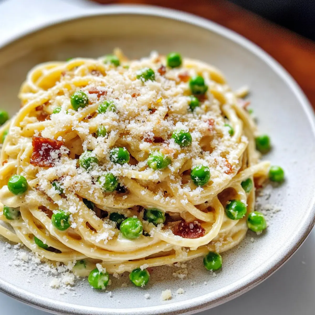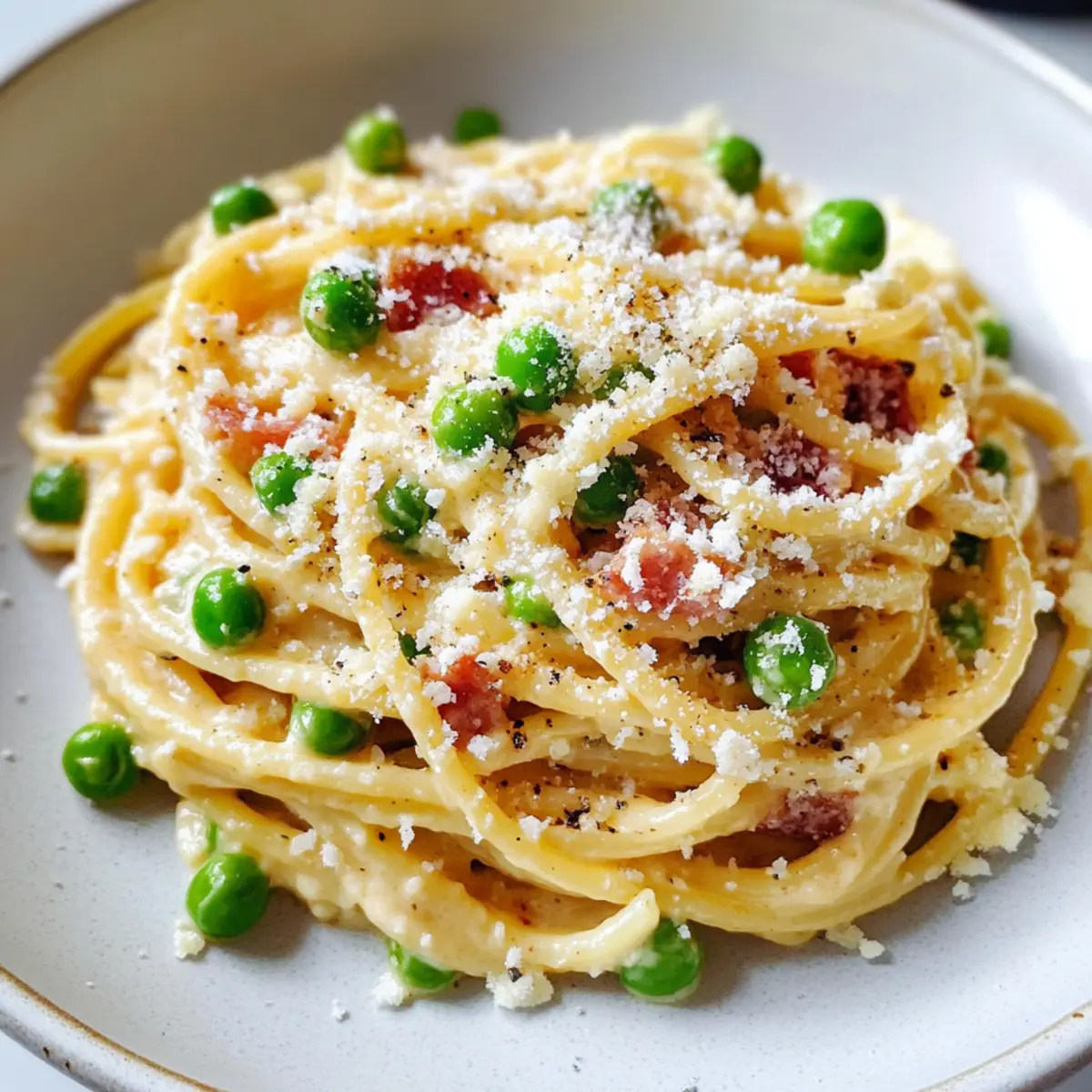 In einem kleinen italienischen Bistro, umgeben von dem verlockenden Duft frisch gekochter Pasta, erlebte ich mein erstes “Carbonara”-Moment. Eine Schüssel Spaghetti Carbonara mit süßen Erbsen und knusprigem Pancetta vor mir, und der erste Biss war eine Offenbarung – zart, cremig und mit einer perfekten Balance aus herzhaftem und frischem Geschmack. Diese Spaghetti Carbonara ist nicht nur ein wunderbares Komfortessen, das ebenso schnell zubereitet ist wie köstlich, sondern auch ein Familienliebling, der selbst an hektischen Abenden begeistert. Mit einfachen Zutaten zaubern wir ein Gericht, das den müden Puls des Alltags besänftigt. Bist du bereit, in die Welt der italienischen Küche einzutauchen und das Geheimnis dieser köstlichen Kreation zu entdecken? Warum wirst du dieses Rezept lieben? Einfachheit: Diese Spaghetti Carbonara erfordert keine aufwendigen Kochkünste. Mit nur wenigen Zutaten bereitest du im Handumdrehen ein herrliches Gericht zu. Reiche Aromen: Die Kombination aus knusprigem Pancetta und süßen Erbsen bringt ein harmonisches Geschmacksprofil, das deine Geschmacksnerven verwöhnt. Vielseitigkeit: Ob mit frischen Kräutern oder einer vegetarischen Variante – dieses Rezept lässt sich ganz nach deinem Geschmack anpassen. Familienfreundlich: Ideal für ein schnelles Abendessen unter der Woche, die ganze Familie wird begeistert sein! Ein Hauch Italien: Genieße das Gefühl eines italienischen Bistros direkt in deiner Küche und bringe das klassische Komfortessen auf den Tisch! Praktische Tipps: Vergiss nicht, die Eier auf Zimmertemperatur zu bringen, um die perfekte, cremige Sauce zu erhalten. Diese kleinen Details machen den Unterschied! Zutaten für Spaghetti Carbonara • Für alle Liebhaber der Spaghetti Carbonara: Hier ist alles, was du brauchst! Für die Sauce Eier – Sie verleihen der Sauce eine cremige Textur. Tipp: Verwende sie bei Zimmertemperatur für eine bessere Emulgierung. Eigelb – Macht die Sauce besonders reichhaltig. Tipp: Zusätzliche Eigelbe sorgen für eine cremigere Konsistenz. Pecorino Romano – Diese Käseart bringt eine salzige Tiefe. Tipp: Eine Mischung mit Parmesan verstärkt den Geschmack. Parmesan – Ergänzt den Pecorino und fügt zusätzliches Aroma hinzu. Tipp: Für reichhaltigen Genuss die beiden Käsesorten kombinieren. Für die Pasta Spaghetti – Die traditionelle Pastavariante für dieses Rezept. Tipp: Du kannst jede beliebige Pastaform verwenden, aber Spaghetti ist klassisch. Für das Gemüse Erbsen – Fügen eine süße Frische hinzu. Tipp: Gefrorene Erbsen sind eine praktische Alternative. Für das Fleisch Pancetta – Gibt ein intensives, herzhaftes Aroma. Tipp: Wenn du einen rauchigeren Geschmack magst, kannst du auch Bacon verwenden. Für die Würze Großzügig gemahlener Pfeffer – Bringt die nötige Schärfe. Tipp: Frisch gemahlener Pfeffer sorgt für das beste Aroma. Olivenöl – Ist zum Anbraten der Pancetta ideal. Tipp: Verwende Olivenöl für den zusätzlichen Geschmack; alternatives Öl funktioniert ebenfalls. So einfach ist das! Diese Zutaten vereinen sich, um dir ein unvergessliches Spaghetti Carbonara Erlebnis zu bieten, das du und deine Lieben lieben werden. Schritt-für-Schritt-Anleitung für Spaghetti Carbonara mit Erbsen und Pancetta Step 1: Wasser zum Kochen bringen Einen großen Topf mit gesalzenem Wasser füllen und auf hoher Hitze zum Kochen bringen. Achte darauf, dass das Wasser kräftig sprudelt, bevor du die Pasta hinzufügst. Dies ist der erste Schritt, um perfekte Spaghetti Carbonara zuzubereiten, die später al dente sein werden. Step 2: Ei-Mischung zubereiten In einer großen Rührschüssel die Eier, Eigelbe, Pecorino Romano und Parmesan mit einer Prise Salz sowie reichlich schwarzem Pfeffer kräftig verquirlen. Diese Mischung wird später die cremige Sauce für deine Spaghetti Carbonara und sollte während der Zubereitung der Pasta bereit sein. Step 3: Pancetta anbraten Erhitze in einer großen Pfanne bei mittlerer Hitze etwas Olivenöl. Gib die Pancetta hinzu und brate sie für etwa 5–7 Minuten, bis sie goldbraun und knusprig ist. Entferne die Pancetta und lasse sie auf einem Küchentuch abtropfen, um überschüssiges Fett zu entfernen und den Geschmack zu intensivieren. Step 4: Erbsen garen Falls nötig, füge etwas mehr Olivenöl in die Pfanne hinzu und brate die Englisch Erbsen für etwa 3–4 Minuten, bis sie zart sind. Diese süßen Erbsen werden deiner Carbonara eine frische Note verleihen. Stelle die Pfanne dann vom Herd und halte sie beiseite. Step 5: Spaghetti kochen Wenn das Wasser kocht, füge die Spaghetti hinzu und koche sie gemäß den Anweisungen auf der Verpackung, bis sie al dente sind – das dauert in der Regel etwa 8–10 Minuten. Reserviere eine Tasse Kochwasser, bevor du die Spaghetti abtropfst, da dieses Wasser später für die Sauce wichtig ist. Step 6: Pasta kombinieren Gib die abgetropften Spaghetti zurück in die heiße Pfanne, in der die Erbsen sind. Füge die knusprige Pancetta hinzu und gieße die Ei- und Käsemischung darüber, während du die Mischung gut durchmischt. Die Hitze sollte jetzt aus sein, um zu verhindern, dass die Eier stocken und die Sauce gerinnt. Step 7: Cremigkeit einstellen Füge nach Bedarf schrittweise das reservierte Pasta-Kochwasser hinzu, bis die Sauce die gewünschte cremige Textur erreicht. Achte darauf, die Spaghetti Carbonara gut zu vermengen, sodass sich die Sauce gleichmäßig verteilt und perfekt an der Pasta haftet. Step 8: Anrichten und servieren Die Spaghetti Carbonara auf Teller verteilen und nach Belieben mit zusätzlichem Pecorino Romano und frisch gemahlenem Pfeffer garnieren. Serviere die Pasta sofort, wenn sie noch heiß ist, damit du den vollen Geschmack und die cremige Textur genießen kannst. Aufbewahrungstipps für Spaghetti Carbonara Raumtemperatur: Die Spaghetti Carbonara können nicht bei Raumtemperatur aufbewahrt werden, um die Frische und Sicherheit zu gewährleisten. Kühlschrank: Reste der Spaghetti C