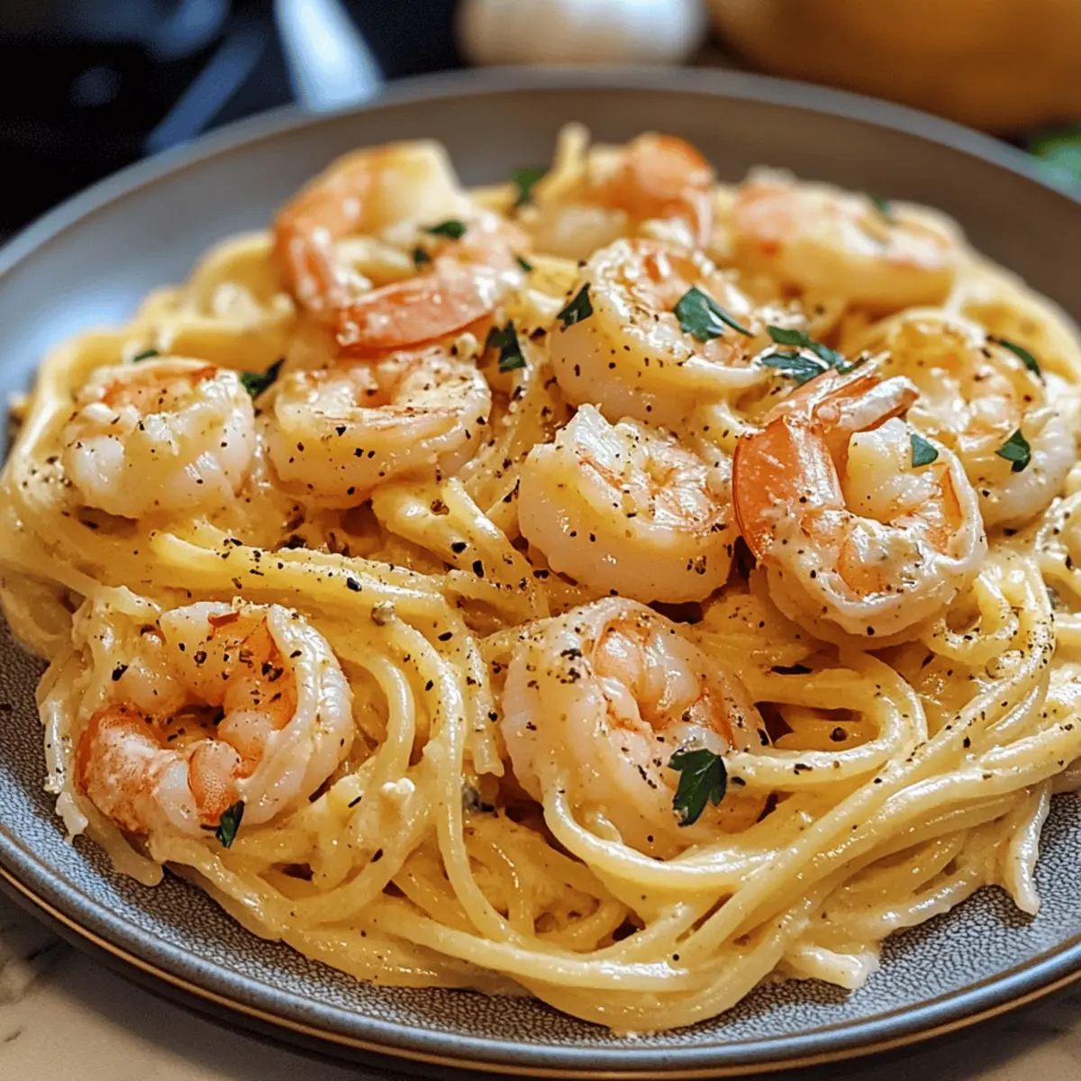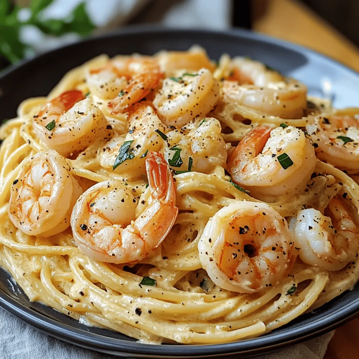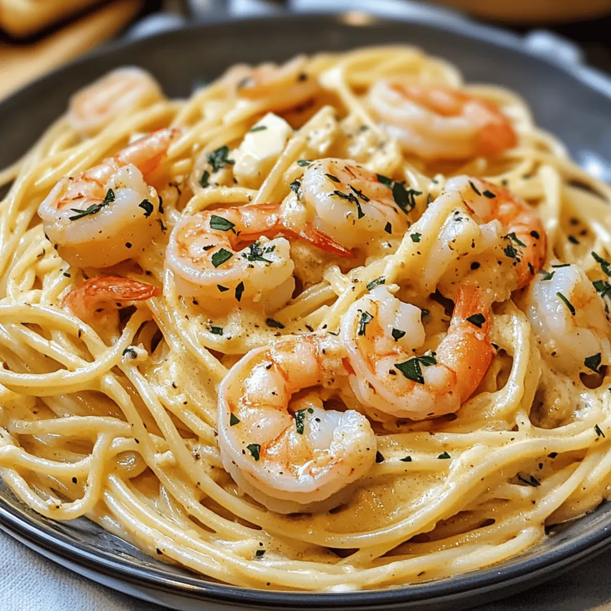 Ein unerwarteter Besuch stand vor der Tür, und während ich in der Küche stand, um ein schnelles Abendessen zuzubereiten, überkam mich der Gedanke: Was könnte ich zaubern, das sowohl lecker als auch schnell ist? Sofort fiel mir mein Rezept für Spaghetti mit Garnelen in Frischkäsesauce ein. In weniger als 30 Minuten verschmelzen hier zarte Garnelen mit al dente Spaghetti und einer samtigen Frischkäsesauce zu einem köstlichen Gericht, das zum Schlemmen einlädt. Perfekt für ein leichtes Mittagessen oder ein entspanntes Abendessen, begeistert dieses Gericht mit einer harmonischen Balance aus Texturen und Aromen. Und das Beste? Es ist nicht nur ein echter Genuss, sondern auch kinderleicht zubereitet. Neugierig, wie man diesen Genuss auf den Tisch bringt? Lass uns gleich loslegen! Warum wirst du dieses Rezept lieben? Einfachheit pur: Die Zubereitung ist kinderleicht und erfordert nur grundlegende Küchenskills – perfekt, um auch in Eile ein schmackhaftes Gericht zu zaubern. Reiche, cremige Aromen: Die Kombination aus Frischkäse und zarten Garnelen sorgt für ein geschmackliches Erlebnis, das begeistert. Schnell zubereitet: In weniger als 30 Minuten steht dieses köstliche Gericht auf dem Tisch, ideal für ein spontanes Dinner. Vielfältige Variationen: Du kannst die Garnelen leicht durch Hähnchen oder sogar saisonales Gemüse ersetzen, um dein eigenes Touch hinzuzufügen. Vielseitig einsetzbar: Ob für ein Date oder ein schnelles Familienessen, dieses Gericht kommt immer gut an! Perfekte Textur: Die cremige Sauce ummantelt die Spaghetti wunderbar und sorgt für einen harmonischen Genusstrack. Wenn du mehr über ähnliche Rezepte erfahren möchtest, schaue dir auch unsere anderen schnellen Pastarezepte an! Spaghetti mit Garnelen in Frischkäsesauce Zutaten Für die Spaghetti • Spaghetti – Hauptzutat für die perfekte Pasta-Basis; wähle Vollkorn- oder glutenfreie Varianten nach Wunsch. Für die Sauce • Garnelen – Diese verleihen dem Gericht eine süße und umami-reiche Note; frische oder gefrorene Garnelen sind ideal (gut auftauen, wenn gefroren). • Olivenöl (Olive oil) – Sorgt für eine reichhaltige Basis; kann durch Butter oder neutrales Öl ersetzt werden. • Zwiebel (Onion) – Aromatische Grundlage für die Sauce; gelbe oder weiße Zwiebel funktionieren am besten. • Knoblauch (Garlic) – Fügt einen starken, aromatischen Geschmack hinzu; frischer Knoblauch ist vorzuziehen, aber Knoblauchpulver geht auch. • Frischkäse (Cream cheese) – Gibt der Sauce die nötige Cremigkeit; kann durch Mascarpone für einen anderen Geschmack ersetzt werden. • Gemüsebrühe (Vegetable broth) – Verleiht der Sauce Tiefe; Hühnerbrühe kann für zusätzlichen Geschmack verwendet werden. • Sahne (Cream) – Wenn gewünscht, für extra Cremigkeit; kann durch mehr Brühe oder eine pflanzliche Option ersetzt werden. • Zitronensaft (Lemon juice) – Bringt Frische in das Gericht; kann durch Limettensaft ersetzt oder ganz weggelassen werden. • Salz & Pfeffer (Salt & Pepper) – Verstärkt den Gesamteindruck; nach Geschmack hinzufügen und an die Salzigkeit der Brühe anpassen. • Chiliflocken (Chili flakes) – Optional für eine Schärfe; für ein mildes Gericht weglassen. • Frische Kräuter (Fresh herbs) – Zum Garnieren am Ende; Vorschläge sind Petersilie oder Basilikum. Dieses Rezept für Spaghetti mit Garnelen in Frischkäsesauce ist der perfekte Weg, um ein schnelles und schmackhaftes Gericht auf den Tisch zu bringen! Schritt-für-Schritt-Anleitung für Spaghetti mit Garnelen in Frischkäsesauce Step 1: Spaghetti kochen Bringe einen großen Topf mit ausreichend Wasser zum Kochen und salze es gut. Füge die Spaghetti hinzu und koche sie nach Packungsanweisung al dente, etwa 8-10 Minuten. Wenn die Spaghetti fertig sind, hebe dir etwa 100 ml des Nudelwassers auf, um es später für die Sauce zu verwenden, und lasse die Nudeln dann abtropfen. Step 2: Zwiebeln anbraten Erhitze in einer großen Pfanne bei mittlerer Hitze 2 Esslöffel Olivenöl. Füge die gewürfelte Zwiebel hinzu und brate sie etwa 3-4 Minuten lang an, bis sie weich und glasig ist. Dies gibt der Basis der Sauce einen aromatischen Geschmack, der wunderbar mit der cremigen Frischkäsesauce harmoniert. Step 3: Knoblauch hinzufügen Gib den gehackten Knoblauch in die Pfanne zu den Zwiebeln und brate ihn für etwa 1 Minute an, bis er angenehm duftet. Achte darauf, ihn nicht zu lange zu garen, damit er nicht verbrennt. Der frische Knoblauch wird der Sauce ein zusätzliches Aroma verleihen und das Gericht noch schmackhafter machen. Step 4: Garnelen garen Füge die aufgetauten Garnelen in die Pfanne hinzu und brate sie 2-3 Minuten lang, bis sie eine rosa Farbe annehmen und gut durchgegart sind. Achte darauf, dass die Garnelen nicht übergart werden, um eine zähe Textur zu vermeiden. Träufle etwas Zitronensaft über die Garnelen, um ihnen eine frische Note zu verleihen, und stelle sie dann kurz beiseite. Step 5: Sauce zubereiten Gib den Frischkäse, die Gemüsebrühe und optional die Sahne in die gleiche Pfanne und rühre bei mittlerer Hitze, bis eine glatte Sauce entsteht. Lasse die Mischung einige Minuten köcheln, damit sie etwas eindickt. Schmecke mit Salz, Pfeffer und optionalen Chiliflocken ab, um die Aromen zu intensivieren. Step 6: Spaghetti und Garnelen kombinieren Füge die abgetropften Spaghetti und die gebratenen Garnelen in die Pfanne zur Sauce hinzu. Mische alles gut, damit die Pasta gleichmäßig mit der cremigen Frischkäsesauce ummantelt wird. Bei Bedarf kannst du das reservierte Nudelwasser nach und nach hinzufügen, um die gewünschte Konsistenz der Sauce zu erreichen. Step 7: Anrichten und servieren Erhitze das Gericht in der Pfanne für eine weitere Minute, um sicherzustellen, dass alles gut durchgewärmt ist. Serviere die Spaghetti mit Garnelen in Frischkäsesauce auf Tellern und garniere sie großzügig mit frischen Kräutern wie Petersilie oder Basilikum. So erhält das Gericht eine fa