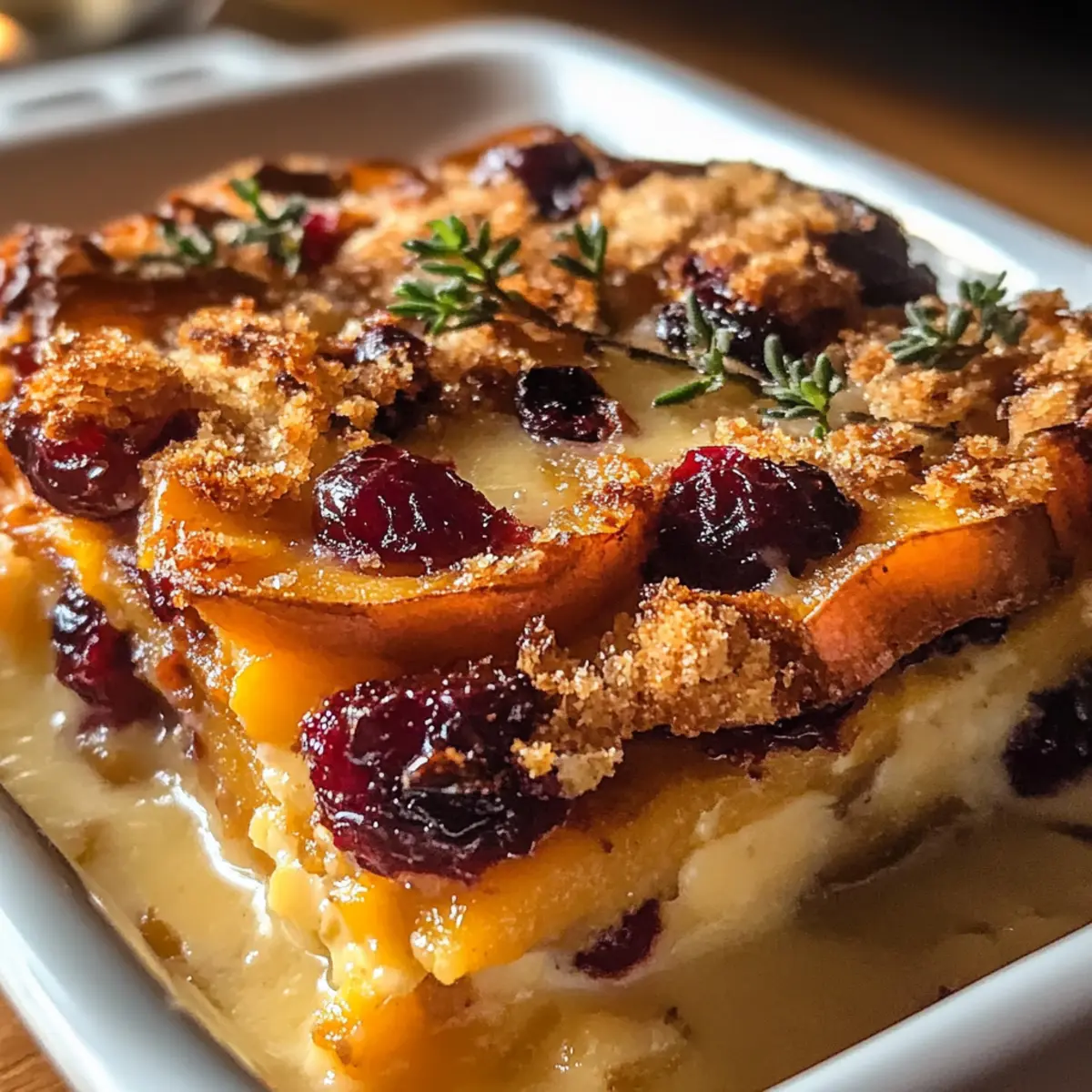 Stell dir vor, du öffnest deinen Ofen und wirst von einem verlockenden Aroma empfangen, das Erinnerung an festliche Feiertage weckt. Mein Rezept für das Süßkartoffel- und Preiselbeergratin bringt diese herzlichen Gefühle direkt auf deinen Tisch! Diese Kombination aus cremigen Süßkartoffeln und spritzigen Preiselbeeren ist nicht nur ein geschmacklicher Hochgenuss, sondern auch ein echter Publikumsmagnet, der als Beilage oder vegetarisches Hauptgericht dient. Besonders schön ist, dass du das Gratin im Handumdrehen zubereiten kannst – perfekt für all jene, die auch während der hektischsten Zeiten eine schmackhafte Mahlzeit zaubern möchten. Bist du bereit, dein nächstes Festmahl mit diesem köstlichen Rezept zu bereichern? Warum ist dieses Gratin so besonders? Einfachheit: Die Zubereitung ist schnell und erfordert nur grundlegende Kochfähigkeiten. Perfekt für hektische Tage! Herzhafter Geschmack: Die Kombination aus süßen Kartoffeln und spritzigen Cranberries sorgt für ein unvergessliches Geschmackserlebnis. Vielseitigkeit: Dieses Rezept kann leicht vegan oder glutenfrei zubereitet werden, sodass es für jeden geeignet ist – ideal für große Familientreffen oder festliche Anlässe. Nährstoffreich: Gefüllt mit Vitaminen aus Süßkartoffeln und Antioxidantien aus Cranberries, ist es eine gesunde Wahl, die auch köstlich ist. Gemütlicher Genuss: Der goldene, knusprige Belag macht jeden Bissen zu einem Vergnügen und bringt Wärme auf den Tisch – ein echtes Wohlfühlgericht. Wenn du auf der Suche nach weiteren tollen Festtagsrezepten bist, schau dir auch meine anderen vegetarischen Gerichte an, die ebenso einfach zuzubereiten sind! Süßkartoffel- und Preiselbeergratin Zutaten • Ein gesundes und herzhaftes Rezept für dein nächstes Festmahl! Für das Gratin Süßkartoffeln – bringen natürliche Süße und eine cremige Textur; aber Butternusskürbis ist eine gute Alternative. Frische Preiselbeeren – sorgen für die spritzige Note; gefrorene Preiselbeeren sind ebenfalls geeignet, achte darauf, sie vorher aufzutauen und abtropfen zu lassen. Schlagsahne – fügt Reichhaltigkeit hinzu und bindet die Schichten gut; für eine vegane Variante verwende Kokoscreme. Brauner Zucker – verstärkt die Süße und karamellisiert beim Backen; es sind keine nennenswerten Alternativen nötig. Zimt – bringt Wärme in den Geschmack; du kannst auch Muskatnuss für einen anderen Gewürzprofil verwenden. Salz & Pfeffer – verstärken den Gesamtgeschmack; hier sind keine Alternativen nötig. Gruyère-Käse – schmilzt perfekt und sorgt für einen herzhaften Belag; alternativ kannst du Cheddar, Mozzarella oder Feta verwenden. Semmelbrösel – geben einen knusprigen Belag; für eine glutenfreie Variante verwende glutenfreie Brösel. Step-by-Step Instructions für Süßkartoffel- und Preiselbeergratin Step 1: Ofen vorheizen Heize deinen Ofen auf 190 °C (375 °F) vor. Diese Temperatur sorgt dafür, dass das Süßkartoffel- und Preiselbeergratin später gleichmäßig gart und eine goldbraune Kruste bekommt. Während du auf das Vorheizen wartest, hast du genügend Zeit, die restlichen Vorbereitungen zu treffen. Step 2: Süßkartoffeln vorbereiten Schäle die Süßkartoffeln und schneide sie in dünne Scheiben. Bringe einen großen Topf mit gesalzenem Wasser zum Kochen und füge die Süßkartoffelscheiben hinzu. Koche die Kartoffeln 10-15 Minuten lang, bis sie zart sind, aber noch etwas Biss haben. Dies hilft, das Gratin gleichmäßig zu garen. Step 3: Süßkartoffeln schichten Sobald die Süßkartoffeln gekocht sind, lass sie gut abtropfen. Fette eine Auflaufform leicht ein und lege die Hälfte der Süßkartoffelscheiben leicht überlappend in die Form. Achte darauf, dass die Schichten gleichmäßig sind, um eine schöne Textur im fertigen Süßkartoffel- und Preiselbeergratin zu gewährleisten. Step 4: Preiselbeeren hinzufügen Verteile die Hälfte der frischen Preiselbeeren gleichmäßig über die erste Schicht der Süßkartoffeln. Die spritzigen Preiselbeeren bringen einen herrlichen Kontrast zur Süße der Kartoffeln. Diese Schichtung sorgt für ein ausgewogenes Geschmackserlebnis im gesamten Gratin. Step 5: Sahnemischung vorbereiten In einer großen Schüssel vermische die Schlagsahne, den braunen Zucker, den Zimt, das Salz und den Pfeffer gut miteinander. Gieße die Hälfte dieser Mischung gleichmäßig über die Schichten der Süßkartoffeln und Preiselbeeren. Diese Mischung wird später helfen, die Aromen zu binden und das Gratin cremig zu machen. Step 6: Wiederholen und schichten Wiederhole die Schichtung mit den restlichen Süßkartoffeln und Preiselbeeren. Achte darauf, die letzten Schichten gleichmäßig zu verteilen, um sicherzustellen, dass das Süßkartoffel- und Preiselbeergratin gut aussieht und gleichmäßig gart. Gieße dann die verbliebene Sahnemischung darüber. Step 7: Käse und Brösel hinzufügen Streue den geriebenen Gruyère-Käse gleichmäßig über die oberste Schicht des Gratins. Dieser verleiht dem Gericht eine schöne, knusprige Kruste. Streue auch die Semmelbrösel darüber, um zusätzlichen Crunch zu schaffen. Achte darauf, dass alles gleichmäßig verteilt ist. Step 8: Backen Schiebe die Auflaufform in den vorgeheizten Ofen und backe das Süßkartoffel- und Preiselbeergratin 30-35 Minuten lang. Es ist fertig, wenn die Oberseite goldbraun und blubbernd ist. Lass es nach dem Backen einige Minuten abkühlen, um das Servieren zu erleichtern. Expertentipps für Süßkartoffel- und Preiselbeergratin Oberste Schicht präparieren: Achte darauf, genug Käse und Semmelbrösel auf die oberste Schicht zu geben, damit das Gratin schön knusprig wird. Gleichmäßige Schichten: Schichte die Süßkartoffeln gleichmäßig, um eine gleichmäßige Garung und eine ansprechende Textur im fertigen Süßkartoffel- und Preiselbeergratin zu gewährleisten. Backzeit im Blick behalten: Überprüfe dein Gratin nach 30 Minuten; es sollte goldbraun und blubbernd sein. Lass es eini