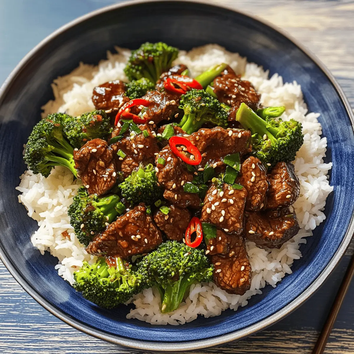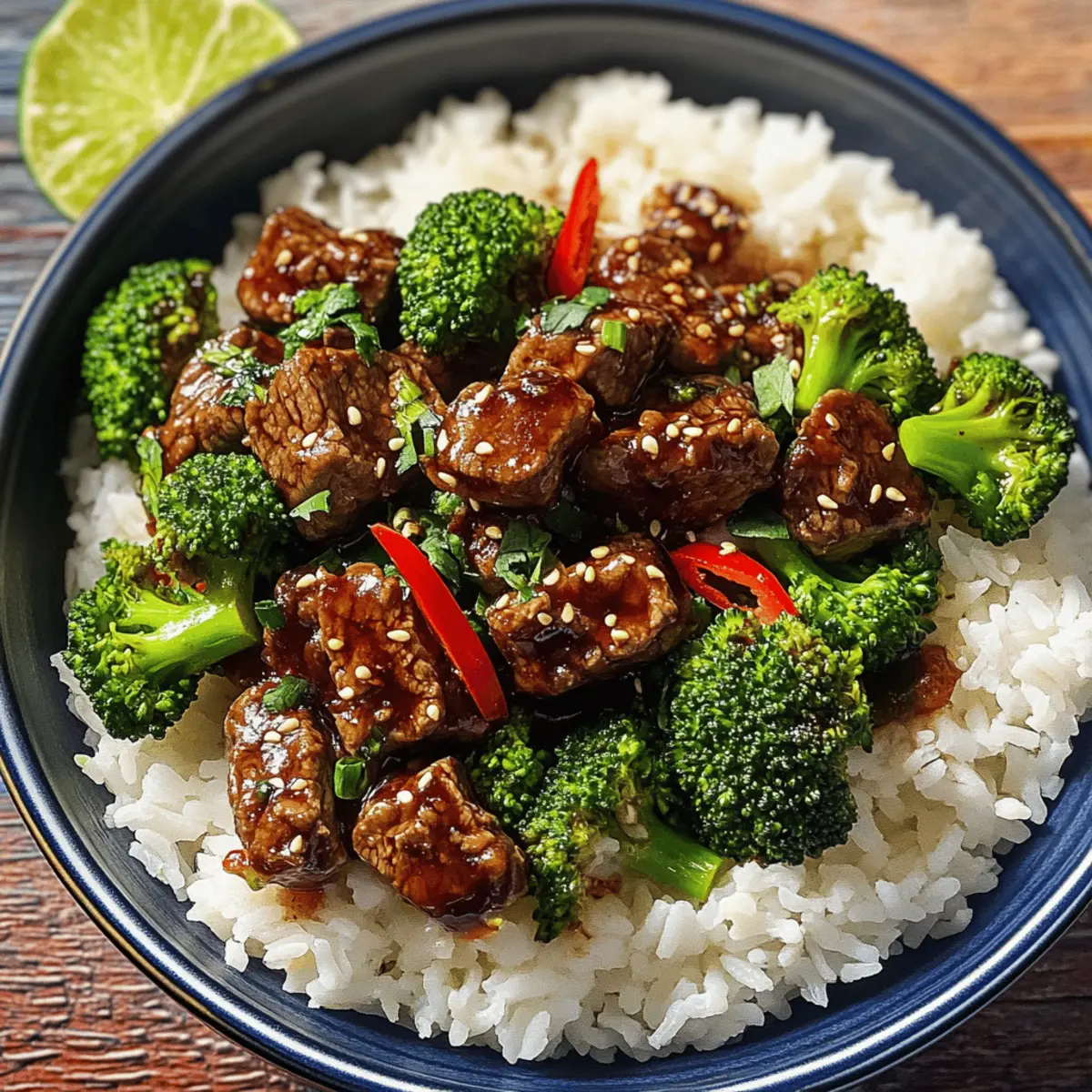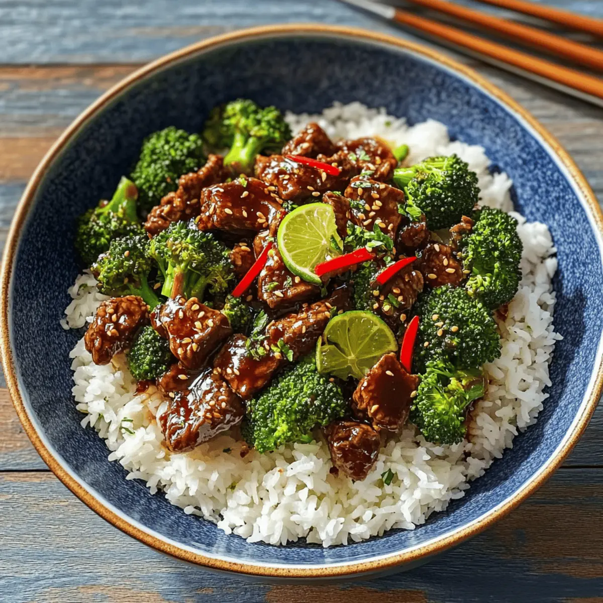 Eines Abends saß ich in meiner Küche und fragte mich, was ich zaubern könnte, um den Stress des Tages zu vertreiben. Plötzlich kam mir die Idee für ein völlig neues Gericht: Teriyaki-Rindfleisch und Brokkoli mit Ingwer-Limettenreis! Dieses Rezept ist nicht nur ein Genuss für die Sinne, sondern auch eine schnelle Lösung für alle, die unter Zeitdruck stehen. In nur 30 Minuten verwandeln sich frisches Gemüse und zartes Rindfleisch in eine köstliche Mahlzeit, die das Herz eines jeden asiatischen Kochliebhabers höher schlagen lässt. Mit dem Komfort eines schnellen Abendessens und der Möglichkeit, es mit anderen Gemüsesorten zu variieren, ist dieses Gericht perfekt für geschäftige Wochentage. Neugierig, wie du diesen köstlichen Geschmack in deiner eigenen Küche verwandeln kannst? Lass uns direkt loslegen! Warum wirst du dieses Rezept lieben? Schnelligkeit: In nur 30 Minuten zauberst du ein köstliches Gericht, perfekt für stressige Abende. Intensiver Geschmack: Die Kombination aus Teriyaki-Sauce, Ingwer und Limette verleiht dem Rindfleisch und Brokkoli einen unvergesslichen, aromatischen Kick. Vielseitigkeit: Dieses Rezept lässt sich leicht anpassen – tausche das Rindfleisch gegen Hähnchen oder Tofu aus, je nach Vorliebe! Gesunde Zutaten: Frisches Gemüse und hochwertige Proteine sorgen für eine nahrhafte Mahlzeit, die nicht nur sättigt, sondern auch gut tut. Beliebtheit: Dieses Gericht begeistert nicht nur dich, sondern auch Familie und Freunde – serviere es und genieße das Lob, das du dafür erhältst! Wenn du noch mehr Ideen brauchst, schau dir auch unsere Erdbeer Crunch Ideen an! Teriyaki-Rindfleisch und Brokkoli Zutaten Für das Rindfleisch Diced Steak (10 oz) – Das Hauptprotein, das für seine zarte Textur geschätzt wird; du kannst es auch durch Hähnchen oder Tofu ersetzen. Teriyaki-Sauce (4 oz) – Liefert einen tiefen Umami-Geschmack; glutenfreie Sojasauce ist eine gute Alternative. Chili Pepper (1 unit) – Verleiht dem Gericht Farbe und Schärfe; entferne die Kerne für weniger Hitze oder tausche sie gegen Paprika aus. Vegetable Oil – Zum Anbraten; alternativ kannst du Olivenöl oder Sesamöl für zusätzlichen Geschmack verwenden. Salt & Pepper – Essentiell für die Würze; nach Geschmack anpassen. Für das Gemüse Broccoli Florets – Fügt Textur und Nährstoffe hinzu; du kannst sie auch durch grüne Bohnen oder Zuckerschoten ersetzen. Ginger (1 thumb) – Verleiht dem Gericht aromatische Wärme und Würze; frischer Ingwer sorgt für den besten Geschmack. Für den Reis Jasmine Rice (¾ cup) – Eine duftende Basis, die Aromen aufnimmt; kann durch braunen Reis für eine gesündere Option ersetzt werden. Butter (1 tbsp) – Sorgt für Cremigkeit im Reis; vegane Butter kann als Alternative verwendet werden. Lime (1 unit) – Frischt das Gericht mit Säure auf; Zitronen sind eine gute Alternative, wenn Limonen nicht verfügbar sind. Tauch ein in die Welt der Aromen mit diesem köstlichen Teriyaki-Rindfleisch und Brokkoli! Schritt-für-Schritt-Anleitung für Teriyaki-Rindfleisch und Brokkoli Step 1: Zutaten vorbereiten Wasche, trockne und schneide die Brokkoliröschen in gleichmäßige Stücke. Schäle und hacke den Ingwer fein. Zeste die Limette und schneide sie in Viertel; schneide die Chili und entferne die Kerne, wenn du es weniger scharf magst. Lege alle Zutaten bereit, um einen reibungslosen Kochablauf für dein Teriyaki-Rindfleisch und Brokkoli zu gewährleisten. Step 2: Reis kochen In einem kleinen Topf erhitze 1 Esslöffel Öl bei mittlerer Hitze. Füge die Hälfte des gehackten Ingwers hinzu und brate ihn kurz an, bis er duftet. Gib den Jasminreis, 1¾ Tassen Wasser und eine Prise Salz hinzu. Bringe die Mischung zum Kochen, reduziere die Hitze, decke den Topf ab und lasse den Reis 15-18 Minuten sanft köcheln, bis das Wasser aufgesogen ist. Step 3: Brokkoli dämpfen Erhitze in einer großen Pfanne bei mittlerer Hitze etwas Wasser. Füge die Brokkoliröschen hinzu, decke die Pfanne ab und dämpfe sie 4-5 Minuten, bis sie leuchtend grün und zart sind. Nimm den Deckel ab, gib einen Schuss Öl, Salz und Pfeffer hinzu, und brate den Brokkoli für weitere 2-4 Minuten an, bis er weich, aber noch knackig ist. Step 4: Rindfleisch braten Trockne das gewürfelte Rindfleisch mit Küchenpapier ab und würze es mit Salz und Pfeffer. In der gleichen Pfanne, in der du den Brokkoli zubereitet hast, erhitze bei mittlerer bis hoher Hitze etwas Öl. Brate das Rindfleisch für 3-5 Minuten an, bis es gut gebräunt ist. Füge den restlichen Ingwer hinzu, dann die Teriyaki-Sauce und den Limettensaft. Lass alles zusammen kurz aufkochen. Step 5: Alles kombinieren Füge den gedämpften Brokkoli zur Rindfleischmischung in die Pfanne hinzu. Mische alles vorsichtig, damit die Geschmäcker sich gut verbinden und das Gemüse gleichmäßig mit der Teriyaki-Sauce überzogen wird. Lasse es kurz in der Pfanne, damit sich die Aromen entfalten können. Step 6: Reis auflockern Nimm den Reis vom Herd und rühre die Butter sowie die Limettenschale unter, bis sie geschmolzen und gut verteilt sind. Geschmacklich anpassen und dann den Reis auf Teller anrichten. Lege die Teriyaki-Rindfleisch und Brokkoli-Mischung darüber und garniere das Gericht nach Belieben mit Chili und Limettenvierteln. Expert Tips für Teriyaki-Rindfleisch und Brokkoli Steak vorbereiten: Achte darauf, das Rindfleisch gut abzutrocknen, bevor du es anbrätst. So erhältst du eine schön gebräunte Kruste! Brokkoli dämpfen: Überkoche den Brokkoli nicht, um die leuchtend grüne Farbe und den Biss zu bewahren. 4-5 Minuten sind ideal. Soße anpassen: Für eine süßere Teriyaki-Sauce kannst du Zucker nach Geschmack hinzufügen. Sei vorsichtig mit der Menge! Variationen nutzen: Experimentiere mit anderen Gemüsesorten wie Paprika oder Karotten, um deinem Teriyaki-Rindfleisch und Brokkoli zusätzlichen Geschmack zu verleihen. Würze in Schritten: Beginne beim Würzen mit einer kleinen Menge Salz und Pfeffer; so kann
