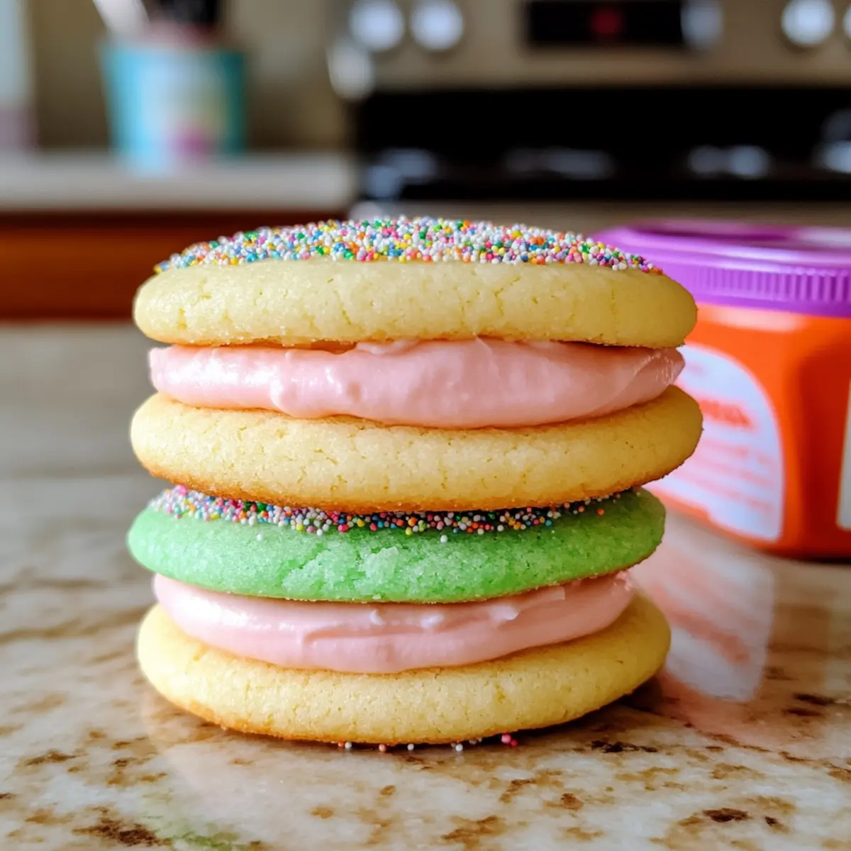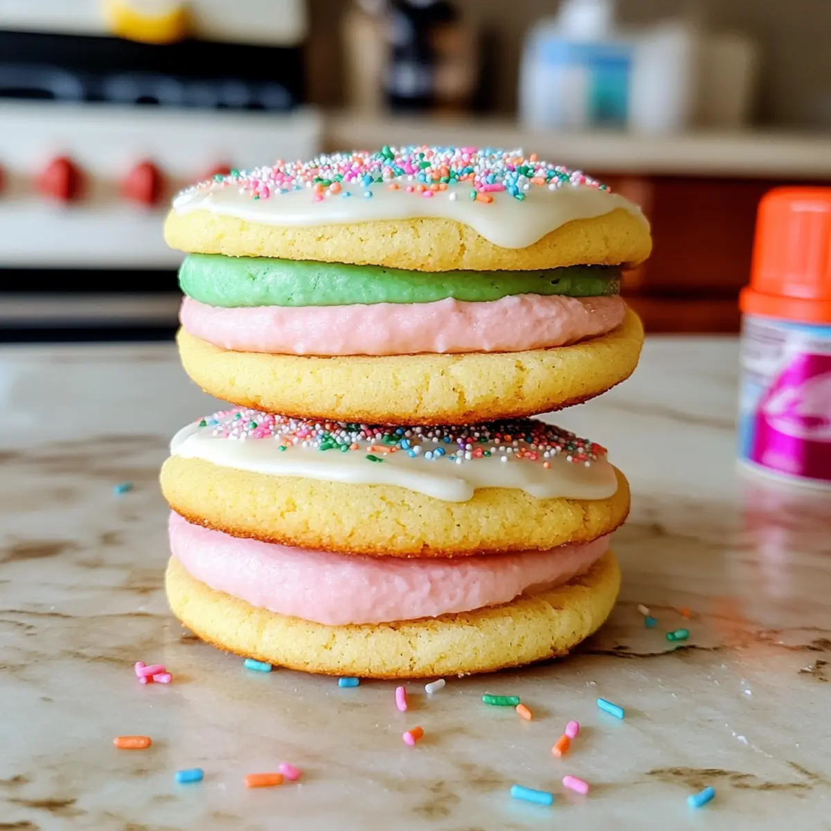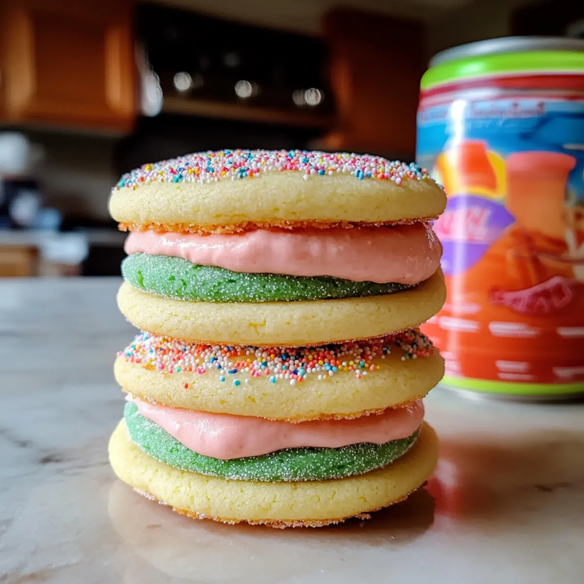 Die Farben strahlen förmlich vor Freude, als ich diese Teuflisch guten Sandwich-Zuckerplätzchen aus dem Ofen hole. Mit ihrer Kombination aus weich-cremigen Zuckerplätzchen und einem dekadentem Vanillefrosting sind sie eine echte Augenweide – ideal für jede Feier oder einfach zum Verwöhnen von Freunden und Familie. Diese süßen Versuchungen sind nicht nur schnell zubereitet, sondern auch mit minimalem Aufwand verbunden. Ob du ein Fest veranstaltest oder einfach nur einen süßen Snack für zwischendurch suchst, diese Kekse sind die perfekte Wahl. Neugierig, wie du sie farbenfroh gestalten kannst? Lass uns gemeinsam die magische Welt der “Wicked”-Inspiration erkunden! Warum sind diese Kekse so unwiderstehlich? Farbenfrohes Vergnügen: Die schimmernden Farben dieser Kekse sind ein echter Blickfang und bringen Freude auf jede Feier. Einfache Zubereitung: Selbst Kochneulinge können diese Teuflisch guten Sandwich-Zuckerplätzchen mit Leichtigkeit nachbacken – ein Rezept mit nur wenigen Zutaten! Vielfältige Gestaltung: Ob für eine Geburtstagsparty oder ein Theater-Event, die thematische Dekoration inspiriert von “Wicked” macht sie zu einem Hit. Weiche Textur: Mit ihrer Kombination aus zarten Zuckerplätzchen und cremigem Frosting sind diese Kekse das perfekte Zuhause für deine süßen Gelüste. Mach dir das Leben leichter, indem du die Plätzchen mit einem großartigen Glas Milch oder als Teil eines Dessert-Tabletts servierst und behalte die Reste in einem luftdichten Behälter für später auf! Teuflisch Gute Sandwich-Zuckerplätzchen Zutaten • Die perfekte Kombination aus Zutaten, um diese köstlichen Teuflisch guten Sandwich-Zuckerplätzchen zu zaubern! Für den Teig Betty Crocker™ Zuckerplätzchenmix – Die Basis, die Süße und Struktur hinzufügt; kann durch selbstgemachten Zuckerplätzchen-Teig ersetzt werden. Gesalzene Butter (1/2 Tasse, geschmolzen) – Sorgt für Reichtum und Feuchtigkeit; ungesalzene Butter ist eine gute Wahl für einen weniger salzigen Geschmack. Ei (1) – Bindet die Zutaten und hilft beim Aufgehen; vegane Alternativen sind ein Leinsamen-Ei oder Apfelmus. Echte Vanilleextrakt (1 Teelöffel) – Verstärkt den Vanillegeschmack in Keks und Frosting; Vanilleschotenpaste kann ebenfalls verwendet werden. Für die Dekoration Pastell-Gel-Lebensmittelfarbe (grün & pink) – Für die visuelle Attraktivität und das “Wicked”-Thema; beliebige andere Farben sind möglich oder ganz weglassen für einen klassischen Look. Betty Crocker™ Weiße Glitzer-Zuckerstreusel – Fügt Glanz und Textur hinzu; kann durch normale Streusel ersetzt oder weggelassen werden. Für das Frosting Betty Crocker™ Reichhaltiges & Cremiges Vanillefrosting – Definiert den Geschmack der Sandwich- Kekse; hausgemachte Buttercreme ist eine köstliche Alternative. Schritt-für-Schritt-Anleitung für Teuflisch gute Sandwich-Zuckerplätzchen Step 1: Ofen vorheizen und Backbleche vorbereiten Heize deinen Ofen auf 175°C vor und lege Backbleche mit Backpapier aus. Diese Vorbereitung ist wichtig, um sicherzustellen, dass die Teuflisch guten Sandwich-Zuckerplätzchen gleichmäßig backen und nicht anhaften. Während der Ofen vorheizt, kannst du alles andere vorbereiten. Step 2: Keksteig zubereiten In einer großen Schüssel kombinierst du die Zuckerplätzchenmischung, die geschmolzene Butter, das Ei und den Vanilleextrakt. Rühre alles gut um, bis ein geschmeidiger Teig entsteht. Diese Mischung wird die Grundlage deiner köstlichen Plätzchen, die weich und zart sind, sobald sie gebacken sind. Step 3: Teig färben Teile den Teig in zwei Portionen auf und füge jeweils die Pastell-Gel-Lebensmittelfarbe hinzu. Achte darauf, dass du gut miteinander vermischst, um schöne Farbtöne zu erhalten. Diese Schritte bringen Farbe und Freude in deine Teuflisch guten Sandwich-Zuckerplätzchen und verleihen ihnen das besondere “Wicked”-Design. Step 4: Teig auf das Backblech setzen Setze kleine Häufchen abwechselnd aus jedem gefärbten Teig auf das Backblech. Achte darauf, die Teighäufchen nicht zu übermischen, um den gewünschten Sch swirl-Effekt zu erhalten. Dieser Schritt ist entscheidend, um das visuelle Vergnügen deiner Kekse zu garantieren. Step 5: Kekse backen Backe die Kekse im vorgeheizten Ofen für 10-12 Minuten, bis die Ränder leicht goldbraun sind. Die Kekse sollten in der Mitte noch weich erscheinen, da sie beim Abkühlen fest werden. Diese bakten Notiz hilft dir, die perfekte Konsistenz zu erreichen, während du deine Teuflisch guten Sandwich-Zuckerplätzchen zubereitest. Step 6: Abkühlen lassen Lass die Kekse nach dem Backen auf dem Blech für einige Minuten ruhen, bevor du sie auf ein Kuchengitter versetzt, um ganz abzukühlen. Dies verhindert, dass das Frosting schmilzt, wenn du die Kekse zu köstlichen Sandwiches zusammenfügst. Sicherzustellen, dass sie vollständig abgekühlt sind, ist der Schlüssel zu perfekten Keksen. Step 7: Kekse füllen Sobald die Kekse abgekühlt sind, nimmst du das Vanillefrosting und verteilst es gleichmäßig auf der Unterseite eines Kekses. Setze dann einen zweiten Keks darauf, um ein Sandwich zu bilden. Diese süße Kombination wird die Teuflisch guten Sandwich-Zuckerplätzchen zu einem echten Genuss machen und jeden beeindrucken. Was passt zu Teuflisch guten Sandwich-Zuckerplätzchen? Erfreue dich an einer gemütlichen Tafelrunde, während du die köstlichen Kekse genießt, die sowohl die Augen als auch den Gaumen erfreuen werden. Frische Milch: Ein klassischer Begleiter, der die Süße der Kekse perfekt ausbalanciert und für ein nostalgisches Nascherlebnis sorgt. Fruchtige Beeren: Saftige Erdbeeren oder Himbeeren bringen eine frische, säuerliche Note, die den süßen Keksen etwas Leichtigkeit verleiht. Leicht gewürzter Kaffee: Eine Tasse aromatischer Kaffee unterstreicht die Butterigkeit der Kekse und macht dein Naschvergnügen noch genussvoller. Schlagsahne oder Vanilleeis: Diese cremigen Optionen bringen eine dekadente Note, di
