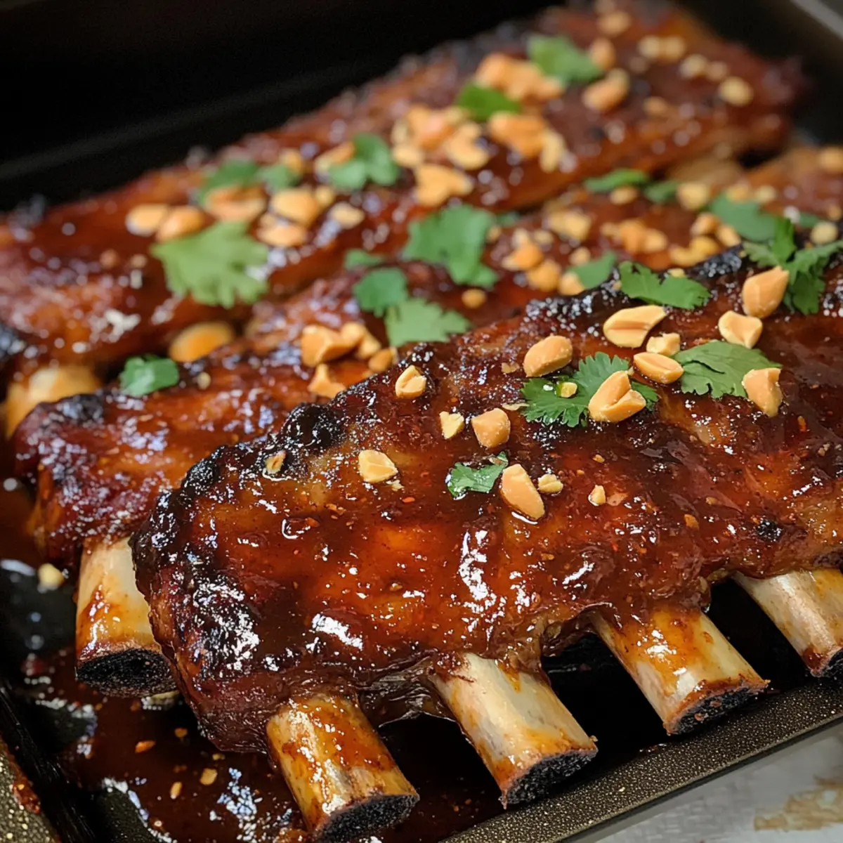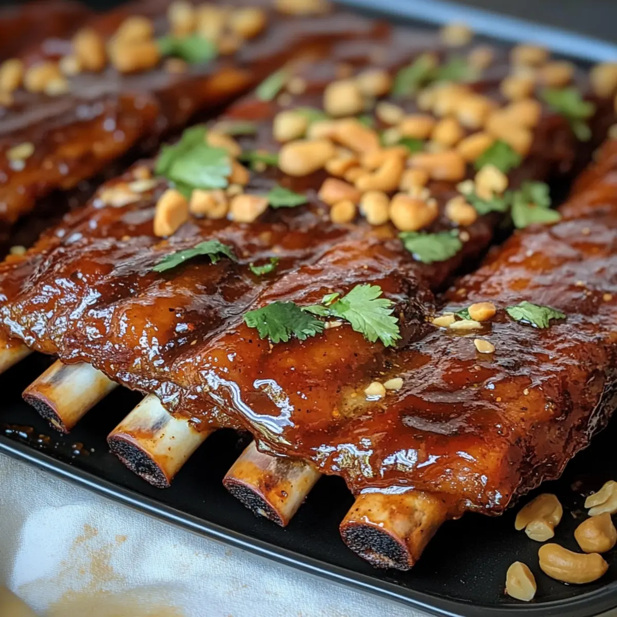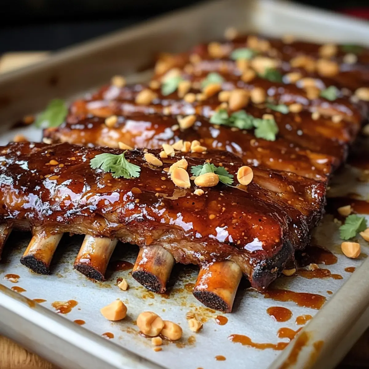Als ich neulich auf einem kleinen Markt in Bangkok schlenderte, überkam mich der unwiderstehliche Duft von gegrillten Rippchen in einer süßlichen, scharfen Soße. Diese Erinnerung inspirierte mich, meine eigene Version von thailändischen süßen Chili-Rippchen zu kreieren. Mit ihrer zarten, saftigen Textur und der klebrigen, süß-scharfen Glasur sind sie nicht nur ein echter Genuss für die Geschmacksknospen, sondern auch schnell zubereitet und perfekt für gesellige Anlässe. Die Kombination aus knusprigen Erdnüssen, frischen Kräutern und einem Spritzer Limette bringt den unverwechselbaren Streetfood-Charme direkt in deine Küche. Bist du bereit für eine köstliche Geschmacksreise? Warum werden Sie dieses Rezept lieben? Einfachheit: Mit nur wenigen Grundzutaten und klaren Schritten gelingt dir diese Köstlichkeit im Handumdrehen. Aromatische Vielfalt: Die Mischung aus süßer Chili-Sauce, frischem Ingwer und Limette sorgt für einen Geschmack, der begeistert und bleibt. Kombination aus Texturen: Zarte, saftige Rippchen gepaart mit knusprigen Erdnüssen und frischen Kräutern schaffen ein harmonisches Erlebnis. Gesellige Attraktivität: Ideal für Dinnerpartys oder Grillabende, die Rippchen sind ein echter Hingucker und werden deine Gäste in Staunen versetzen. Anpassungsfähigkeit: Passe die Schärfe nach deinem Geschmack an und experimentiere mit verschiedenen Fleischstücken, um neue Geschmacksrichtungen zu entdecken. Lass dich von diesen thailändischen süßen Chili-Rippchen verwöhnen und entdecke auch unsere anderen köstlichen Rezepte wie Asiatische Garnelenpfanne oder Thai-Curry-Suppe! Thailändische süße Chili-Rippchen Zutaten • Für die Rippchen Baby Back Ribs – Die Hauptzutat, die zartes und saftiges Fleisch liefert; wähle qualitativ hochwertige Rippchen für die beste Textur. Salz und Pfeffer – Unverzichtbare Gewürze, um den natürlichen Geschmack der Rippchen zu betonen. • Für die Glasur Thai Sweet Chili Sauce – Das Herzstück des Gerichts, das eine süßliche und scharfe Glasur kreiert. Sojasauce – Fügt Umami hinzu und hilft, die Süße auszugleichen. Fischsauce – Steigert die herzhaften Noten; kann für eine vegetarische Option weggelassen werden. Honig – Bringt zusätzliche Süße in die Glasur; Molasse kann bei Bedarf verwendet werden. Reisessig – Verleiht Säure, um die Süße auszugleichen; Apfelessig kann ebenfalls verwendet werden. Sriracha – Für eine optionale Schärfe; nach Geschmack anpassen. Knoblauch – Frisch gehackter Knoblauch sorgt für zusätzlichen Geschmack und Aroma. Frischer Ingwer – Fügt Wärme und Tiefe hinzu; kann in einer Notlage durch gemahlenen Ingwer ersetzt werden. Limettenschale und -saft – Macht das Gericht frisch und hell; Zitrone kann alternativ verwendet werden. • Für die Garnitur Geröstete Erdnüsse – Für zusätzlichen Crunch und Garnitur; können bei Allergien durch Sesamsamen ersetzt werden. Frischer Koriander – Bring frische und Farbe hin. Rote Chili oder Fresno-Pfeffer – Für zusätzliche Schärfe und Garnitur. Limettenviertel – Zum Servieren, um den Geschmack mit frischer Säure zu erweitern. Mit diesen Zutaten kreierst du unwiderstehliche thailändische süße Chili-Rippchen, die jeder lieben wird! Schritt-für-Schritt-Anleitung für Thailändische süße Chili-Rippchen Step 1: Rippchen vorbereiten Entferne die Silberhaut von der Rückseite der Rippchen und tupfe sie trocken. Würze die Rippchen großzügig mit Salz, Pfeffer, Knoblauchpulver, Zwiebelpulver und geräucherter Paprika. Lasse sie für 30 Minuten bei Zimmertemperatur ruhen, damit die Gewürze einziehen können und die Aromen optimal zur Geltung kommen. Step 2: Langsam backen Heize den Ofen auf 150 °C vor. Wickele die Rippchen fest in Alufolie und lege sie auf ein Backblech. Röste die Rippchen für 2,5 Stunden im Ofen, bis sie zart sind und das Fleisch fast vom Knochen fällt. Überwache die Rippchen gelegentlich, um sicherzustellen, dass sie gleichmäßig garen. Step 3: Glasur zubereiten Bereite in der Zwischenzeit die köstliche Glasur vor. Vermische in einem kleinen Topf die thailändische süße Chili-Sauce, Sojasauce, Fischsauce, Honig, Reisessig, Sriracha, gehackten Knoblauch, geriebenen Ingwer, Limettenschale und -saft. Lasse die Mischung bei niedriger Hitze 5-7 Minuten köcheln, bis sie glänzend und leicht eingedickt ist. Step 4: Glasieren und grillen Nehme die Rippchen aus dem Ofen und entferne vorsichtig die Alufolie. Bestreiche die Rippchen großzügig mit der vorbereiteten Glasur. Stelle den Ofen auf die Grillfunktion um und grille die Rippchen für 3-5 Minuten, bis sie klebrig und karamellisiert sind. Achte darauf, sie während des Grillens gut im Auge zu behalten, damit die Glasur nicht verbrennt. Step 5: Garnieren und servieren Sobald die Rippchen fertig sind, bestreue sie mit gehackten Erdnüssen, frischem Koriander und gewürfeltem Chili für zusätzlichen Geschmack und Farbe. Serviere die thailändischen süßen Chili-Rippchen mit Limettenvierteln an der Seite, um das Gericht mit frischer Säure abzurunden und den Geschmack zu intensivieren. Variationen für thailändische süße Chili-Rippchen Lass deiner Kreativität freien Lauf und passe dieses Rezept an deinen Geschmack an – es gibt so viele Möglichkeiten, die diese Rippchen noch köstlicher machen! Wärmere Variante: Erhöhe die Menge an Sriracha oder füge frische Chilis hinzu, um einen schärferen Kick zu erzielen. Perfekt für alle, die das Feuer lieben! Vegetarische Option: Verwende angebratene Jackfruit oder Tofuwürfel anstelle von Rippchen für eine fleischlose, aber ebenso herzhaft schmeckende Variante. Die Konsistenz wird dich überraschen! Asiatische Pfannennudeln: Serviere die Rippchen auf einem Bett aus gebratenen Reisnudeln für ein vollwertiges thailändisches Gericht. Verleihe den Nudeln mit Sojasauce und Gemüse einen extra Geschmack. Rohrzucker-Wachsmischung: Ersetze den Honig durch Rohrzucker, um der Glasur eine tiefere Ka