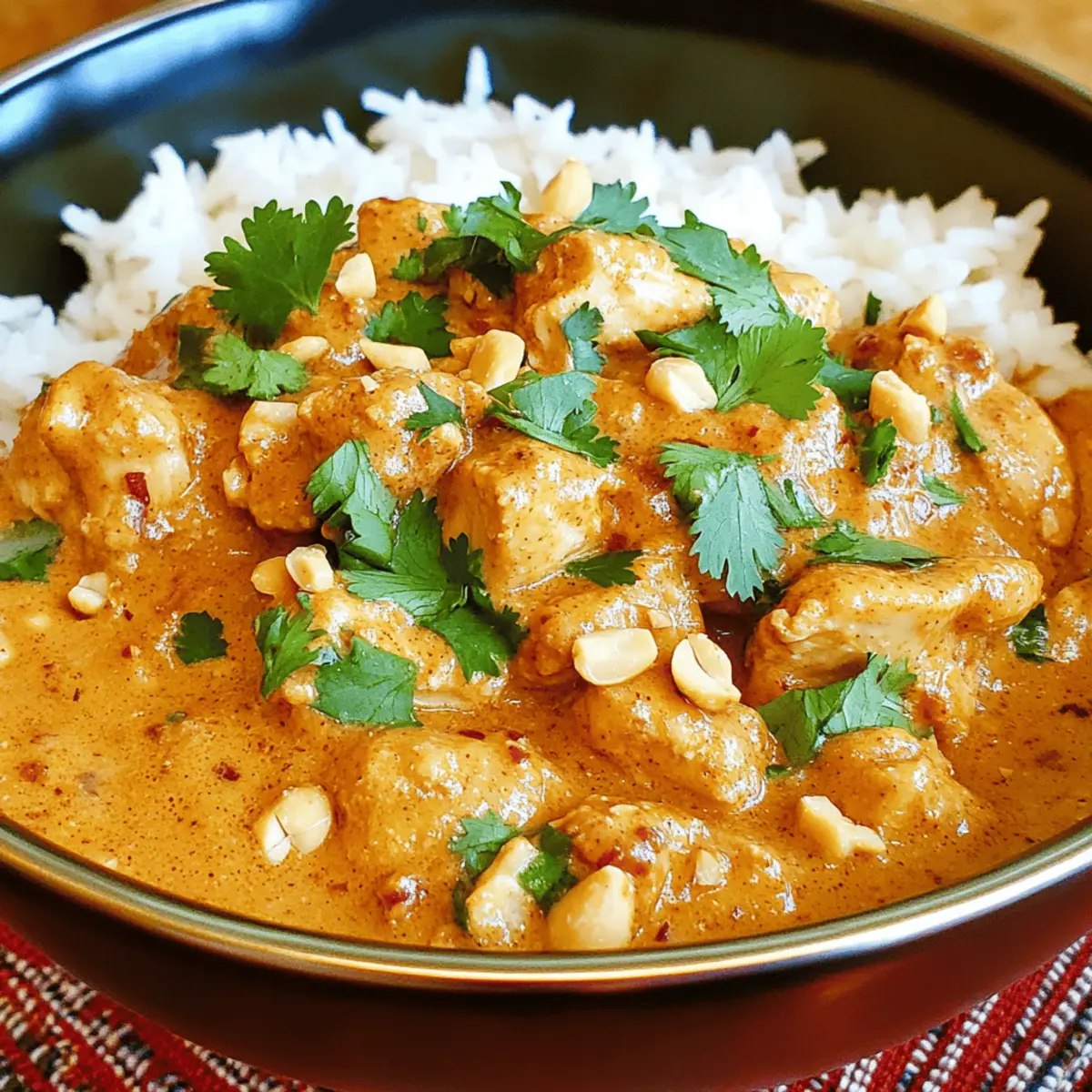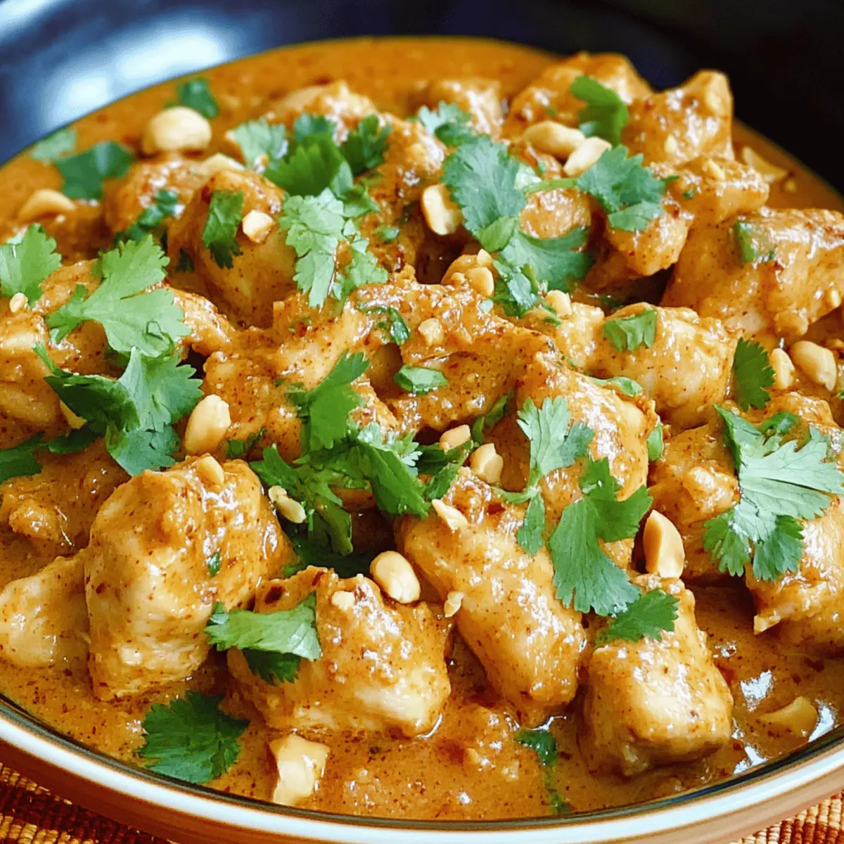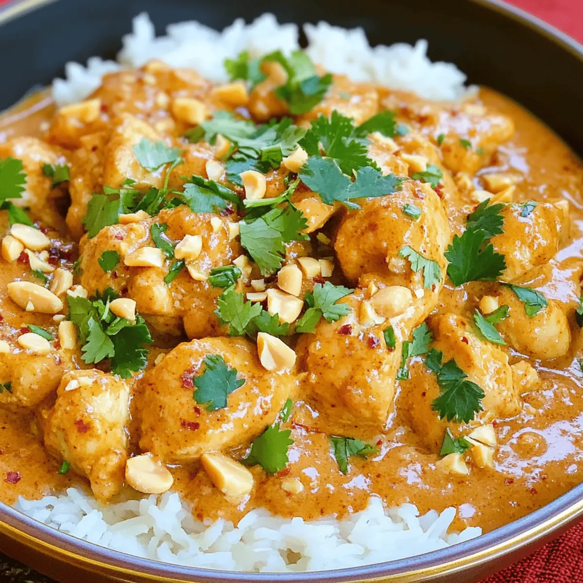 Wer könnte dem verlockenden Duft von aromatischem Erdnuss-Hühnchen widerstehen? Mein Rezept für thailändisches Erdnuss-Hühnchen vereint die exotische Süße von Kokosnuss und die Schärfe von Chili mit der cremigen Textur von Erdnussbutter – und das alles in nur 30 Minuten! Dieses Gericht ist nicht nur schnell und einfach zuzubereiten, sondern auch glutenfrei und perfekt für alle, die eine gesunde, schmackhafte Mahlzeit schätzen. Egal, ob du nach einer schnellen Abendessenlösung suchst oder Gäste beeindrucken möchtest, wirst du mit diesem Rezept allen ein Lächeln ins Gesicht zaubern. Neugierig, wie du mit wenigen Zutaten solche Aromen entfesseln kannst? Lass uns gemeinsam in die Welt der thailändischen Küche eintauchen! Warum solltest du dieses Rezept lieben? Einfachheit: Die Zubereitung ist unkompliziert, und du brauchst nur grundlegende Kochkenntnisse. Aromatische Vielfalt: Die Kombination aus Erdnussbutter, Kokosmilch und scharfer Sauce sorgt für eine Geschmacksexplosion. Schnell zubereitet: In nur 30 Minuten hast du ein köstliches Gericht auf dem Tisch – ideal für hektische Wochentage! Gesund und nahrhaft: Dieses Gericht ist glutenfrei, milchfrei und passt perfekt zu einer Paleo-Ernährung. Vielfältig: Du kannst mit verschiedenen Proteinen und Gemüsevariationen experimentieren, um es nach deinem Geschmack anzupassen. Probiere dazu auch das köstliche dampfen von Jasminreis, um die Aromen zu intensivieren! Thailändisches Erdnuss-Hühnchen Zutaten Hier sind alle Zutaten, die du für dieses köstliche thailändische Erdnuss-Hühnchen benötigst: Für das Hühnergericht: • Kochöl – für das Anbraten verwendest du am besten ein hoch erhitzbares Öl wie Raps- oder Pflanzenöl. • Gelbe Zwiebel – sorgt für Süße und Aroma; du kannst sie auch durch Schalotten ersetzen, wenn du einen milderen Geschmack bevorzugst. • Knoblauch (2 Zehen) – bringt Tiefe ins Gericht; frisch ist ideal, aber auch vorbereiteter Knoblauch tut seinen Dienst. • Ingwer (1 Zoll-Stück) – verleiht Wärme und Gewürz; kann bei Bedarf durch Ingwerpaste ersetzt werden. • Hähnchenbrust (1 Pfund, in mundgerechte Stücke geschnitten) – die Hauptproteinquelle, zart und schnell zuzubereiten; Hähnchenschenkel sind für mehr Geschmack ebenfalls geeignet. • Süß-Chili-Sauce (2 Esslöffel) – sorgt für die richtige Balance von Süße und Schärfe; du kannst auch selbstgemachte Chili-Sauce oder Sriracha für mehr Schärfe verwenden. • Tomatensauce oder Ketchup (2 Esslöffel) – trägt zur Textur und zum Geschmack der Sauce bei; für eine dickere Konsistenz empfehle ich Tomatenmark. • Cremige Erdnussbutter (3 Esslöffel) – der Hauptgeschmacksträger, der Cremigkeit hinzufügt; sowohl glatte Erdnussbutter als auch Mandelbutter sind gute Alternativen. • Chilipulver (1 Esslöffel) – bringt Schärfe ins Gericht; passe die Menge je nach Vorliebe an oder verwende frisch gehackte Chilis. • Dunkler Rohrzucker (1 Teelöffel, optional) – balanciert Schärfe und Süße; für die Paleo-Version einfach weglassen. • Kokosmilch (14 Unzen, ungesüßt) – für eine reichhaltige, cremige Sauce; du kannst auch Kondensmilch oder Schlagsahne verwenden. • Salz (1 Teelöffel) – verstärkt die Aromen; nach Geschmack anpassen. • Frischer Koriander, gehackt – dient als Garnitur für Frische und Farbe; optional, je nach Vorliebe. • Gehackte, geröstete Erdnüsse – sorgen für Crunch und optische Attraktivität; Sonnenblumenkerne sind eine gute nussfreie Alternative. Fühl dich frei, mit diesen Zutaten zu experimentieren und dein perfektes thailändisches Erdnuss-Hühnchen zu kreieren! Schritt-für-Schritt-Anleitung für Thailändisches Erdnuss-Hühnchen Step 1: Öl erhitzen Erhitze in einer großen Pfanne bei mittelhoher Hitze 2 Esslöffel Kochöl. Füge die grob gehackte gelbe Zwiebel hinzu und brate sie für etwa 5 Minuten, bis sie weich und glasig ist. Es ist wichtig, die Zwiebeln nicht zu braun werden zu lassen, um die Süße zu erhalten und die Basis für das thailändische Erdnuss-Hühnchen zu schaffen. Step 2: Knoblauch und Ingwer anbraten Rühre 2 gehackte Knoblauchzehen und ein Handelsstück Ingwer von 1 Zoll in die Pfanne und brate sie für weitere 2 Minuten an, bis sie duften. Achte darauf, dass die Hitze nicht zu hoch ist, damit der Knoblauch nicht anbrennt und bitter wird, um den vollen Geschmack für das Gericht zu bewahren. Step 3: Hähnchen hinzufügen Jetzt ist es an der Zeit, das 1 Pfund in mundgerechte Stücke geschnittene Hähnchenbrustfilet hinzuzufügen. Brate das Hähnchen für etwa 3-4 Minuten, bis es an den Rändern goldbraun ist und gerade durchgegart, aber noch saftig ist. In dieser Phase entfaltet das Thailändische Erdnuss-Hühnchen seinen ersten herzhaften Geschmack. Step 4: Saucenzutaten hinzufügen Gib 2 Esslöffel Süß-Chili-Sauce, 2 Esslöffel Tomatensauce oder Ketchup, 1 Esslöffel Chilipulver und 3 Esslöffel cremige Erdnussbutter in die Pfanne. Rühre alles gut durch, sodass sich die Aromen mischen und eine köstliche Mischung entsteht. Lass es für eine Minute kochen, um die Aromen zu intensivieren. Step 5: Kokosmilch einrühren Gieße 14 Unzen ungesüßte Kokosmilch in die Pfanne und bringe die Mischung zum Kochen. Senke dann die Hitze, decke die Pfanne ab und lasse das Ganze 20 Minuten köcheln. Dabei regelmäßig umrühren, um ein Anbrennen zu vermeiden und sicherzustellen, dass sich die Aromen gut verbinden, was für das Thailändische Erdnuss-Hühnchen entscheidend ist. Step 6: Sauce eindicken Sollte die Sauce zu dünn sein, kannst du die Konsistenz mit etwas in Wasser gelöstem Maisstärke eindicken. Lasse die Mischung eine weitere Minute köcheln, bis sie cremig und dickflüssig ist. Diese Phase gibt dem Gericht die gewünschte Textur und macht es perfekt zum Servieren. Step 7: Abschmecken und servieren Verfeinere das Thailändische Erdnuss-Hühnchen mit 1 Teelöffel Salz nach Geschmack. Es eignet sich hervorragend als Hauptgericht, ser
