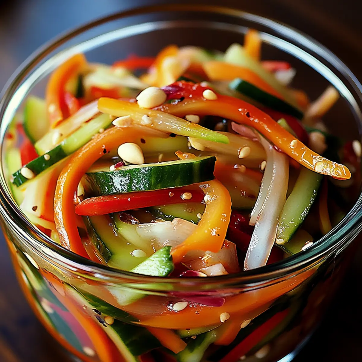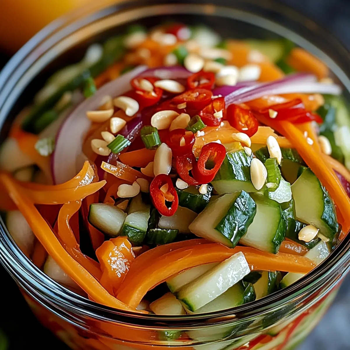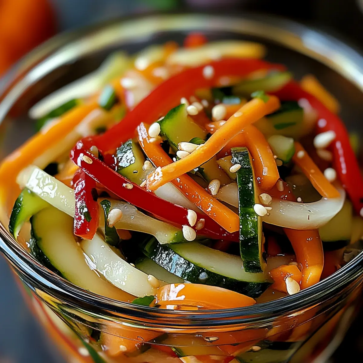 Eines Tages, während ich im Markt stöberte, erblickte ich die leuchtenden Farben und frischen Düfte der Gemüse, die nur auf ihre Verarbeitung warteten. Diese vietnamesische Gemüse-Einlegemisch ist nicht nur ein köstlicher Snack, sondern auch eine blitzschnelle, vegetarische Beilage, die jede Mahlzeit aufpeppt. Mit knackigen Karotten, daikon Radieschen und erfrischenden Gurken verpackt dieses Rezept alle Aromen, die wir lieben, in einem harmonischen, süß-sauren Genuss. Egal, ob du sie zu gegrilltem Fleisch servierst oder dir einfach ein leichtes Abendessen gönnst, diese Beilage bietet dir gleich zwei Vorteile: Sie ist super einfach zuzubereiten und hält sich prima im Kühlschrank. Wer kann da schon widerstehen? Lass uns gemeinsam die Geheimnisse dieses bunten Medleys entdecken! Warum ist dieses Rezept so einzigartig? Frische Aromen: Diese vietnamesische Gemüse-Einlegemisch bringt mit jedem Bissen einen aufregenden Geschmack auf den Tisch. Die knackigen Karotten, die scharfen Daikonradieschen und die erfrischenden Gurken bilden eine Geschmacksvielfalt, die einfach begeistert. Blitzschnell zubereitet: In nur wenigen Minuten hast du diese köstliche Beilage gezaubert, ideal für alle, die keine Zeit verlieren wollen. Perfekt als schnelle Beilage zu deinen Lieblingsgerichten! Gesund und leicht: Mit nur etwa 50 Kalorien pro Portion ist das Rezept eine gesunde Option, die sich ideal in jede Ernährung einfügt. Es ist eine tolle Möglichkeit, mehr Gemüse in deine Mahlzeiten zu integrieren. Vielfältig einsetzbar: Ob zu einem herzhaften Banh Mi oder als Beilage zu gegrilltem Fleisch, dieses Einlegemisch passt perfekt zu vielen Gerichten. Länger haltbar: Dank der einfachen Konservierung im Kühlschrank hält sich das Gemüse bis zu einer Woche – ideal, um mehrere Mahlzeiten vorauszuplanen! Entdecke die schnellen und frischen Möglichkeiten mit diesem Rezept und überzeuge dich selbst von der Vielfalt der Aromen! Vietnamesisches Gemüse-Einlegemisch Zutaten Für das Gemüse: Karotten – sorgen für Süße und Knackigkeit; verwende Babyküchen für eine zartere Textur. Daikon-Radieschen – bringen einen pfeffrigen Geschmack und Knackigkeit; kannst durch normale Radieschen ersetzen, wenn daikon nicht verfügbar ist. Gurken – sorgen für Hydration und eine erfrischende Knackigkeit; englische Gurken eignen sich gut, da sie keine Kerne haben. Rote Paprika – fügt Süße und Farbe hinzu; kann durch jede süße Paprikavariante ersetzt werden. Für das Einlegewasser: Wasser – dient als Basis für die Beize; kein Ersatz notwendig. Weißer Essig – bringt Säure, um die Süße auszugleichen; Apfelessig kann verwendet werden, wenn ein milderer Geschmack gewünscht ist. Zucker – süßt die Beize; Honig oder Agavendicksaft sind als Alternativen verwendbar. Salz – verstärkt den Geschmack und hilft, das Gemüse zu konservieren; verwende koscheres oder Meersalz. Knoblauch – fügt aromatische Tiefe hinzu; kann bei Bedarf durch Knoblauchpulver in geringeren Mengen ersetzt werden. Chili (optional) – sorgt für milde Schärfe; kann weggelassen oder durch eine Prise Chiliflocken ersetzt werden. Für die Garnitur: Frische Dill- und Minzblätter – werden zur Garnitur und für zusätzlichen Geschmack verwendet; können weggelassen werden, wenn gewünscht. Mit diesen Zutaten kannst du das vietnamesische Gemüse-Einlegemisch ganz einfach zu Hause zubereiten! Schritt-für-Schritt-Anleitung für Vietnamesisches Gemüse-Einlegemisch Step 1: Gemüse vorbereiten Schäle die Karotten und das Daikon-Radieschen, dann schneide sie in feine Streifen (Julienne). Die Gurke und die rote Paprika in dünne Scheiben schneiden, um gleichmäßige Stücke zu erzielen. Gib das gesamte vorbereitete Gemüse in eine große Schüssel und vermische es sanft, damit alles gut verteilt ist. Step 2: Beize erstellen In einem mittelgroßen Topf Wasser, weißen Essig, Zucker, Salz und den fein gehackten Knoblauch vermengen. Bei mittlerer Hitze unter ständigem Rühren erwärmen, bis sich Zucker und Salz vollständig aufgelöst haben. Achte darauf, die Mischung nicht zu kochen; sie sollte nur heiß genug sein, um die Zutaten zu vermengen. Step 3: Gewürze hinzufügen (optional) Wenn du die optionale Chili verwenden möchtest, rühre sie jetzt in die heiße Mischung ein. Lasse die Mischung für 1-2 Minuten leicht köcheln, damit sich die Schärfe gut entfalten kann. Dadurch erhält das vietnamesische Gemüse-Einlegemisch eine subtile Schärfe, die perfekt zu den süßen und sauren Aromen passt. Step 4: Gemüse einlegen Gieße die heiße Beize sorgfältig über das vorbereitete Gemüse in der Schüssel. Rühre sanft um, sodass alle Gemüsestücke gut mit der Beize bedeckt sind. Es ist wichtig, dass das Gemüse gleichmäßig mit der Flüssigkeit in Kontakt kommt, um gleichmäßiges Einlegen zu gewährleisten. Step 5: Abkühlen und lagern Lasse das Gemüse bei Raumtemperatur abkühlen, damit der Geschmack der Beize gut eindringen kann. Nachdem es abgekühlt ist, fülle das vietnamesische Gemüse-Einlegemisch in ein Glas oder einen luftdichten Behälter und stelle es in den Kühlschrank. Lass es mindestens 4 Stunden, besser über Nacht, ziehen, damit sich die Aromen optimal entfalten. Step 6: Servieren Vor dem Servieren kannst du das eingelegte Gemüse mit frischen Dill- und Minzblättern garnieren, um einen zusätzlichen Frischekick zu geben. Das vietnamesische Gemüse-Einlegemisch ist nun bereit, um als erfrischende Beilage zu gegrilltem Fleisch oder in Sandwiches serviert zu werden. Was passt gut zum Vietnamesischen Gemüse-Einlegemisch? Bereite dich darauf vor, mit vielfältigen Beilagen eine harmonische und köstliche Mahlzeit zu zaubern! Gegrilltes Fleisch: Besonders gut harmoniert das Einlegemisch mit saftigem, gegrilltem Hähnchen oder Rindfleisch. Die Kombination aus würzigen Aromen und knackigem Gemüse bringt frische Akzente auf den Teller. Banh Mi Sandwich: Füge das vietnamesische Gemüse-Einlegemisch zwischen z