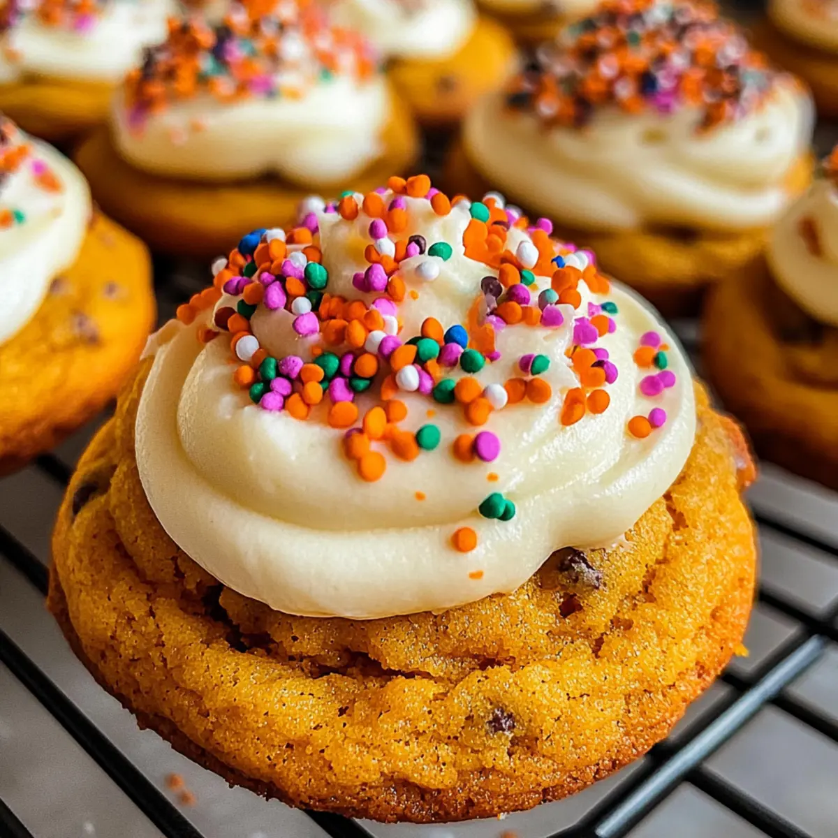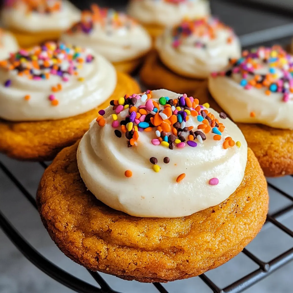 Sobald die Weichen Kürbisplätzchen vollständig abgekühlt sind, verteile die Frischkäseglasur großzügig auf jedem Keks. Du kannst auch bunte Sprinkles hinzufügen, um sie noch festlicher und ansprechender zu gestalten – ideal für jede herbstliche Feier.