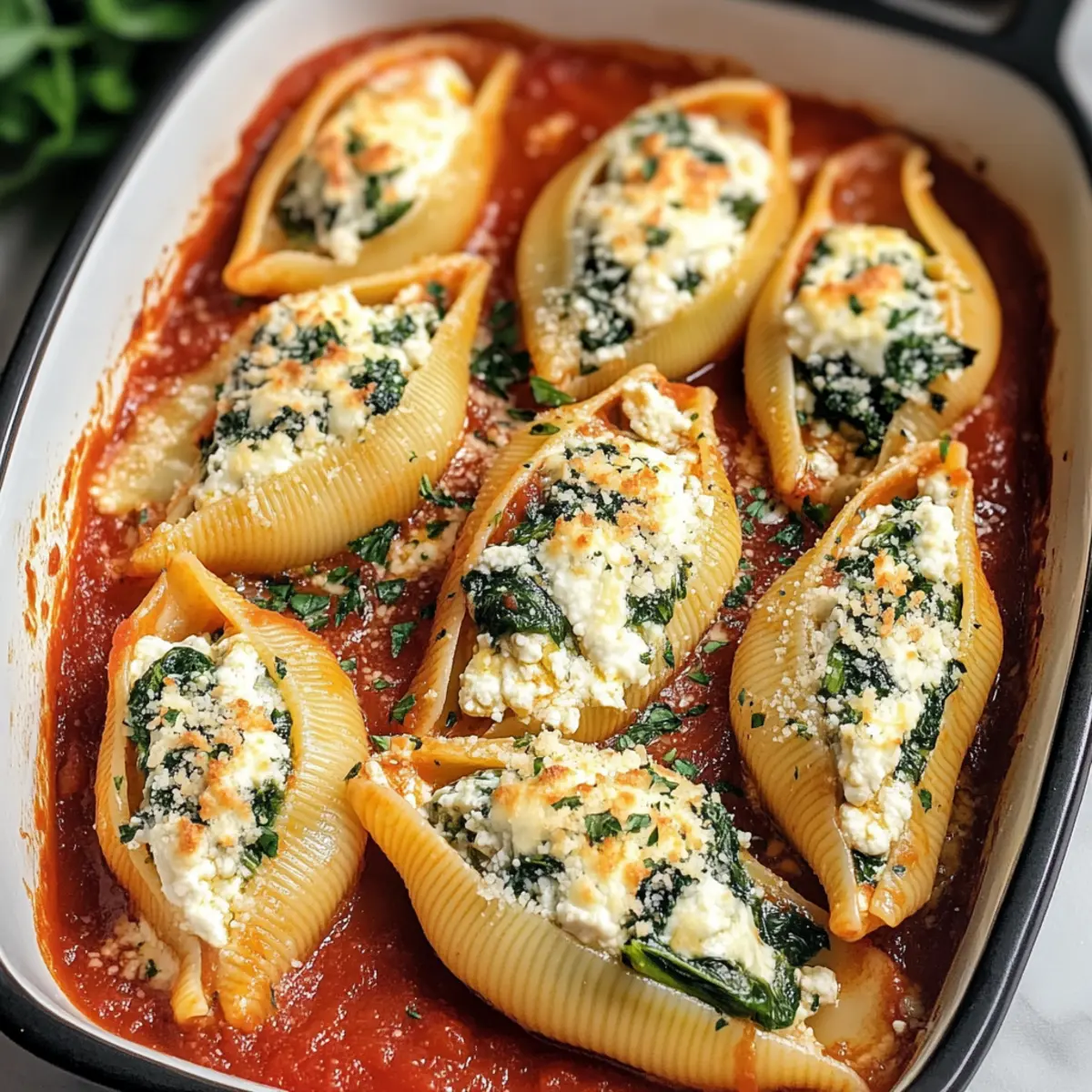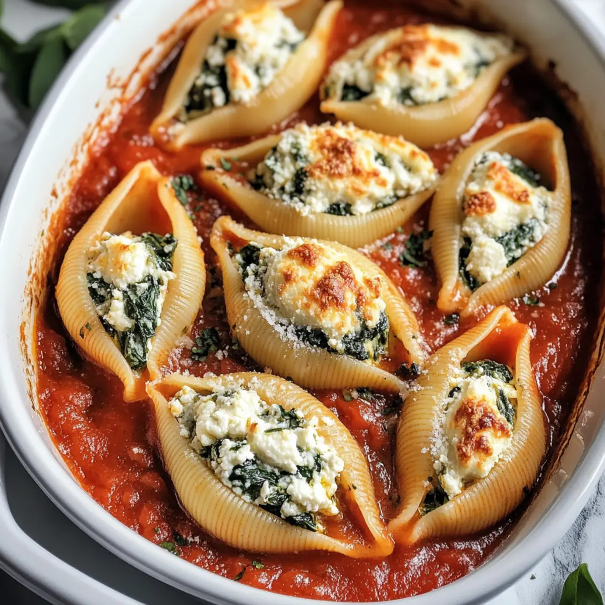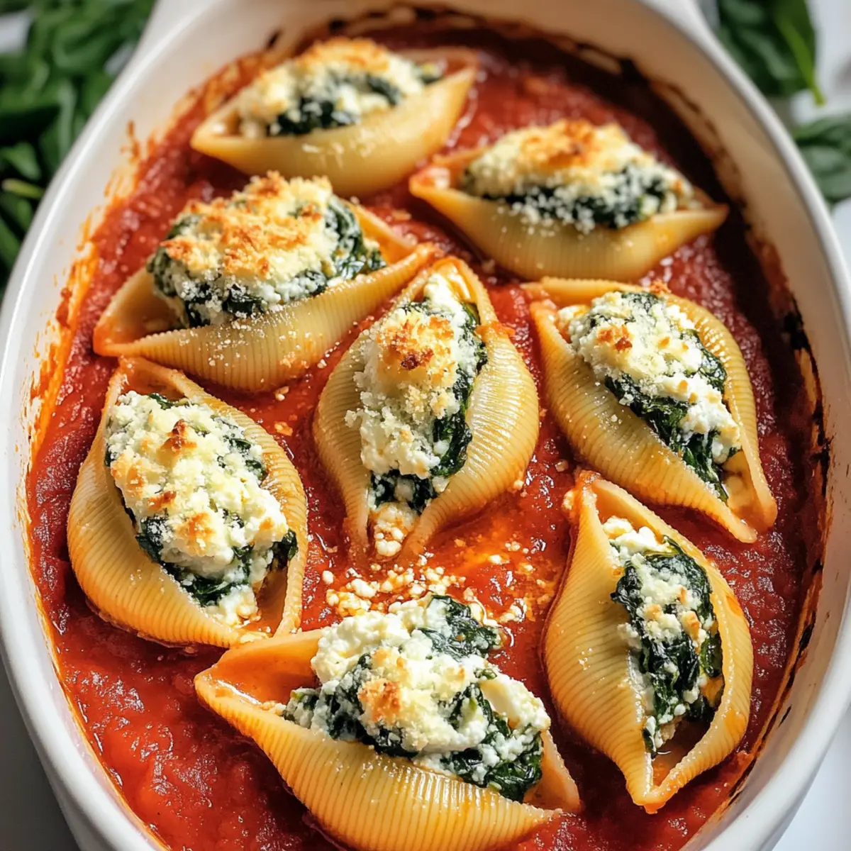 Leckere Weihnachtsgefüllte Muscheln mit einer cremigen Ricotta- und Spinatfüllung, ideal für festliche Anlässe.