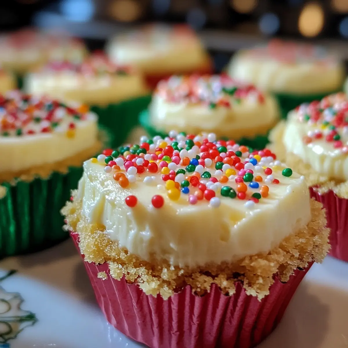 Vor dem Servieren fügen Sie die bunten Streusel auf jedem Weihnachtskäsekuchen hinzu, um einen festlichen Touch zu verleihen. Die dekorierten Käsekuchen sind dann bereit, serviert zu werden und werden sicherlich die Herzen Ihrer Gäste erobern. Genießen Sie diese Leckerbissen zu Ihren Feiertagsfeiern!