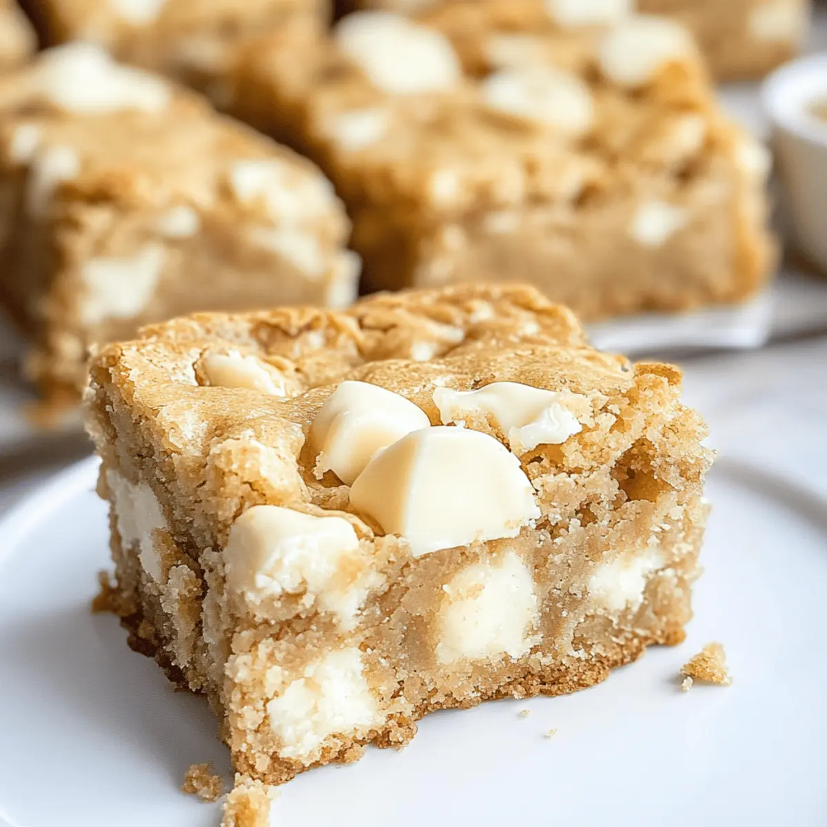 In einem kleinen Café, versteckt in einer ruhigen Gasse, entdeckte ich eines Tages die köstlichsten Weißen Schokoladen Blondies, die ich je probiert habe. Diese verführerischen Bars, die perfekt butterweich und unglaublich chewy sind, erweckten sofort meine Leidenschaft fürs Backen. Die Zubereitung dieser Blondies ist nicht nur ein Kinderspiel – weniger als zehn Minuten für die Vorbereitungen! Sie sind der ideale süße Snack für jede Gelegenheit, sei es eine Geburtstagsfeier, ein gemütliches Kaffeekränzchen oder einfach nur, um sich selbst zu verwöhnen. Aufgrund ihrer Vielseitigkeit und des unwiderstehlichen Geschmacks erfreuen sich diese Weißen Schokoladen Blondies großer Beliebtheit. Bist du bereit, dieses geschmackliche Meisterwerk selbst zu kreieren? Warum wirst du diese Blondies lieben? Einfachheit: Die Zubereitung ist so unkompliziert, dass selbst Anfänger beeindruckend aussehende Blondies zaubern können. Himmlischer Geschmack: Der süße Geschmack von weißer Schokolade vereint sich perfekt mit einer buttrigen, chewy Textur, die garantiert für ein Geschmackserlebnis sorgt. Vielseitigkeit: Ob mit Nüssen, Karamell oder bunten Streuseln – deiner Kreativität sind keine Grenzen gesetzt! Du kannst die Blondies ganz nach deinem Geschmack anpassen oder Ideen aus unseren Variationsvorschlägen ausprobieren. Perfekte Snackwahl: Ideal für Feiern, oder einfach als Snack für zwischendurch, diese Blondies sind bei Jung und Alt beliebt. Schneller Genuss: In weniger als 10 Minuten Vorbereitung und einer Backzeit von nur 30-35 Minuten sind sie schnell bereit, deine Gäste und dich selbst zu begeistern! Zutaten für Weiße Schokoladen Blondies • Einfach und köstlich in jeder Biss! Für den Teig Weizenmehl – sorgt für die Struktur der Blondies; beim Messen sorgfältig abmessen, um Übermenge zu vermeiden. Backpulver & Natron – helfen den Blondies beim Aufgehen und sorgen für eine fluffige Textur. Salz (1/4 TL) – hebt den Geschmack der Blondies hervor. Ungezählte Butter (1/2 Tasse, weich) – trägt zur Reichhaltigkeit und Kaukraft bei; kann durch gesalzene Butter ersetzt werden, wobei zusätzliches Salz weggelassen wird. Zucker (1/2 Tasse) – verleiht Süße und Feuchtigkeit. Brauner Zucker (1/2 Tasse) – bietet einen tieferen Geschmack und eine chewy Textur. Vanilleextrakt (2 1/2 TL) – sorgt für das charakteristische Aroma der Blondies. Mandelessenz (1/4 TL) – verleiht einen subtilen nussigen Geschmack; kann weggelassen oder durch extra Vanilleextrakt ersetzt werden. Weiße Schokoladenstückchen (1 1/2 – 2 Tassen) – die Hauptzutat, die Süße und eine cremige Textur hinzufügt; auch weiße Schokoladenchunks können verwendet werden. Große Eier (2) – binden die Zutaten; darauf achten, dass die Eier Zimmertemperatur haben für eine bessere Vermischung. Schritt-für-Schritt-Anleitung für Weiße Schokoladen Blondies Schritt 1: Ofen vorheizen und Backform vorbereiten Heize den Ofen auf 175 °C vor. Lege eine quadratische Backform (8×8 oder 9×9 Zoll) mit Backpapier aus und lasse einen Rand überstehen, damit sich die Blondies später einfach herausheben lassen. Dies sorgt für gleichzeitig ein gleichmäßiges Backen und einfache Entnahme. Schritt 2: Trocken Zutaten vermischen In einer mittelgroßen Schüssel vermische das Weizenmehl, Backpulver, Natron und Salz gut miteinander. Dies wird das Fundament für deine Weißen Schokoladen Blondies bilden, also achte darauf, dass die Zutaten gleichmäßig verteilt sind. Nachdem alles gut vermischt ist, stelle die Schüssel beiseite. Schritt 3: Butter und Zucker cremig schlagen Nimm nun eine große Rührschüssel und schlage die weiche Butter, den Zucker und den braunen Zucker mit einem Handmixer schaumig, bis die Mischung leicht und fluffig ist (etwa 2-3 Minuten). Achte darauf, dass die Butter gut eingearbeitet ist, um die perfekte Konsistenz für die Blondies zu erreichen. Schritt 4: Eier und Aromen hinzufügen Füge die großen Eier einzeln hinzu und rühre gut nach jeder Zugabe. Mische dann Vanilleextrakt und Mandelessenz unter, bis alles gut kombiniert ist. Der süße Duft, der entsteht, wird dich begeistern und zeigt, dass du auf dem richtigen Weg zu köstlichen Weißen Schokoladen Blondies bist. Schritt 5: Trockene und nasse Zutaten kombinieren Gib die Mehlmischung in zwei Schritten zu den nassen Zutaten und rühre kurz mit einem Spatel, bis alles gerade so vermischt ist. Sei vorsichtig, nicht zu lange zu rühren, um die Blondies weich und chewy zu halten. Füge die weißen Schokoladenstückchen hinzu und falte sie sanft unter den Teig. Schritt 6: Teig verteilen und backen Verteile den Teig gleichmäßig in der vorbereiteten Backform und glätte die Oberfläche mit einem Spatel. Optional kannst du noch ein paar weiße Schokoladenstückchen obenauf streuen, um das Aussehen zu verbessern. Backe die Blondies für 30-35 Minuten, bis die Ränder leicht goldbraun sind und ein Zahnstocher in der Mitte sauber herauskommt. Schritt 7: Abkühlen lassen und servieren Lass die Blondies in der Form etwas abkühlen, bevor du sie mit dem Backpapier heraushebst. Schneide die abgekühlten Blondies in quadratische Stücke und genieße sie! Die Weißen Schokoladen Blondies haben eine perfekte Textur und kommen am besten warm zur Geltung. Vorbereitung für deine Weißen Schokoladen Blondies Diese Weißen Schokoladen Blondies sind ideal für die Meal Prep! Du kannst die trockenen Zutaten (Weizenmehl, Backpulver, Natron und Salz) bis zu 3 Tage im Voraus mischen und in einem luftdichten Behälter aufbewahren, um Zeit zu sparen. Auch die Butter und die Zucker können am Vortag cremig geschlagen und im Kühlschrank gelagert werden; achte darauf, sie vor der Verwendung auf Zimmertemperatur zu bringen. Wenn du bereit bist zu backen, füge einfach die Eier und Aromen hinzu, vermische die Teige und backe die Blondies, bis sie goldbraun sind. So hast du köstliche, frisch gebackene Blondies mit minimalem Aufwand und genauso gutem Gesc