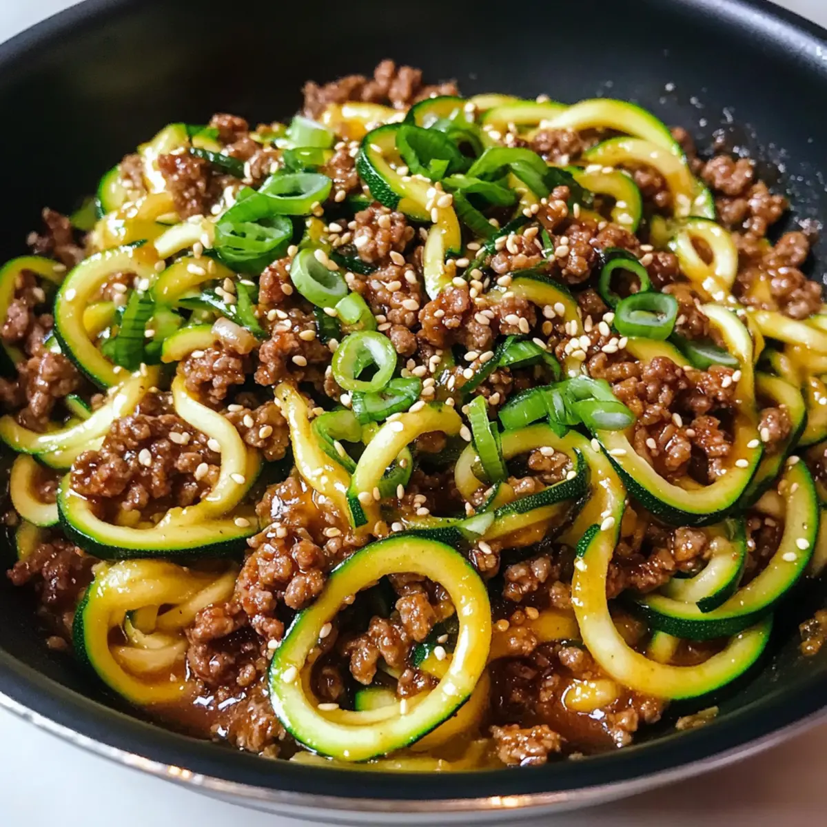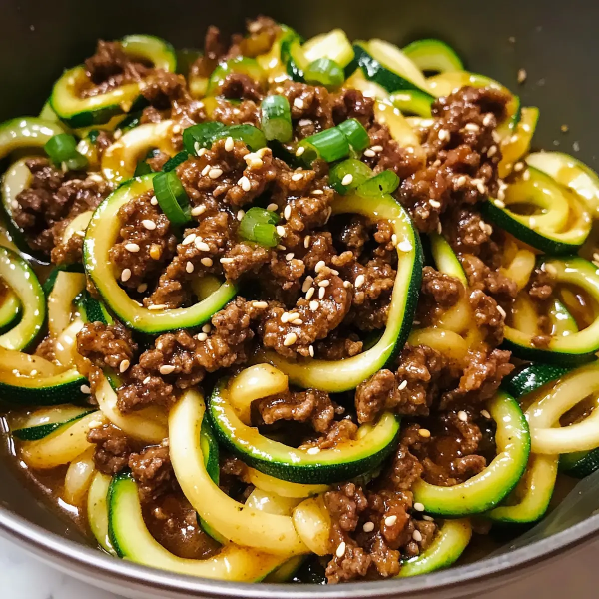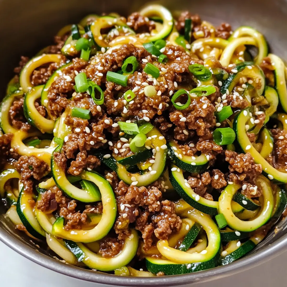 Es war ein hektischer Dienstagabend, und ich war auf der Suche nach einer schnellen, aber dennoch schmackhaften Lösung für das Abendessen. Plötzlich kam mir die Idee: Würzige koreanische Rindfleisch-Zucchini-Nudeln! Diese köstliche Kombination aus zarten Zucchini-Nudeln und herzhaftem Rindfleisch in einer aromatischen koreanischen Marinade zaubert nicht nur ein Lächeln auf unser Gesicht, sondern kommt auch in nur 20 Minuten auf den Tisch. Perfekt für alle, die vom Fast-Food-Alltag genug haben! Und während wir uns über diese gesunde, kohlenhydratarme Alternative freuen, bleibt genügend Energie für alles andere am Abend. Neugierig, wie man dieses blitzschnelle Rezept zubereitet? Lass uns gemeinsam eintauchen! Warum sind diese Zucchini-Nudeln besonders? Gesundheitseinfach: Dank der Zucchini-Nudeln ist dieses Gericht nicht nur kohlenhydratarm, sondern auch voller Vitamine. Schnell zubereitet: In nur 20 Minuten steht das Gericht auf dem Tisch – ideal für hektische Abende! Aromatischer Genuss: Die Kombination aus Rindfleisch und würziger koreanischer Sauce sorgt für ein unvergleichbares Geschmackserlebnis. Vielseitig: Du kannst die Zucchini-Nudeln leicht durch andere Gemüse-Nudeln ersetzen, um neue Geschmäcker zu entdecken. Perfekte Mahlzeit: Ob für die Familie oder Freunde – diese köstlichen Rindfleisch-Zucchini-Nudeln zaubern jedem ein Lächeln ins Gesicht. Gesunde Alternative: Statt Fast Food bieten diese Nudeln eine leichte und belebende Lösung, die zufriedenstellt. Zutaten für würzige koreanische Rindfleisch-Zucchini-Nudeln • Für eine schnelle und gesunde Mahlzeit! Rindfleisch – Mageres Rindfleisch ist die Hauptproteinzufuhr und sorgt für eine herzhafte Basis. Zucchini – Zucchiniunge eignet sich hervorragend als kohlenhydratarmer Nudelersatz; wähle frische, feste Zucchini für den besten Biss. Sojasauce – Sie verleiht dem Gericht seinen herzhaften Umami-Geschmack; bei Bedarf kann glutenfreie Sojasauce verwendet werden. Brauner Zucker – Sorgt für die süße Note in der Sauce; alternativ kannst du auch Honig oder einen Zuckerersatz nutzen. Ingwer – Fügt eine aromatische Tiefe hinzu; frisch geriebener Ingwer ist ideal, während gemahlener Ingwer als Notlösung dient. Sesamöl – Verleiht einen nussigen Geschmack; kann bei Bedarf durch Pflanzenöl ersetzt werden. Sriracha – Gibt dem Gericht die nötige Schärfe – nach Belieben anpassen oder durch Chilipaste austauschen. Knoblauch – Intensiviert den Geschmack; frische Knoblauchzehen sind am besten, aber Knoblauchpulver kann auch verwendet werden. Frühlingszwiebeln – Fügen nicht nur Geschmack hinzu, sondern dienen auch als hübsche Garnitur; Schnittlauch kann als Ersatz dienen. Genieße diese würzigen koreanischen Rindfleisch-Zucchini-Nudeln, die in weniger als 20 Minuten auf dem Tisch stehen! Schritt-für-Schritt-Anleitung für würzige koreanische Rindfleisch-Zucchini-Nudeln Step 1: Sauce zubereiten In einer kleinen Schüssel vermischst du den braunen Zucker, die Sojasauce, den Ingwer, das Sesamöl und die Sriracha. Rühre gut um, bis der Zucker vollständig aufgelöst ist, und stelle die Sauce beiseite. Diese aromatische Mischung wird der Hauptgeschmacksträger deiner würzigen koreanischen Rindfleisch-Zucchini-Nudeln sein. Step 2: Rindfleisch anbraten Erhitze in einer großen Pfanne bei mittlerer bis hoher Temperatur etwas Olivenöl. Füge den gehackten Knoblauch hinzu und brate ihn ca. 1 Minute lang an, bis er duftet. Gib das mageres Rindfleisch hinein und brate es unter ständigem Zerteilen für etwa 3-5 Minuten, bis es gut durchgebraten und goldbraun ist. Lasse überschüssiges Fett abtropfen. Step 3: Zutaten kombinieren Gib die Zucchini-Nudeln in die Pfanne zu dem bereits gebratenen Rindfleisch. Gieße die vorbereitete Sauce darüber und vermische alles gut. Koche die Mischung für etwa 2 Minuten, bis die Zucchini-Nudeln zart, aber noch leicht knackig sind. Achte darauf, die Zucchini nicht zu überkochen, um die perfekte Textur zu erhalten. Step 4: Servieren Sofort anrichten und die würzigen koreanischen Rindfleisch-Zucchini-Nudeln auf Tellern anrichten. Garniere das Gericht nach Belieben mit geröstetem Sesam und fein geschnittenen Frühlingszwiebeln. Das Gericht sollte warm serviert werden, damit die Aromen optimal zur Geltung kommen. Was passt gut zu würzigen koreanischen Rindfleisch-Zucchini-Nudeln? Mit diesen köstlichen Zucchini-Nudeln bringst du Vielfalt auf den Tisch und zauberst ein vollwertiges Menü, das begeistert. Gedämpfter Edamame: Diese proteinreiche Beilage ist eine gesunde Ergänzung und bietet einen sanften Kontrast zu den würzigen Nudeln. Frischer Gurkensalat: Ein erfrischender Salat mit Reisessig bietet eine leichte Säure, die die Schärfe der Nudeln perfekt ausgleicht. Er ist knackig und angenehm kühl. Reisteigrollen: Diese kleinen, gefüllten Rollen sind leicht und aromatisch. Sie passen wunderbar zu den Rindfleisch-Zucchini-Nudeln und steigern das Sushi-Feeling. Grüner Tee: Ein leicht bitterer grüner Tee kann die reichhaltigen Geschmäcker der Nudeln ausbalancieren und sorgt gleichzeitig für ein gesundes Getränk. Kokoscreme-Dessert: Ein leichtes, cremiges Dessert mit Kokosnuss und Früchten bildet einen süßen Abschluss zum herzhaften Hauptgericht und rundet das Menü ab. Diese Kombinationen sorgen dafür, dass deine leckeren würzigen koreanischen Rindfleisch-Zucchini-Nudeln zu einem unvergesslichen Abendessen werden! Expertentipps für würzige koreanische Rindfleisch-Zucchini-Nudeln Zucchini nicht überkochen: Halte die Kochzeit auf 2-3 Minuten beschränkt, um die perfekte Textur der Zucchini-Nudeln zu gewährleisten und ein matschiges Ergebnis zu vermeiden. Rindfleisch gut anbraten: Brate das Rindfleisch bis es goldbraun ist, damit sich die Aromen entfalten und du ein zartes, schmackhaftes Ergebnis erhältst. Sauce gut vermischen: Achte darauf, die Sauce gleichmäßig über die Zucchini-Nudeln und das Rindfleisch zu verteilen, damit jede Gabel v