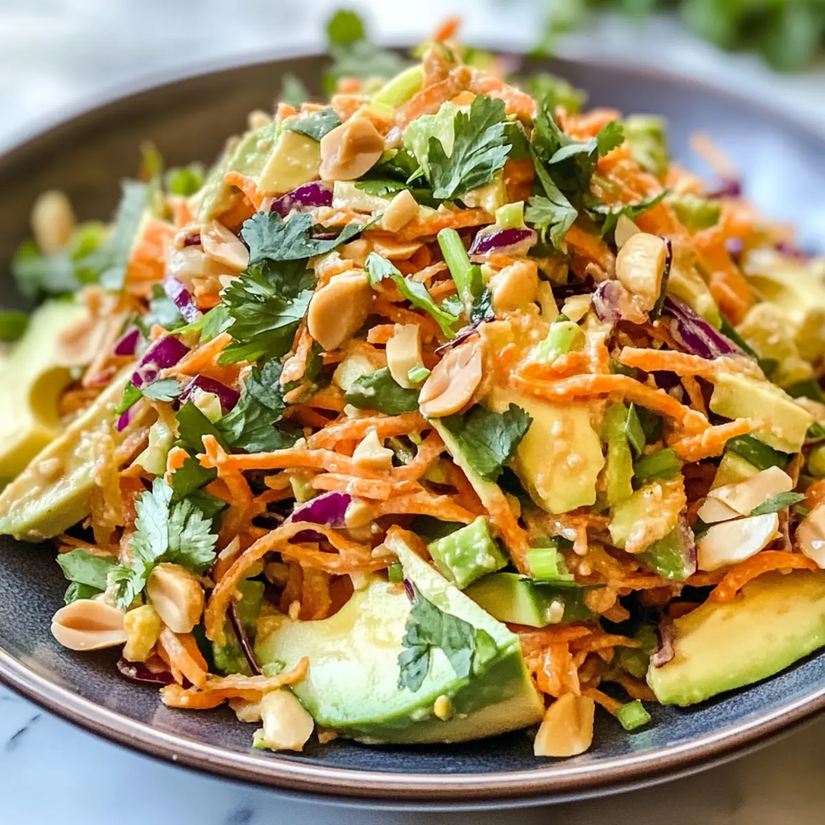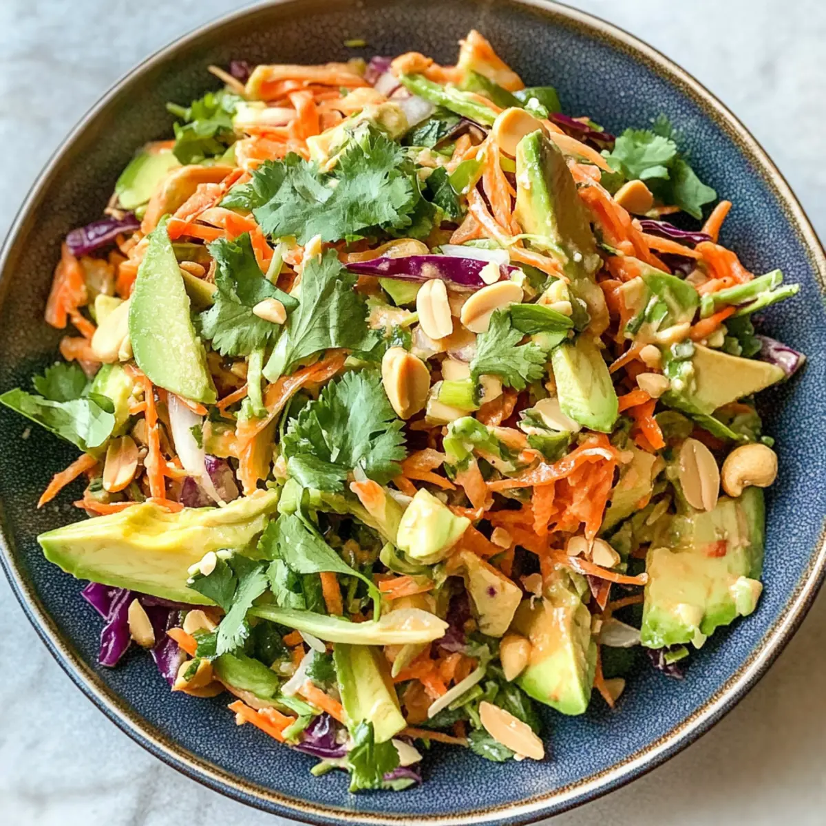 Eines Nachmittags in der Sommerhitze, während ich frischen Salat zubereitete, entstand eine köstliche Idee: der Zerfetzte Thai-Salat mit Avocado. Diese farbenfrohe und knackige Mischung aus Gemüse vereint alles, was wir an leichten Sommergerichten lieben. Er schmeckt nicht nur fantastisch, sondern ist auch schnell und einfach zuzubereiten – perfekt für stressige Tage oder gesellige Grillabende. Mit der Cremigkeit der Avocado und einem lebendigen Dressing wird dieser Salat zu einem echten Hit auf jeder Tischrunde. Auch als Meal Prep-Freund bietet er die Flexibilität, die wir alle suchen. Was könnte besser sein, als sich mit einer Temporeihe von Aromen unter dem Sonnenlicht zu erfrischen? Lassen Sie uns gemeinsam die Zutaten entdecken und diesen Genuss zubereiten! Warum lieben Sie diesen Sommer-Salat? Frische Aromen: Dieser Zerfetzte Thai-Salat mit Avocado bietet eine erfrischende Mischung aus knackigem Gemüse und cremiger Avocado, perfekt für heiße Tage. Einfachheit: Mit nur wenigen Zutaten ist dieser Salat schnell und mühelos zuzubereiten. Ideal für alle, die in der Küche nicht viel Zeit haben! Vielfältige Anpassungsmöglichkeiten: Erweitern Sie Ihren Salat mit Proteinen wie gegrilltem Hähnchen oder Tofu für eine vollwertige Mahlzeit. Perfekt für Meal Prep: Bereiten Sie diesen Salat im Voraus vor und genießen Sie die Aromen über mehrere Tage hinweg. Gesunde Wahl: Vollgepackt mit Vitaminen und gesunden Fetten ist dieser Salat nicht nur köstlich, sondern auch nahrhaft. Wenn Sie nach weiteren leckeren Rezepten suchen, probieren Sie unser Zitronenbutterlachs mit Kartoffeln oder ein Brokkolicurry mit roten Linsen. Zutaten für Zerfetzten Thai-Salat mit Avocado • Perfekt für jeden Sommer! Für den Salat Zerfetzter grüner Kohl – sorgt für eine knackige Textur und reichlich Volumen. Geriebene Karotten – bringen Süße und Farbe ins Spiel. Rote Paprika – bietet eine süße Note und lebendige Farbe. Frühlingszwiebeln – verleihen einen milden, frischen Zwiebelgeschmack. Frischer Koriander – fügt ein aromatisches, Kräuteraroma hinzu. Reife Avocado – sorgt für Cremigkeit und gesunde Fette. Geröstete Erdnüsse – bringen eine knusprige Textur und nussigen Geschmack. Für das Dressing Fischsoße – liefert Umami und Salzigkeit, ideal für einen authentischen Geschmack. Frisch gepresster Limettensaft – sorgt für die nötige Säure und Ausgewogenheit. Zucker – harmonisiert die Säure im Dressing. Sriracha-Soße – fügt Schärfe und Komplexität hinzu. Genießen Sie diesen Zerfetzten Thai-Salat mit Avocado als frische und köstliche Wahl, perfekt für die heißen Tage! Schritt-für-Schritt-Anleitung für Zerfetzter Thai-Salat mit Avocado Step 1: Gemüse vorbereiten Den zerfetzten grünen Kohl grob schneiden und in eine große Schüssel geben. Die Karotten mit einer Reibe fein reiben und zur Schüssel hinzufügen. Die rote Paprika in dünne Streifen schneiden und zusammen mit den gewaschenen und in Ringe geschnittenen Frühlingszwiebeln zu den Gemüsesorten geben. Alles gut vermengen, bis die Farben lebhaft strahlen. Step 2: Dressing zubereiten In einer kleinen Schüssel Fischsoße, frisch gepressten Limettensaft, Zucker und Sriracha-Soße gut verrühren. Nutzen Sie entweder einen Schneebesen oder Gabel, um das Dressing gut zu emulgieren, bis der Zucker vollständig aufgelöst ist. Probieren Sie es und passen Sie gegebenenfalls die Gewürze an, um die perfekte Balance zu erreichen. Step 3: Alles vermischen In die große Schüssel mit dem Gemüse die gehackten Korianderblätter und die gerösteten Erdnüsse hinzufügen. Gießen Sie das vorbereitete Dressing über die Mischung und nutzen Sie zwei Gabeln oder große Löffel, um alles vorsichtig zu vermengen. Stellen Sie sicher, dass das Gemüse gleichmäßig mit dem Dressing überzogen ist und die Farben lebhaft zur Geltung kommen. Step 4: Avocado hinzufügen Die reife Avocado halbieren, den Kern herausnehmen und das Fruchtfleisch in Würfel schneiden. Die gewürfelte Avocado vorsichtig unter den Salat heben, um sie nicht zu zerdrücken. Damit bleibt die Cremigkeit der Avocado erhalten und bringt eine zusätzliche Dimension in den Zerfetzten Thai-Salat mit Avocado. Step 5: Vor dem Servieren kühlen Den Salat mit Frischhaltefolie abdecken und für etwa 15-30 Minuten in den Kühlschrank stellen. Diese kurze Kühlzeit ermöglicht es den Aromen, sich zu vermischen, und sorgt dafür, dass der Salat frisch und knackig bleibt. Danach ist der Salat bereit für eine erfrischende Servierumgebung. Expertentipps für Zerfetzten Thai-Salat mit Avocado Frische Zutaten: Verwenden Sie möglichst frische Zutaten, um den besten Geschmack und die knackigste Textur zu erzielen. Vermeiden Sie weiche oder faulige Gemüse, die den Salat verderben könnten. Dressings proc*ess: Achten Sie darauf, das Dressing gut zu mischen, dass der Zucker vollständig aufgelöst ist. So entsteht das ideale Geschmackserlebnis für Ihren Zerfetzten Thai-Salat mit Avocado. Avocado zuletzt: Fügen Sie die Avocado erst kurz vor dem Servieren hinzu, um ihre Cremigkeit und Farbe zu bewahren. Dies verhindert, dass sie matschig wird. Variationen ausprobieren: Scheuen Sie sich nicht, verschiedene Gemüse oder Nüsse auszuprobieren. Zum Beispiel können Mandeln oder Cashews eine köstliche Variation zu den Erdnüssen bieten. Kühlung: Lassen Sie den Salat vor dem Servieren im Kühlschrank ruhen, um die Aromen zu intensivieren und ihn besonders erfrischend zu machen. Variationen & Alternativen für Zerfetzten Thai-Salat mit Avocado Lassen Sie Ihrer Kreativität freien Lauf und passen Sie diesen Zerfetzten Thai-Salat mit Avocado nach Ihrem Geschmack an! Protein-Power: Fügen Sie gegrilltes Hähnchen oder marinierten Tofu hinzu, um dem Salat einen herzhaften Protein-Kick zu geben. Dieses einfache Upgrade macht den Salat noch sättigender. Tropische Note: Ersetzen Sie die Avocado durch frische Mango, um eine süße, fruchtige Wendung zu erzielen. Der Geschmack d