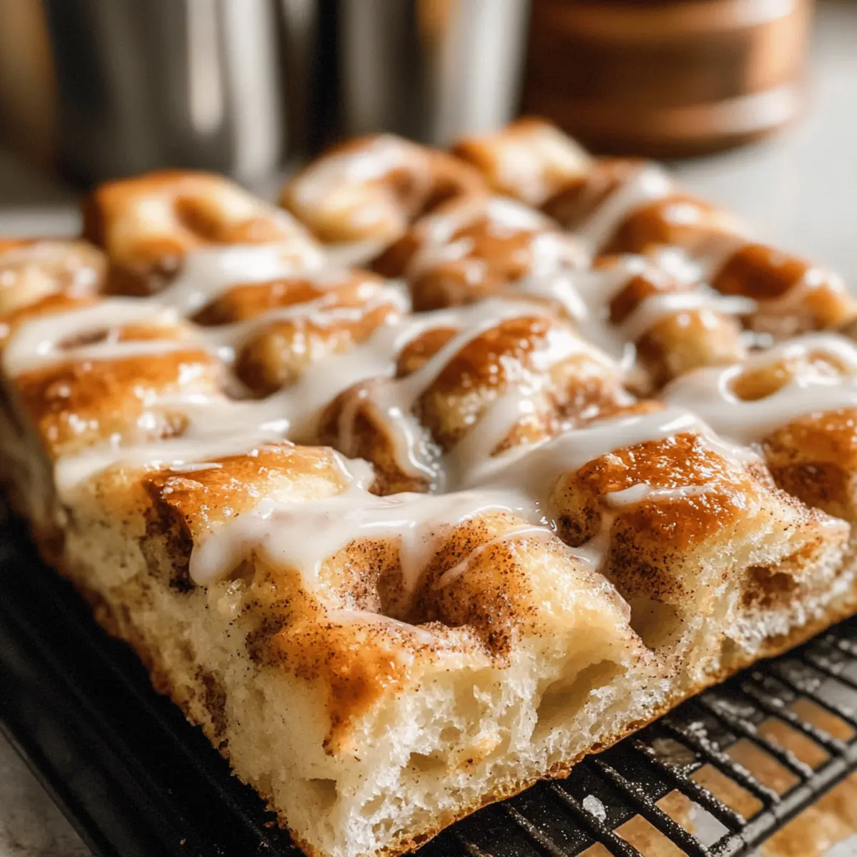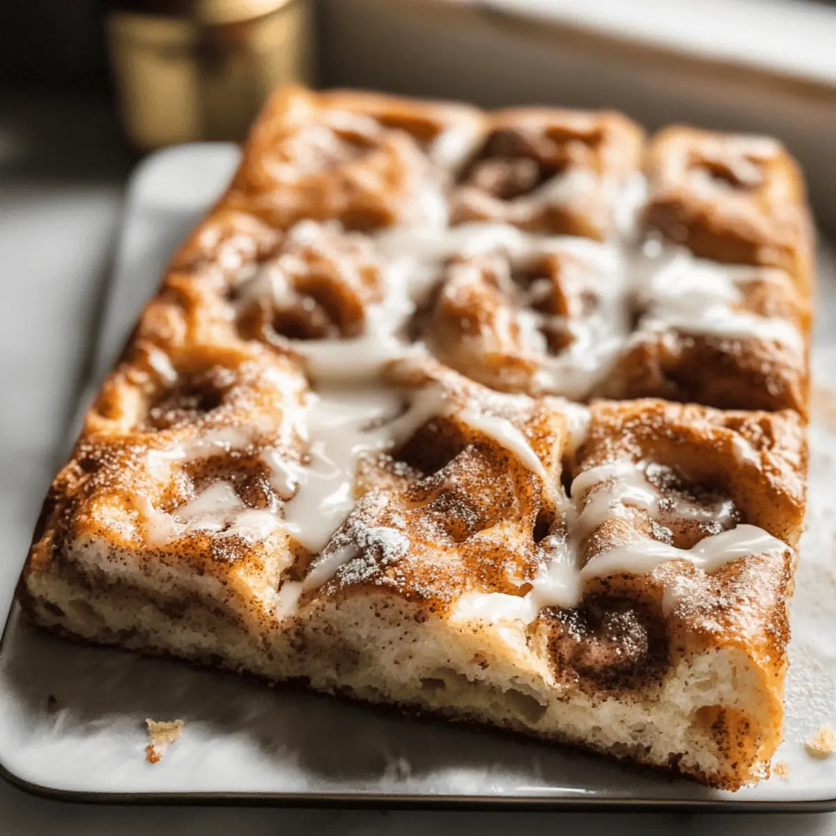 Die warme, duftende Luft in meiner Küche weckte sofort Kindheitserinnerungen an den Sonntagmorgen, als meine Mutter ihre legendären Zimtschnecken buk. Heute lade ich euch ein, diese Aromen neu zu erleben – mit meiner Zimt-Focaccia! Diese köstliche Kombination aus fluffigem Teig und aromatischer Zimtfüllung ist nicht nur ein Genuss für die Sinne, sondern auch die perfekte Lösung für alle, die sich nach einem raffinierten, aber unkomplizierten Gebäck sehnen. Die Zimt-Focaccia besticht durch ihre knusprigen Ränder und das verlockende, karamellisierte Zimt-Zucker-Muster, das beim Backen entsteht. Außerdem wird sie wunderbar von einem glatten Vanillezauber gekrönt, der jedem Bissen eine Extraportion Freude verleiht. Bereit, euren Liebsten oder euch selbst eine Freude zu machen? Lasst uns gemeinsam backen! Warum wirst du dieses Rezept lieben? Einfachheit: Mit nur wenigen Grundzutaten zauberst du im Handumdrehen eine luftige Zimt-Focaccia, die genauso gut wie Zimtschnecken schmeckt. Aromatische Vielfalt: Die Kombination aus Zimt und karamellisiertem Zucker erfüllt deine Küche mit einem verführerischen Duft, der Erinnerungen weckt. Vielseitig einsetzbar: Ob zum Frühstück, als Dessert oder für einen Brunch—diese Focaccia passt immer und begeistert garantiert deine Gäste. Zeitsparend: Durch die langen Ruhezeiten im Kühlschrank entfällt der Stress; du kannst die Focaccia einfach vorbereiten und sie entfaltet ihren Geschmack ganz von selbst. Besondere Note: Der braune Butter-Zucker-Topping gibt dieser Focaccia einen einzigartigen, nussigen Geschmack, den du nicht verpassen möchtest. Teile den Genuss: Dieses Rezept ist perfekt zum Teilen, denn die Zimt-Focaccia hat nicht nur ein tolles Aussehen, sondern schmeckt auch phänomenal—ideal für jede Feier! Zimt-Focaccia Zutaten • Verwandele einfache Zutaten in eine himmlische Zimt-Focaccia! Warmwasser: – Aktiviert die Hefe für den Teig, etwa 43°C bringt die besten Ergebnisse. Aktive Trockenhefe: – Sorgt für das Aufgehen des Teigs und ist entscheidend für die luftige Textur. Zucker: – Nährt die Hefe und balanciert den Geschmack; kann durch Honig ersetzt werden. Brotmehl: – Gibt Struktur und Biss; kann durch Allzweckmehl ersetzt werden, aber die Textur variiert. Salz: – Verleiht Geschmack und kontrolliert die Hefeaktivität. Olivenöl: – Sorgt für Feuchtigkeit und Reichtum; kann durch geschmolzene Butter ersetzt werden. Ungesalzene Butter: – Wird zum Fetten und für den Geschmack im Teig und Belag verwendet; ungesalzen ist wichtig für die Kontrolle des Salzgehalts. Braune Butter (für den Belag): – Verleiht einen nussigen Geschmack. Sie ist entscheidend für die Karamellisierung des Zuckers – nicht weglassen! Hellbrauner Zucker: – Süßt den Belag und trägt zur Karamellisierung bei; kann durch dunkelbraunen Zucker für mehr Geschmack ersetzt werden. Zimt: – Sorgt für das charakteristische Zimt-Aroma; passe die Menge nach persönlichem Geschmack an. Puderzucker (für das Zuckerguss): – Sorgt für Süße und eine glatte Textur im Zuckerguss; verwende gesiebten für die besten Ergebnisse. Vanilleextrakt: – Verstärkt den Geschmack des Zuckergusses; kann durch Mandel-Extrakt für eine andere Note ersetzt werden. Milch: – Passt die Konsistenz des Zuckergusses an; jede Milch oder pflanzliche Alternative funktioniert. Schritt-für-Schritt-Anleitung für Zimt-Focaccia Step 1: Hefe aktivieren Vermische in einer Schüssel warmes Wasser (ca. 43°C) mit dem Zucker und streue die aktive Trockenhefe darüber. Lass die Mischung etwa 10–15 Minuten stehen, bis sie schaumig wird. Dieser Schritt ist wichtig, damit die Hefe aktiviert wird und der Teig später gut aufgeht. Step 2: Teig mischen In einer großen Schüssel das Brotmehl und Salz miteinander vermengen. Füge nun die Hefe-Mischung und das Olivenöl hinzu. Verrühre alles gut, bis sich ein klebriger Teigball bildet. Bedecke den Teig leicht mit Olivenöl und forme in der Schüssel eine glatte Oberfläche. Step 3: Erste Ruhephase Decke die Schüssel mit einem sauberen Küchentuch ab und stelle sie in den Kühlschrank. Lass den Teig mindestens 12 Stunden ruhen, damit er gut aufgeht und sein Volumen vergrößert. Diese lange Ruhezeit sorgt für eine bessere Textur und mehr Geschmack in deiner Zimt-Focaccia. Step 4: Zweite Ruhephase Fette eine 9×13-Zoll große Backform mit geschmolzener Butter. Nimm den Teig aus dem Kühlschrank, drücke ihn leicht zusammen, um die Luft herauszulassen, und lege ihn in die vorbereitete Form. Decke ihn wieder ab und lasse ihn bei Raumtemperatur für 1,5 bis 2 Stunden gehen, bis er sichtbar aufgeht. Step 5: Braune Butter vorbereiten Erhitze in einem kleinen Topf ungesalzene Butter bei mittlerer Hitze, bis sie goldbraun und nussig wird. Dieser Vorgang dauert etwa 5-8 Minuten. Achte darauf, die Butter nicht zu verbrennen. Lass sie dann 10 Minuten abkühlen, bevor du sie weiter verwendest. Step 6: Zimt-Topping zubereiten Mische in einer Schüssel den hellbraunen Zucker und Zimt mit der abgekühlten braunen Butter, bis der Zucker vollständig aufgelöst ist. Diese Mischung wird die charakteristische Füllung für die Zimt-Focaccia und sorgt für einen köstlichen Geschmack. Step 7: Teig für das Backen vorbereiten Heize den Ofen auf 230°C vor. Verwende nasse Finger, um tiefe Dellen in den aufgegangenen Teig zu machen. Gieße das Zimt-Butter-Topping gleichmäßig über den Teig, sodass die Dellen gut gefüllt sind. Dadurch wird die Focaccia während des Backens aromatisch und karamellisiert. Step 8: Focaccia backen Backe die Zimt-Focaccia für 20–25 Minuten im vorgeheizten Ofen, bis sie goldbraun und knusprig ist. Überprüfe die Unterseite, sie sollte fest und leicht gebräunt sein. Lass die Focaccia nach dem Backen 10 Minuten in der Form abkühlen. Step 9: Mit Zuckerguss vollenden Mische in einer Schüssel Puderzucker, Milch und Vanilleextrakt, bis eine glatte Konsistenz entsteht. Träufle den Zuckerguss über die noch warme