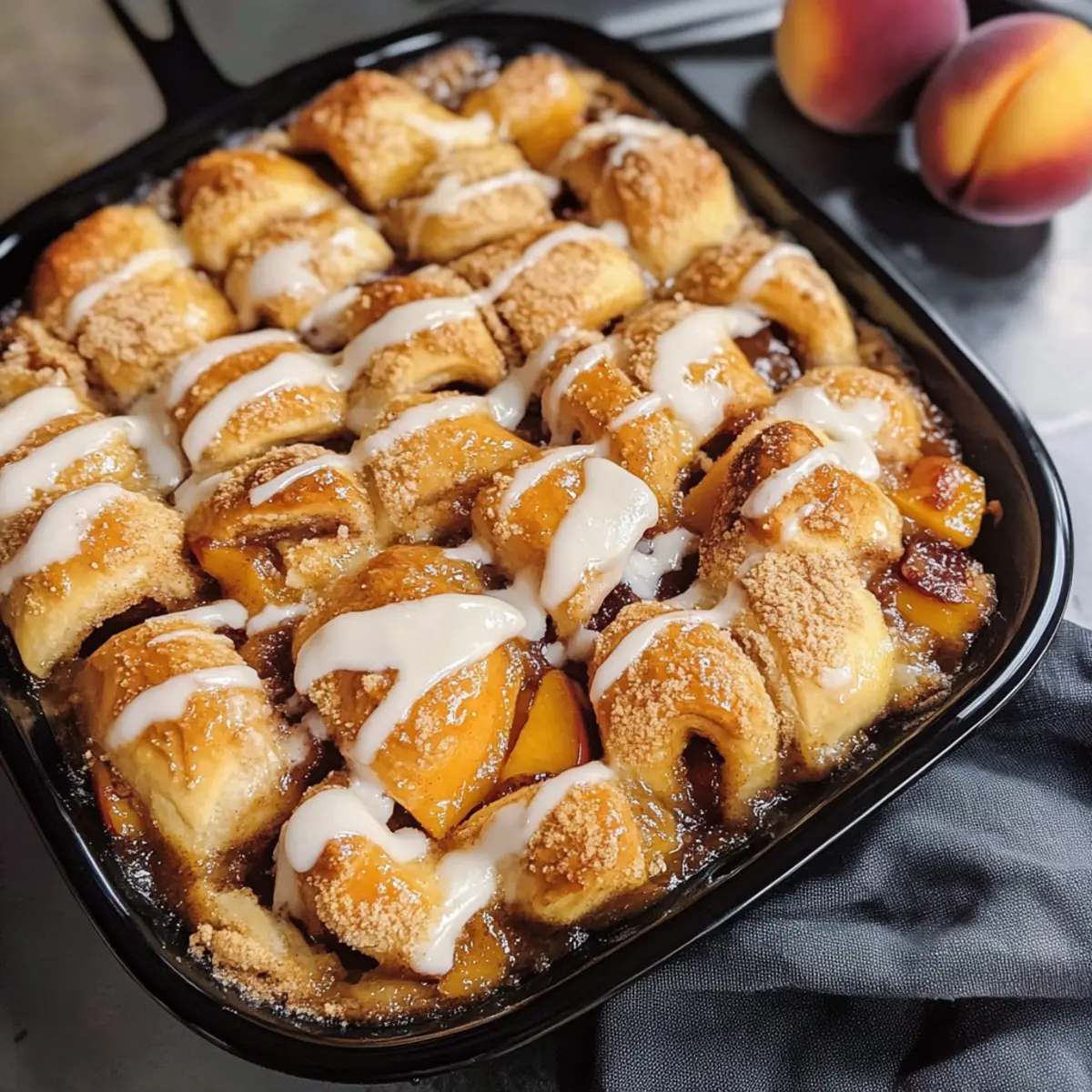 Es gibt nichts Schöneres, als an einem warmen Sommertag in die Küche zu gehen und den verlockenden Duft von frisch gebackenen Zimtschnecken-Pfirsich-Cobbler zu genießen. Dieses Rezept vereint saftige Pfirsiche und weiche, klebrige Zimtschnecken zu einem ultimativen Genuss, der perfekt für Frühstück, Brunch oder ein köstliches Dessert geeignet ist. Die Zubereitung ist blitzschnell, sodass du in weniger als einer Stunde mit minimalem Aufwand ein Gericht kreieren kannst, das sowohl das Herz als auch den Gaumen erwärmt. Mit jedem Bissen erlebst du eine harmonische Mischung aus warmen, gewürzten Pfirsichen und zarter Zuckerglasur. Bist du bereit, deinen Gästen diese süße Sommerfreude zu präsentieren? Warum ist dieser Zimtschnecken-Pfirsich-Cobbler einzigartig? Einfachheit: Die Zubereitung ist so unkompliziert, dass du in kurzer Zeit einen köstlichen Dessert-Klassiker zaubern kannst. Fruchtige Frische: Die Kombination aus saftigen Pfirsichen und warmen Zimtschnecken bringt den Sommer auf deinen Teller. Vielfältig: Perfekt als Frühstück, Brunch oder nachmittäglicher Snack – er passt zu jedem Anlass. Aromatische Mischung: Das Zusammenspiel von Zimt, Vanille und frischen Früchten vereint sich zu einem unwiderstehlichen Duft, der deine Gäste verzücken wird. Zeitersparnis: In weniger als einer Stunde hast du dieses leckere Gericht servierbereit, sodass du mehr Zeit mit deinen Liebsten verbringen kannst. Möglicherweise möchtest du auch das Rezept für selbstgemachte Zimtschnecken ausprobieren, um eine noch reichhaltigere Geschmackserfahrung zu erzielen! Zutaten für Zimtschnecken-Pfirsich-Cobbler • Dies sind die Zutaten, die du benötigst, um diesen köstlichen Zimtschnecken-Pfirsich-Cobbler zuzubereiten. Für die Pfirsichfüllung Pfirsiche – Saftige Süße und Textur; verwende reife Pfirsiche für das beste Aroma. Brauner Zucker – Fügt tiefen Süßgeschmack mit Karamellnote hinzu; kokosnusszucker kann eine gesündere Alternative sein. Zucker – Liefert zusätzliche Süße; kann nach Wunsch reduziert werden. Maisstärke – Verdickt die Pfirsichfüllung; Pfeilwurzelpulver kann ein Ersatz sein. Vanilleextrakt – Verstärkt den Geschmack; verwende reinen Vanilleextrakt für die besten Ergebnisse. Zimt – Bringt Wärme und Gewürz; kann nach Geschmack angepasst werden. Koscheres Salz – Balanciert die Süße; Meersalz kann verwendet werden, wenn gewünscht. Muskatnuss – Fügt eine warme Gewürznote hinzu; kann weggelassen werden, wenn nicht gewünscht. Kardamom – Verleiht eine einzigartige Geschmacksnote; kann durch mehr Zimt ersetzt werden. Zitronensaft – Beleuchtet den Pfirsichgeschmack; Limettensaft kann ebenfalls Verwendung finden. Für den Cobbler Zimtschnecken – Basis des Rezepts, sorgt für Struktur und Süße; verwende rohe, im Laden gekaufte Zimtschnecken für Bequemlichkeit. Ungesalzene Butter – Erhöht den Reichtum; sorgt dafür, dass sie Zimmertemperatur hat für einfaches Mischen. Pekannüsse – Optional für zusätzlichen Crunch; können weggelassen oder durch Walnüsse ersetzt werden. Für die Glasur Frischkäse – Fügt Cremigkeit hinzu; verwende die Glasur zum Frühstück oder Vanilleeis zum Dessert. Puderzucker – Süßt die Glasur; kann nach Geschmack reduziert werden. Jetzt hast du alles, was du brauchst, um deinen Zimtschnecken-Pfirsich-Cobbler zu zaubern! Schritt-für-Schritt-Anleitung für Zimtschnecken-Pfirsich-Cobbler Schritt 1: Ofen vorheizen Heize den Ofen auf 175 °C (350 °F) vor. Dies ist der erste Schritt zur Zubereitung deines köstlichen Zimtschnecken-Pfirsich-Cobblers. Das Vorheizen sorgt dafür, dass jede Schicht gleichmäßig gebacken wird, sodass die Zimtschnecken goldbraun und die Pfirsichfüllung schön blubbernd wird, sobald sie fertig sind. Schritt 2: Pfirsichfüllung zubereiten In einer großen Schüssel vermengst du die in Scheiben geschnittenen Pfirsiche mit braunem Zucker, Zucker, Maisstärke, Vanilleextrakt, Zimt, Salz, Muskatnuss, Kardamom und Zitronensaft. Mische alles gut durch, bis die Pfirsiche gleichmäßig mit der süßen, würzigen Mischung bedeckt sind. Dies sollte etwa 5 Minuten dauern, um die Aromen perfekt zu vereinen. Schritt 3: Pfirsichfüllung in die Backform geben Übertrage die gut vermischte Pfirsichfüllung in eine 23 cm große gusseiserne Pfanne oder eine ähnliche Auflaufform. Achte darauf, die Füllung gleichmäßig zu verteilen, damit jeder Bissen deines Zimtschnecken-Pfirsich-Cobblers voller saftiger Pfirsiche ist. Schritt 4: Zimtschnecken vorbereiten Schneide die rohen Zimtschnecken in kleine Stücke. Diese Stücke verteilst du gleichmäßig auf der obersten Schicht der Pfirsichfüllung. Wenn gewünscht, streue einige geröstete Pekannüsse darüber und setze kleine Stücke von der weichen Butter darauf. Dadurch erhält dein Cobbler eine zusätzliche köstliche Textur. Schritt 5: Backen Jetzt ist es an der Zeit, deinen Zimtschnecken-Pfirsich-Cobbler in den vorgeheizten Ofen zu schieben. Backe ihn für 40-45 Minuten, bis die Zimtschnecken goldbraun und die Füllung rundherum blubbernd ist. Halte Ausschau nach einem schönen goldenen Farbton auf den Zimtschnecken, um sicherzustellen, dass sie perfekt gebacken sind. Schritt 6: Frischkäseglasur vorbereiten Während der Cobbler backt, kannst du die Frischkäseglasur zubereiten. Schlage den Frischkäse und die Butter in einer Schüssel etwa 3-5 Minuten lang, bis die Mischung schön glatt und cremig ist. Mische dann den Vanilleextrakt, Puderzucker und Prise Salz unter, bis die Glasur leicht und fluffig ist. Schritt 7: Servieren Nimm den Zimtschnecken-Pfirsich-Cobbler aus dem Ofen und lasse ihn kurz abkühlen. Serviere ihn warm, indem du großzügig die Frischkäseglasur darüber träufelst oder ihn mit einer Kugel Vanilleeis kombinierst. Dieser süße Genuss wird deine Gäste begeistern und ist perfekt für jeden Anlass. Variationen für Zimtschnecken-Pfirsich-Cobbler Entdecke, wie du dein Rezept individuell anpassen kannst, um noch mehr Ge