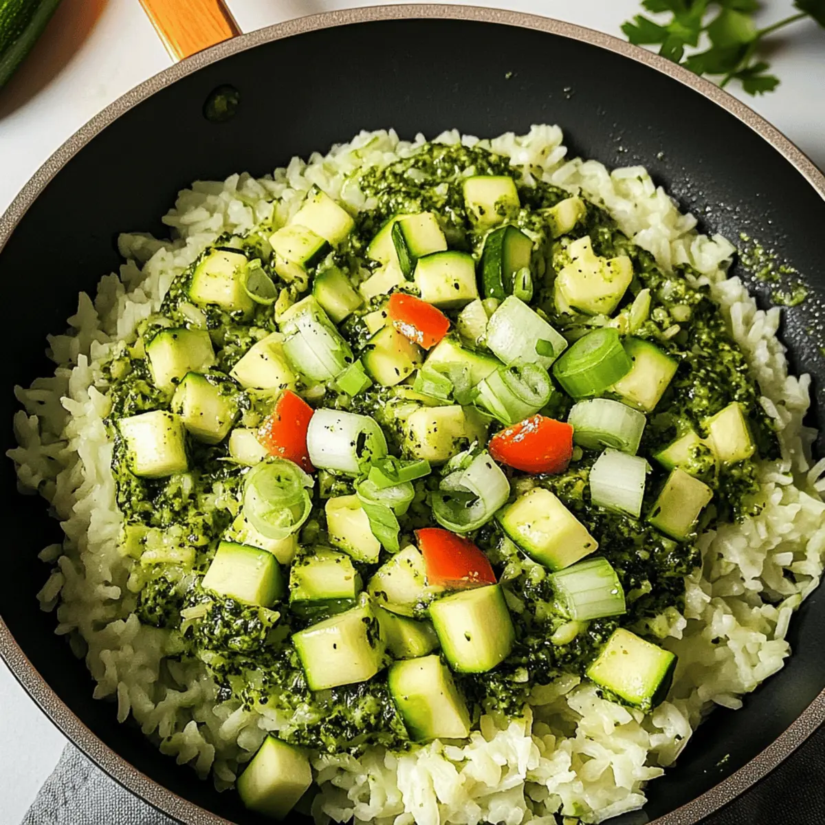 Zucchini-Pfanne mit Reis – veganes Pesto-Highlight