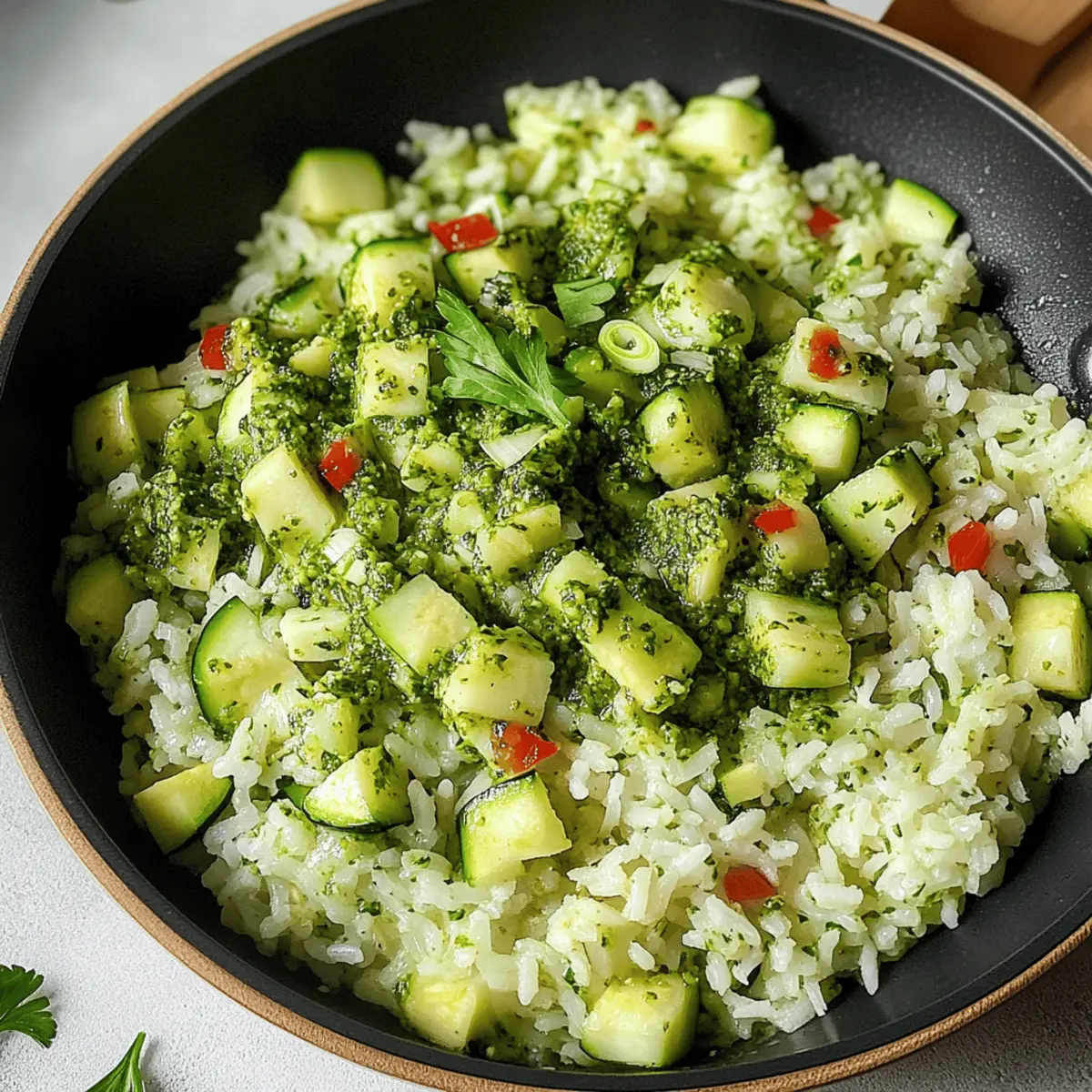 Diese Zucchini-Pfanne mit Reis ist ein veganes One Pot Rezept mit Pesto, das einfach zuzubereiten und voller Aromen ist.